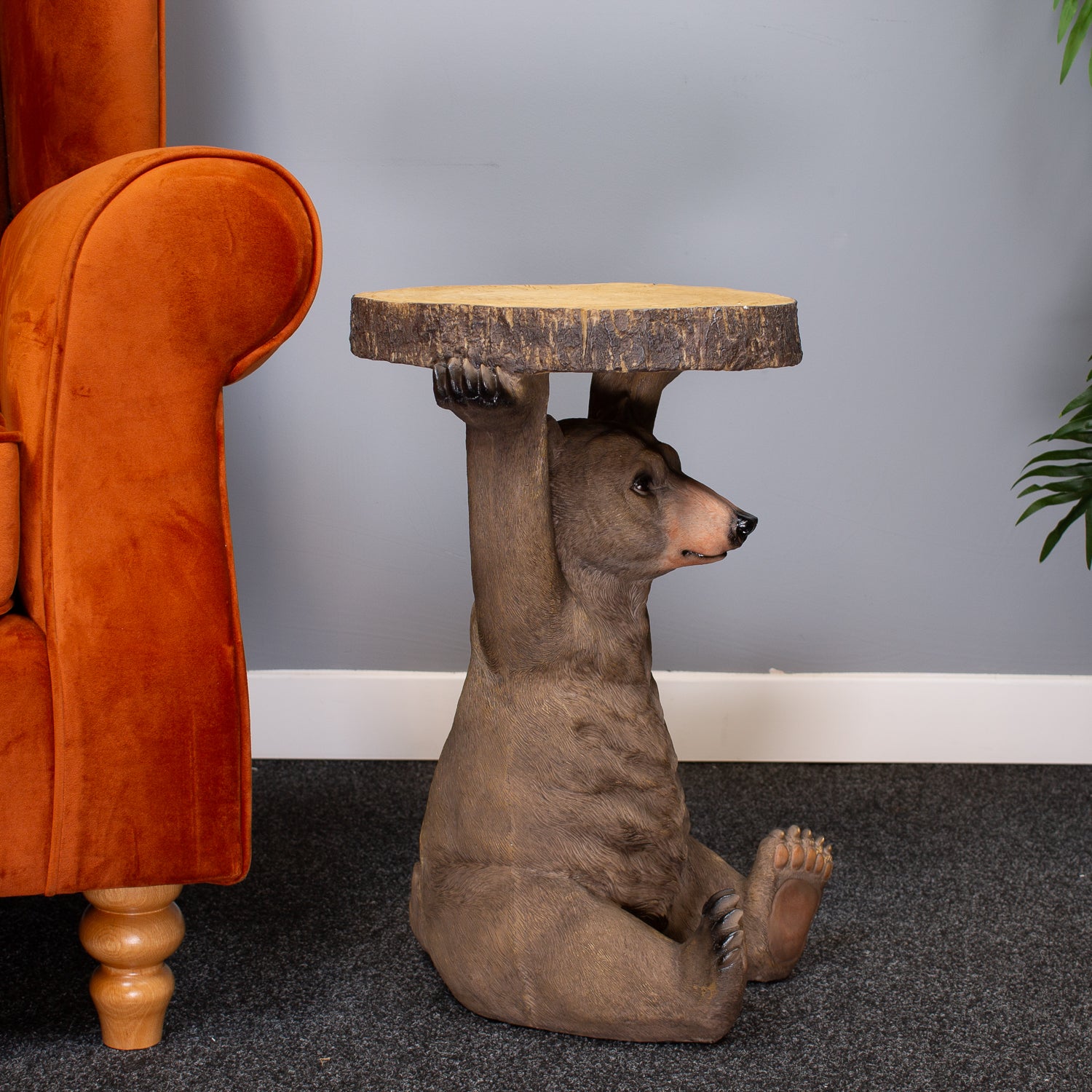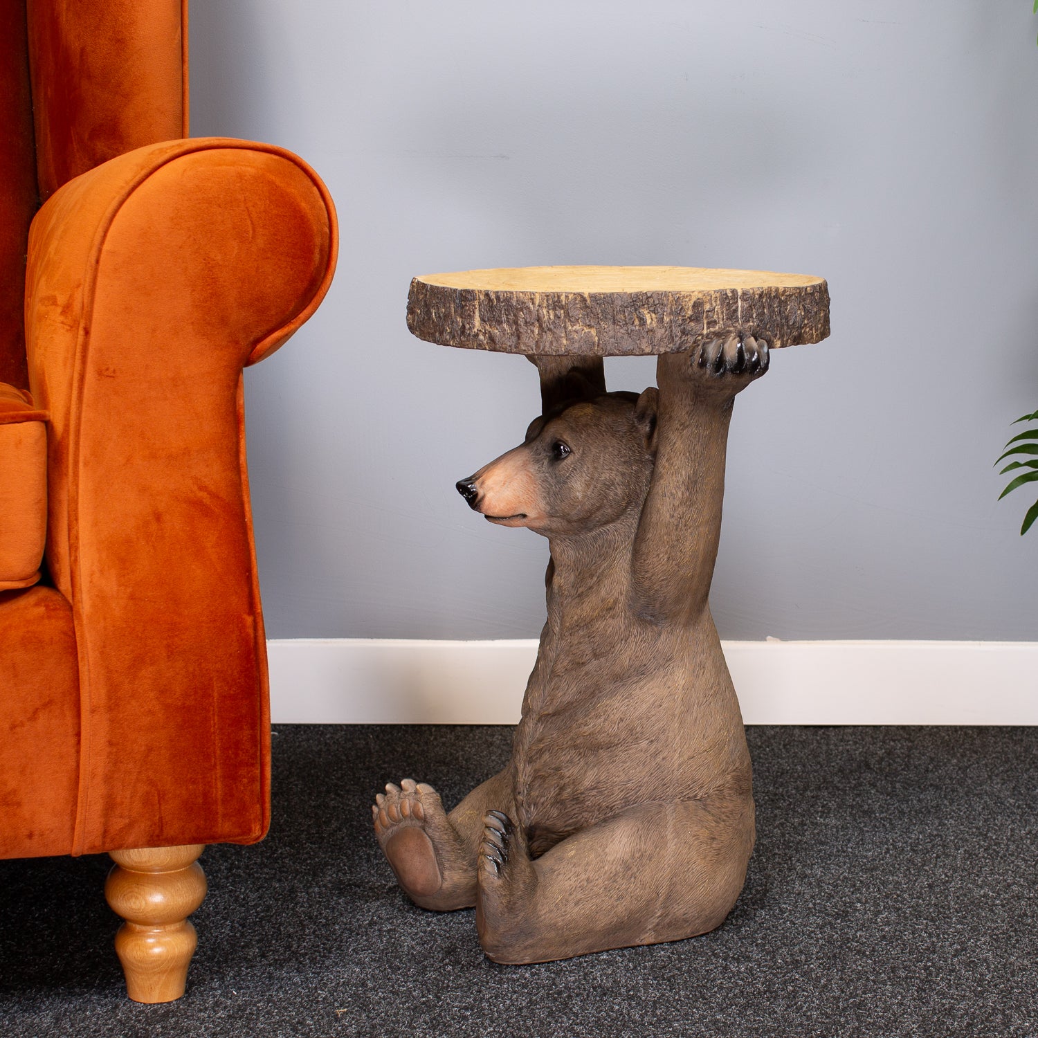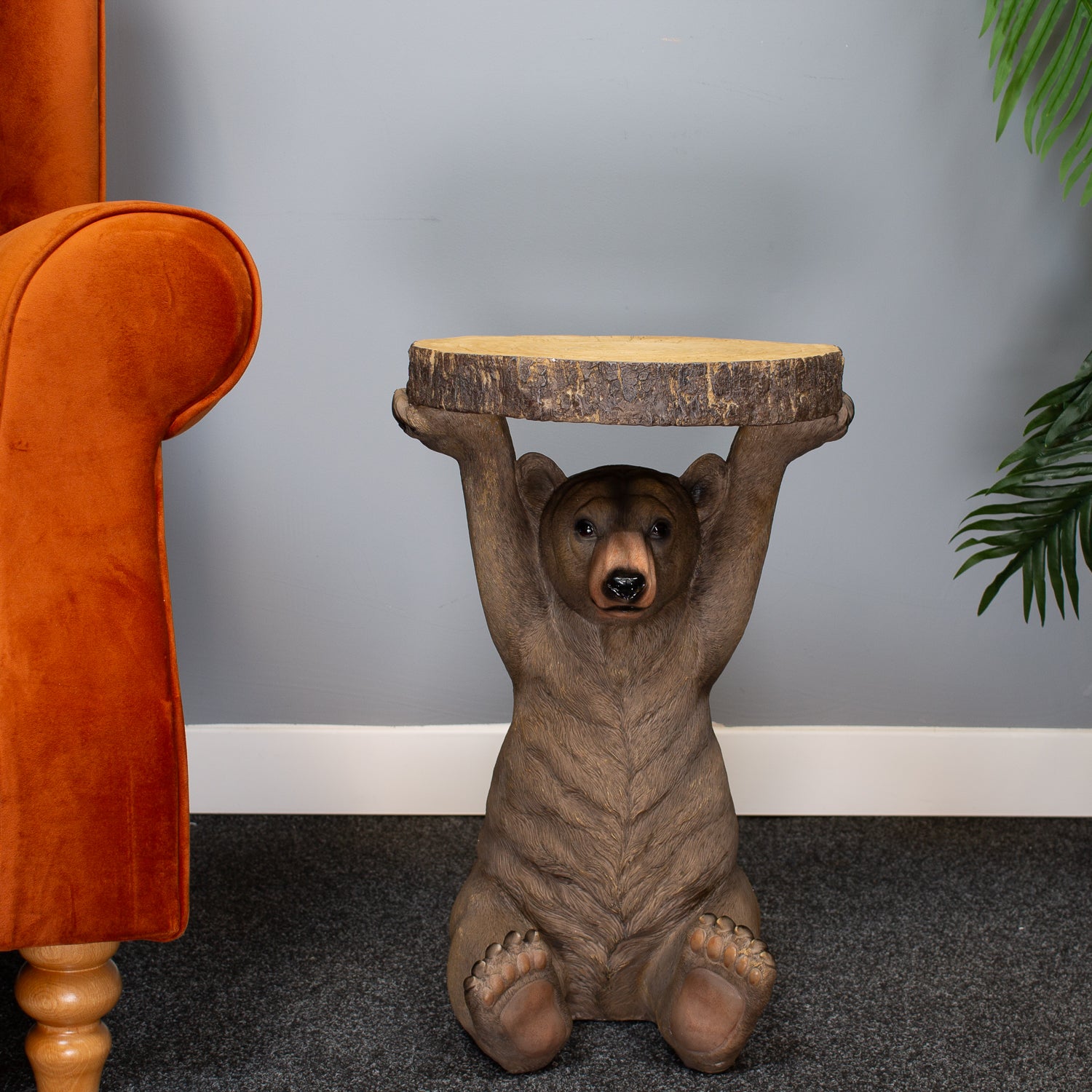 Bring a playful twist to your interiors with our Bear Table – a charming and quirky piece that’s as functional as it is fun. This loveable bear, cast from resin with finely detailed texture, stands upright and proudly supports a rustic tree-trunk-style tabletop. Painted in natural tones with a hint of woodland character, it adds instant personality to any corner.