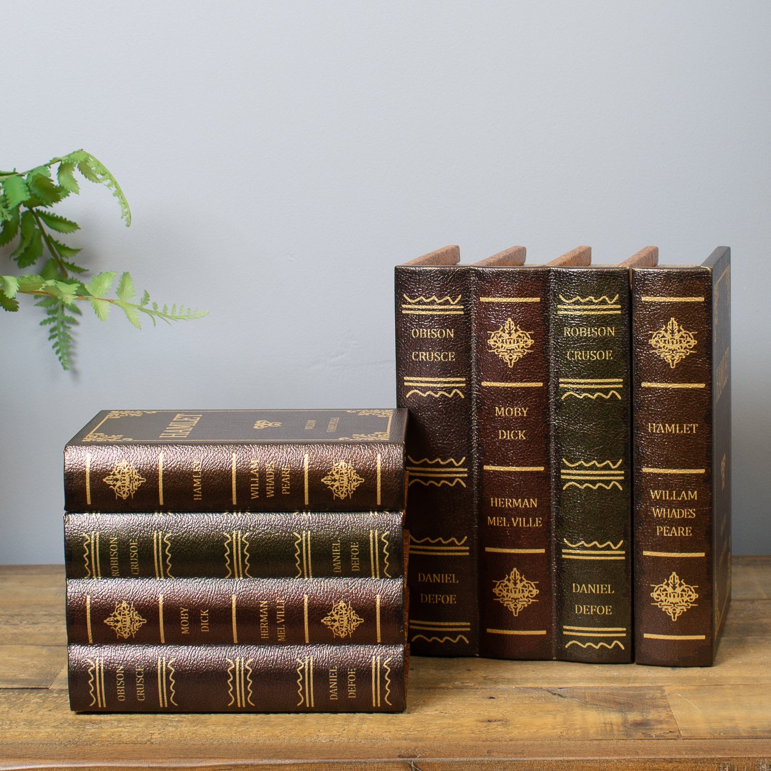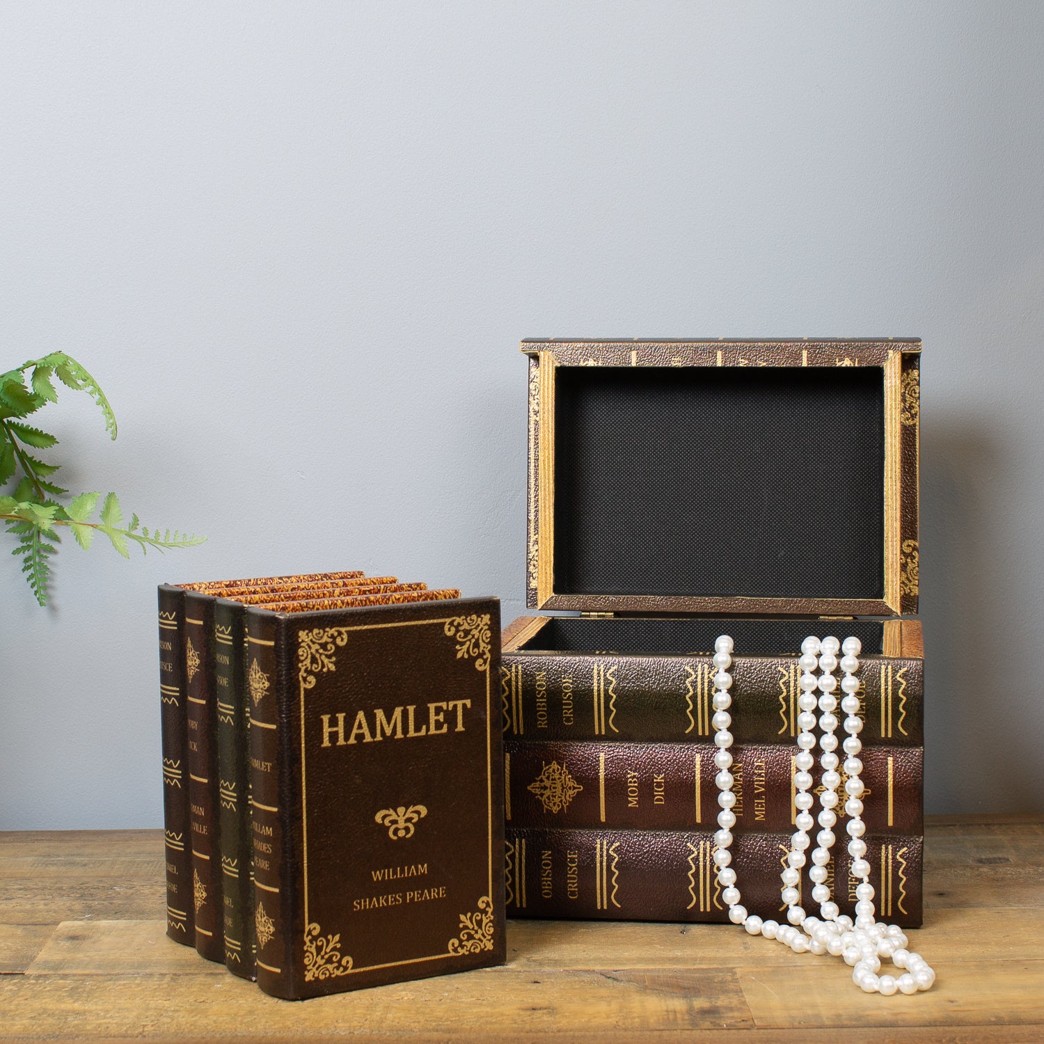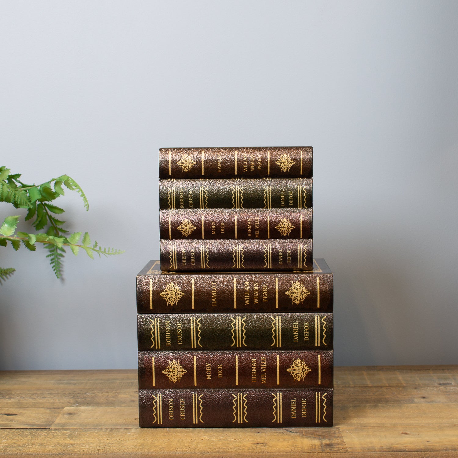 Add a literary twist to your storage with our set of two book-style storage boxes, beautifully crafted to resemble a stack of classic hardback books. Designed with aged spine detailing and rich vintage tones, these boxes are perfect for keeping trinkets, jewellery, keepsakes, or any little treasures safely tucked away—while looking like part of your library.