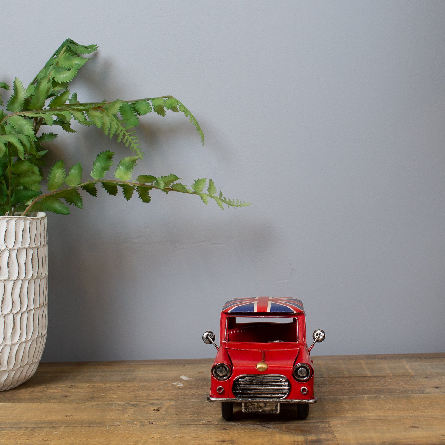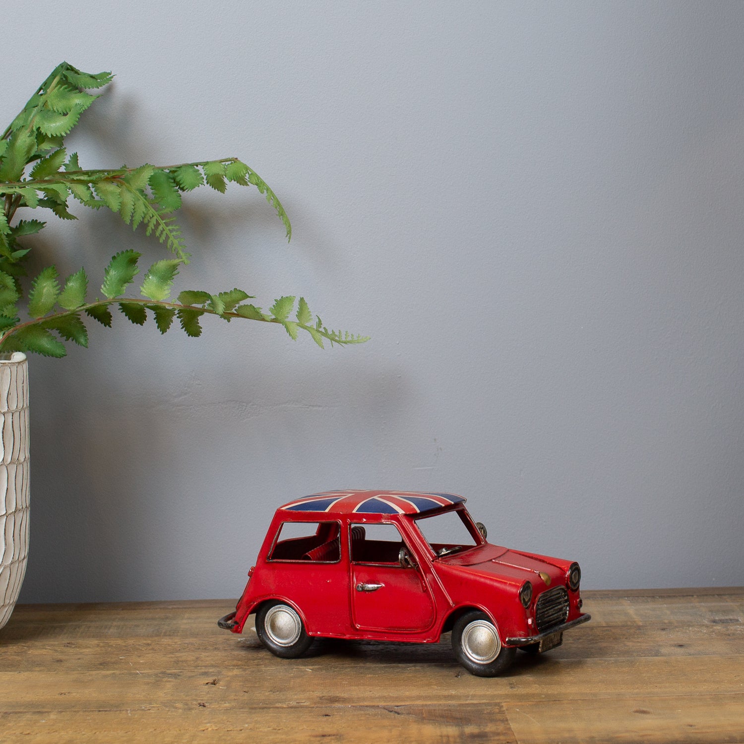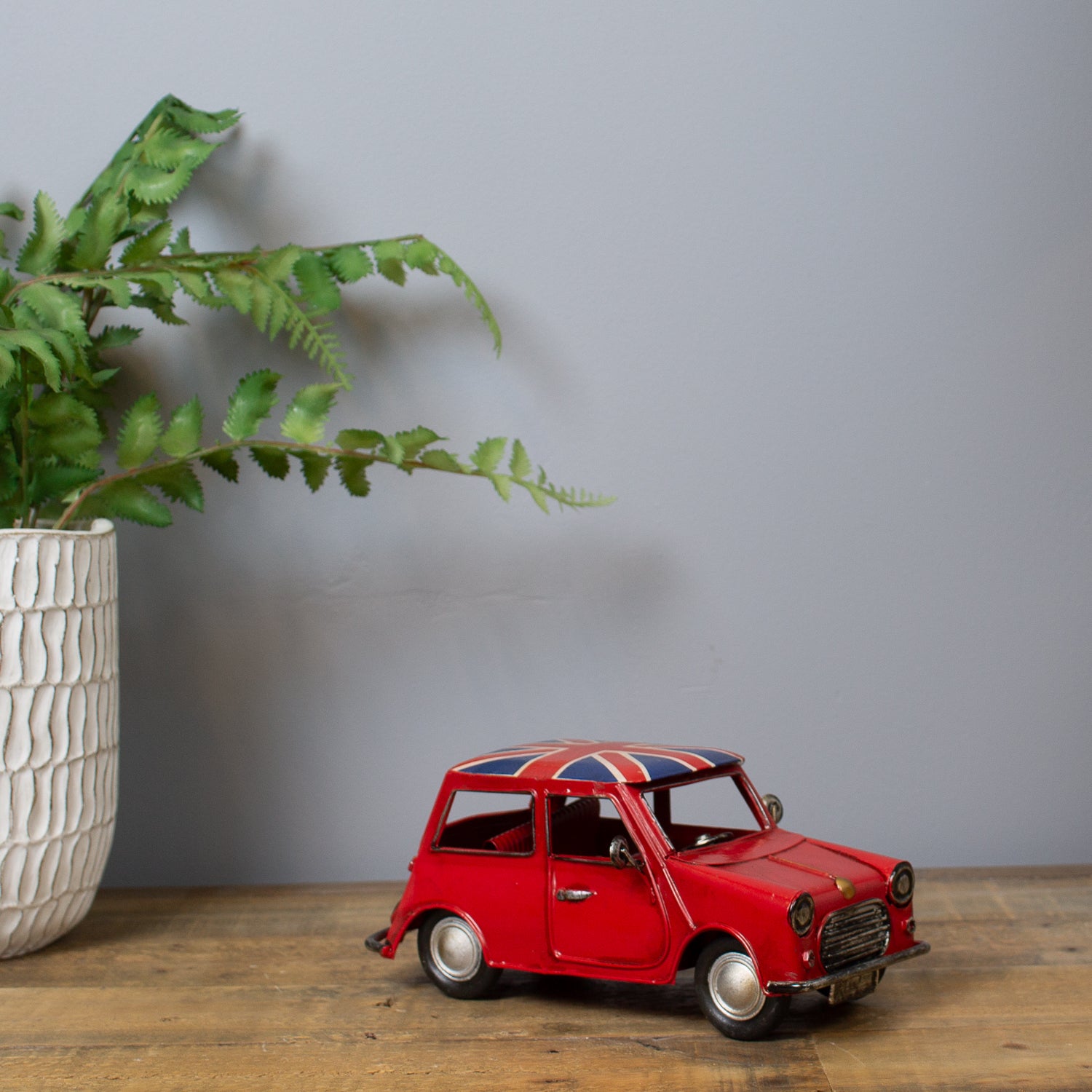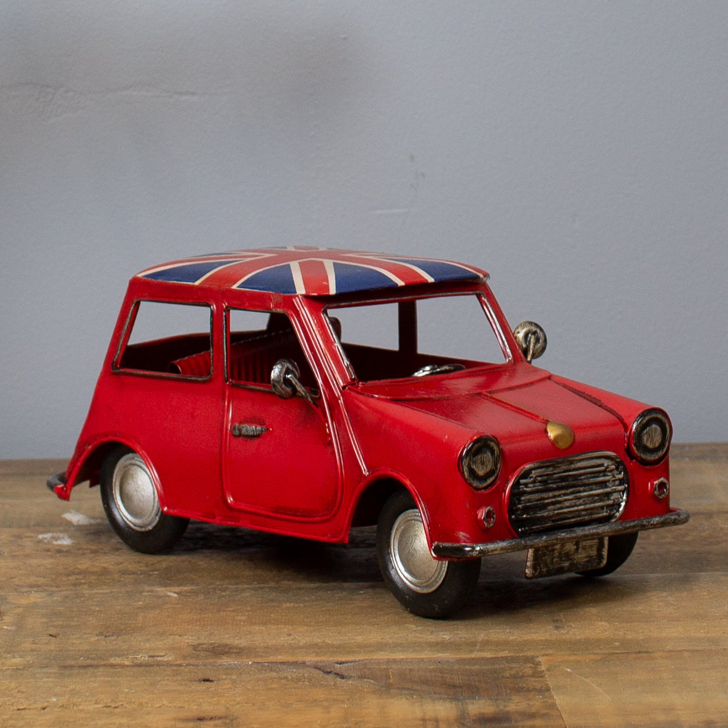 Bring a slice of British motoring nostalgia into your home with this hand-finished metal model of the legendary Mini, painted in a bold red with a proudly waving Union Jack across the roof.