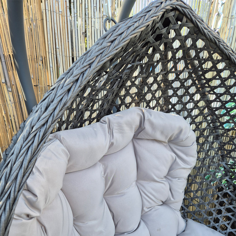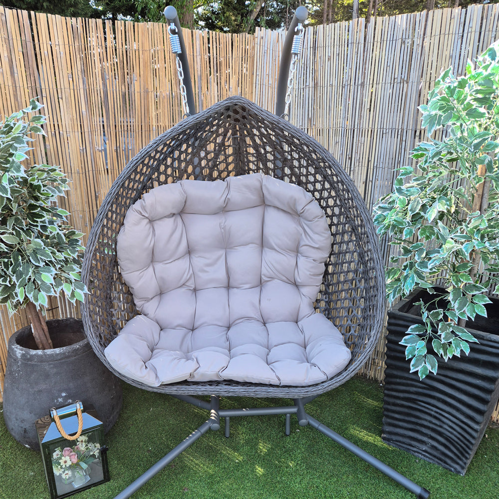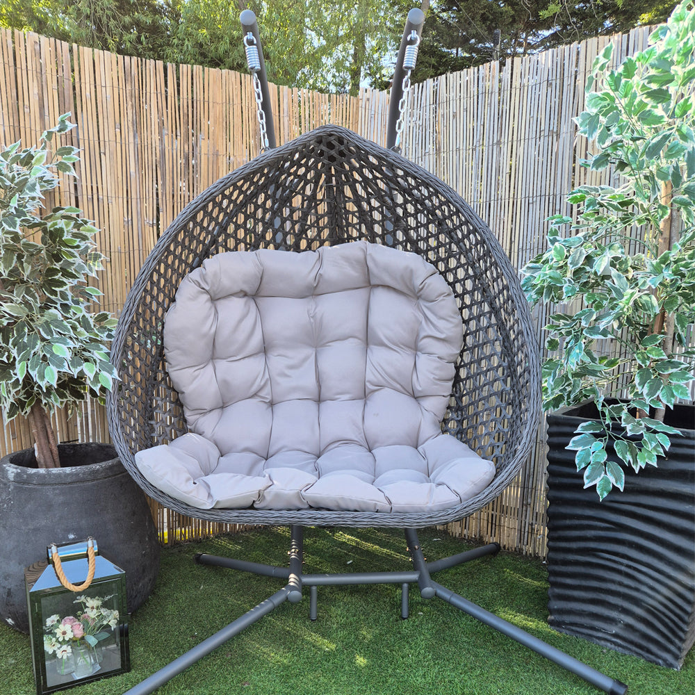 Double the space, double the comfort β the Darwin Hanging Egg Chair in Grey is your invitation to share the swing (or stretch out solo with room to spare). With its generous twin-seat design and refined basket-weave finish, itβs a laid-back luxury made for garden lounging, together.