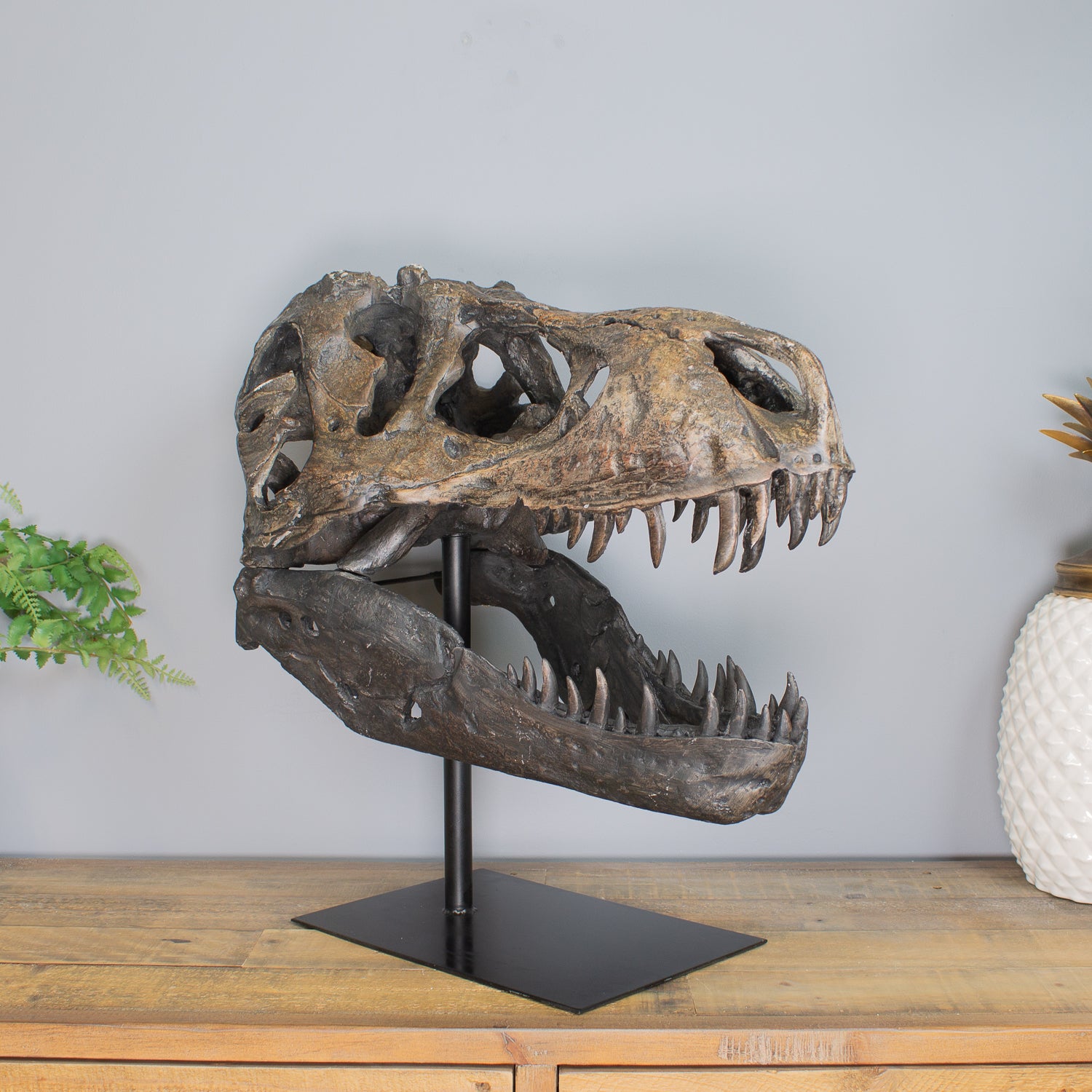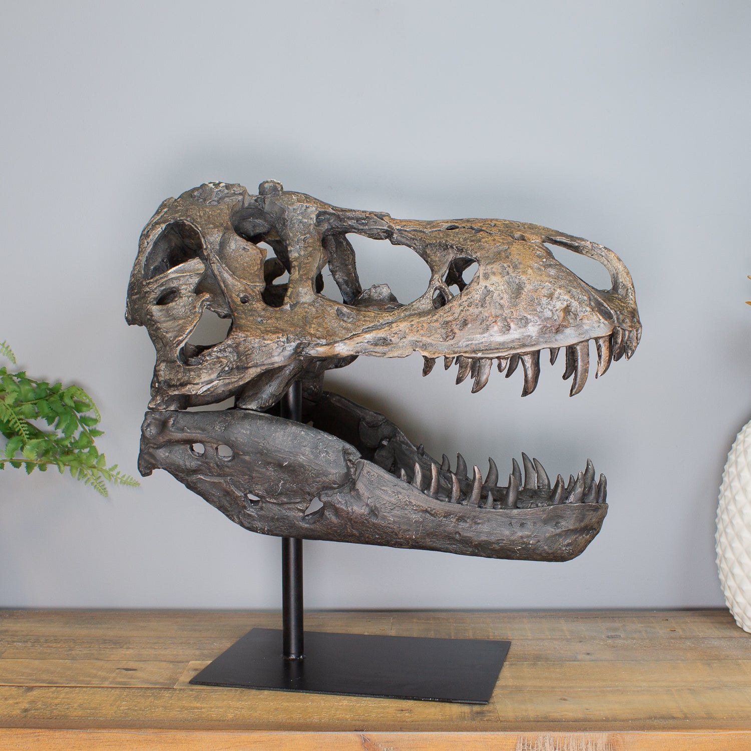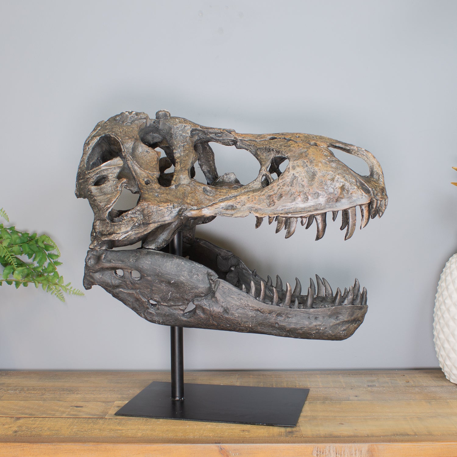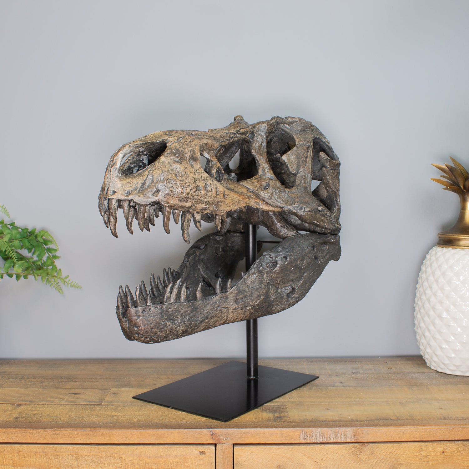 Add a bold and fascinating touch to your décor with this Dinosaur Skull Resin Replica, mounted on a sleek plinth-style base for a museum-inspired look. Crafted from high-quality resin, this sculptural piece captures the intricate details of a prehistoric predator’s skull, making it perfect for lovers of natural history, curiosities, and statement styling.