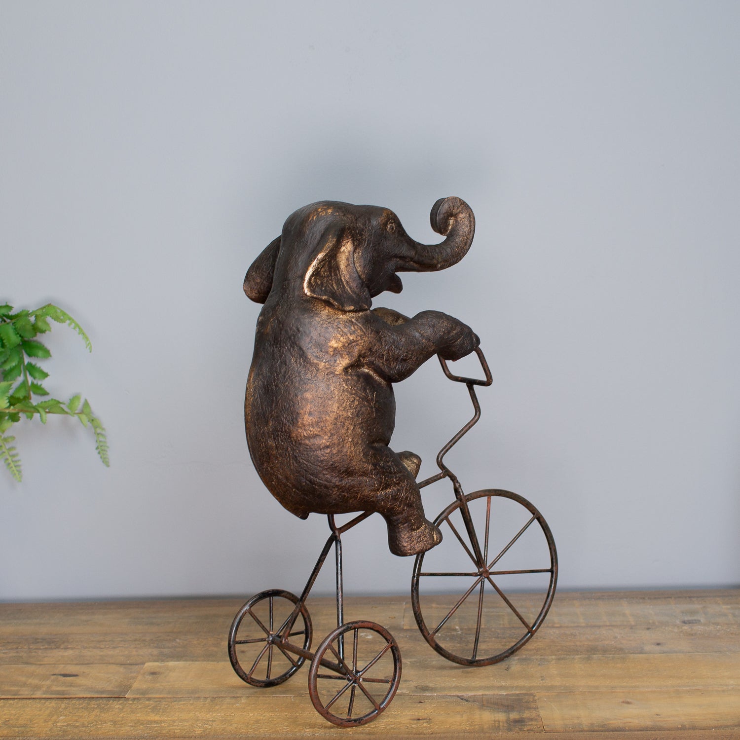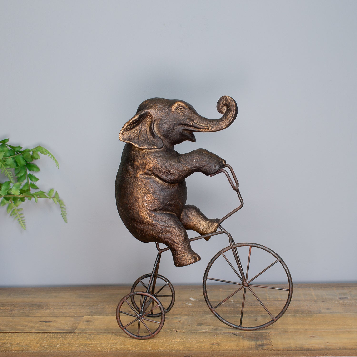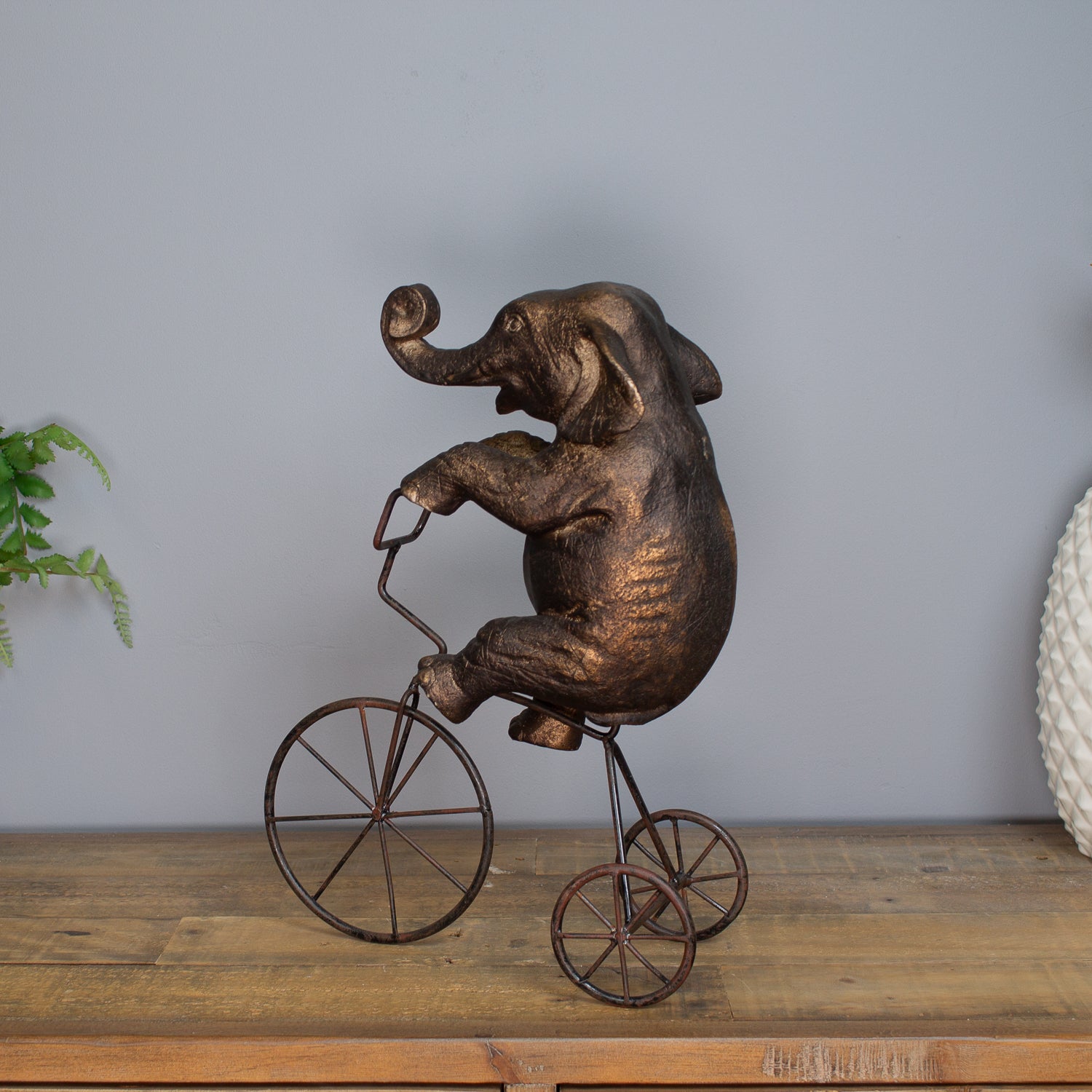 The contrast between the elephant’s sturdy form and the dainty metal trike creates a visually engaging piece that’s perfect for adding character to shelves, consoles, or quirky corners. Whether you’re styling a fun-filled interior or simply love décor that makes you smile, this sculpture is sure to do the trick.