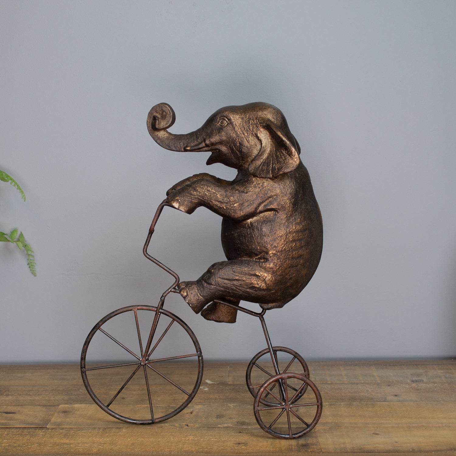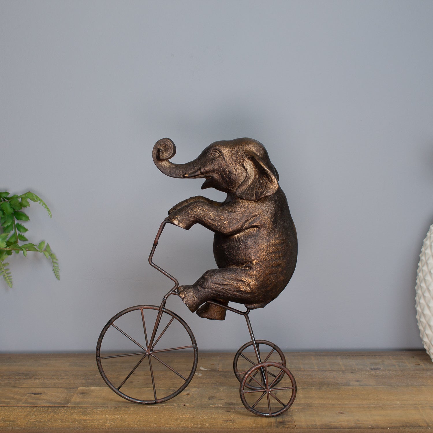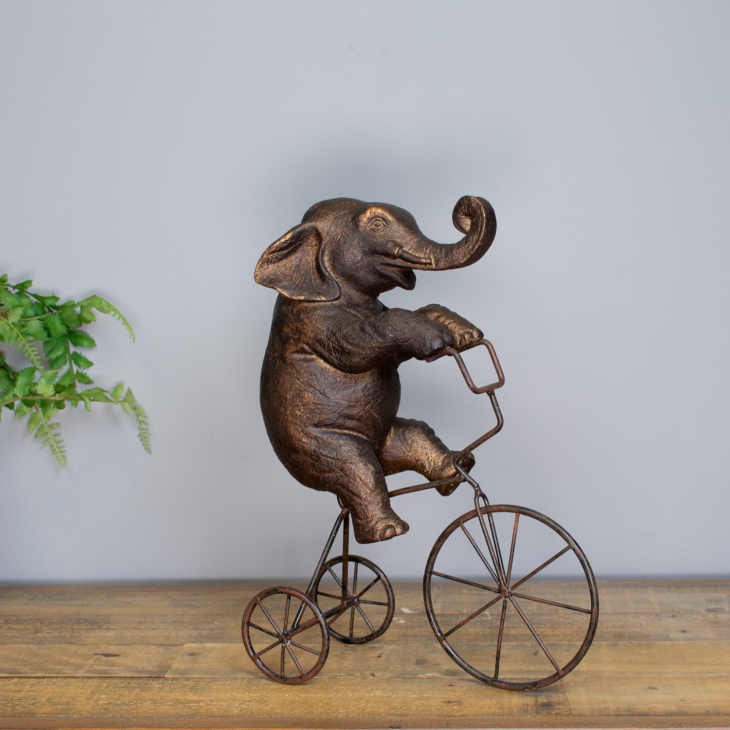 The contrast between the elephant’s sturdy form and the dainty metal trike creates a visually engaging piece that’s perfect for adding character to shelves, consoles, or quirky corners. Whether you’re styling a fun-filled interior or simply love décor that makes you smile, this sculpture is sure to do the trick.