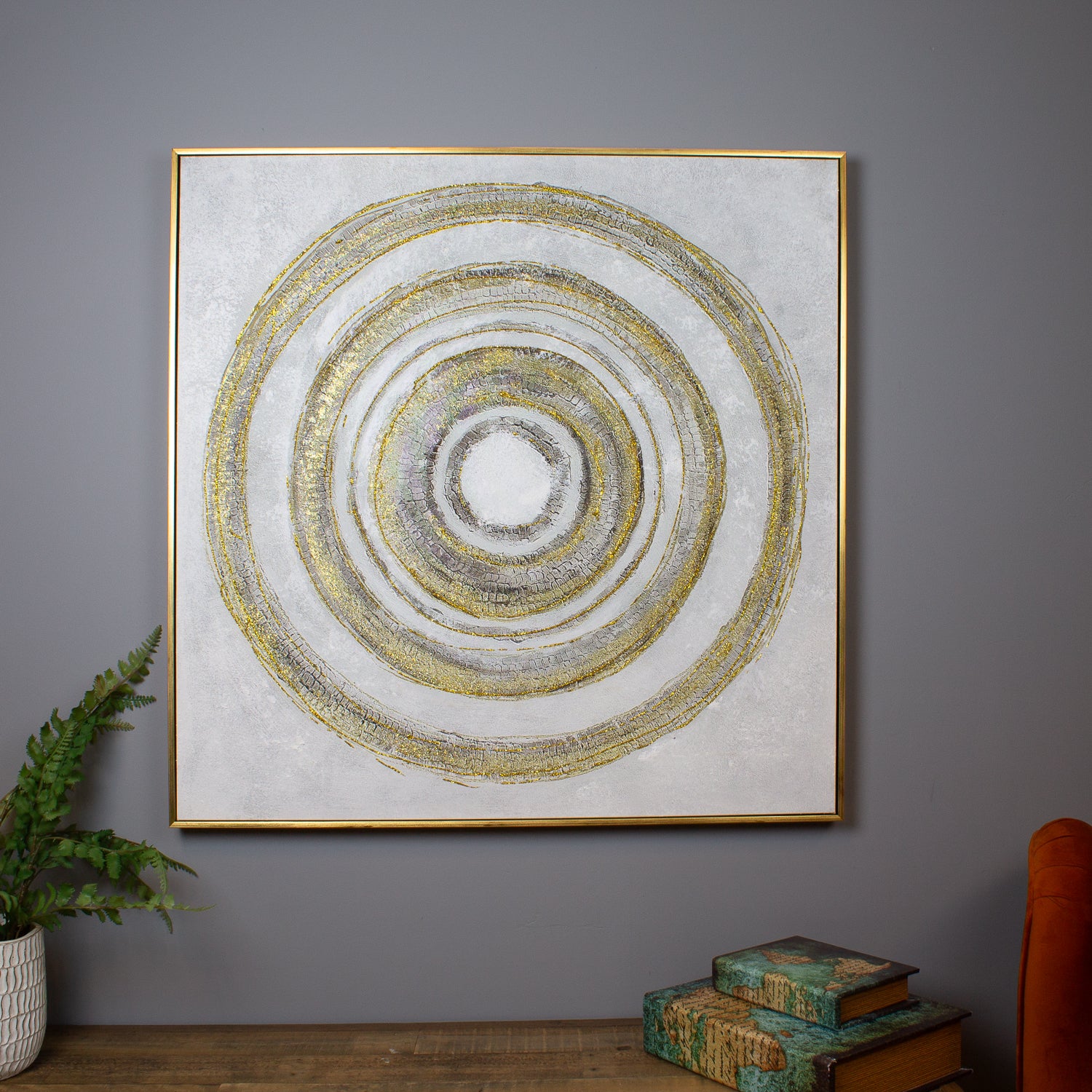 Featuring a layered circular composition, this piece is enriched with metallic embellishments, adding subtle shimmer and texture that catch the light beautifully. Inset into a sleek gold-coloured frame, this artwork blends modern elegance with timeless sophistication, making it an ideal statement for any living area, bedroom, or stylish interior.