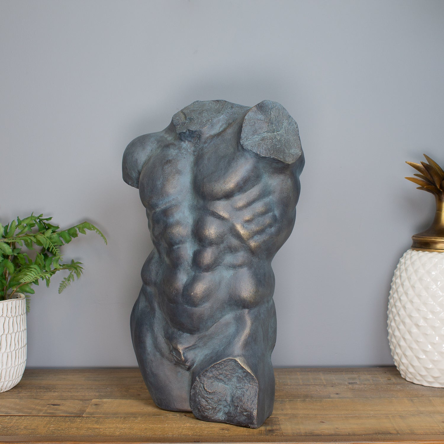Celebrate the timeless beauty of the human form with this Large Male Torso Ornament, a striking piece sculpted in textured resin and finished in a stone-like grey with a subtle metallic sheen. The finish evokes the weight and presence of natural stone, while catching the light with a gentle glint—perfect for modern interiors seeking a blend of raw texture and refined detail.