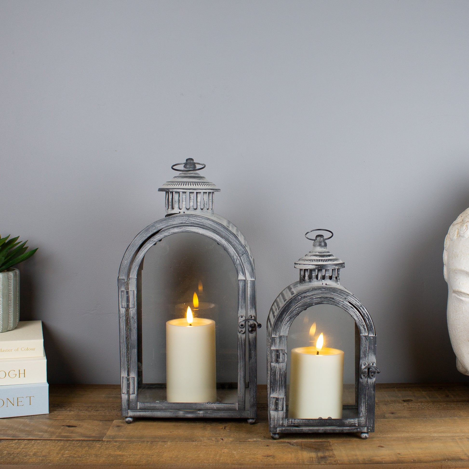 Sold as a coordinating set of two, these lanterns are designed to be styled together for impact or placed separately to create a cohesive glow throughout the home. Each is perfectly suited to a chunky wax church candle or a battery-operated faux candle on a timer, offering atmosphere without daily effort.