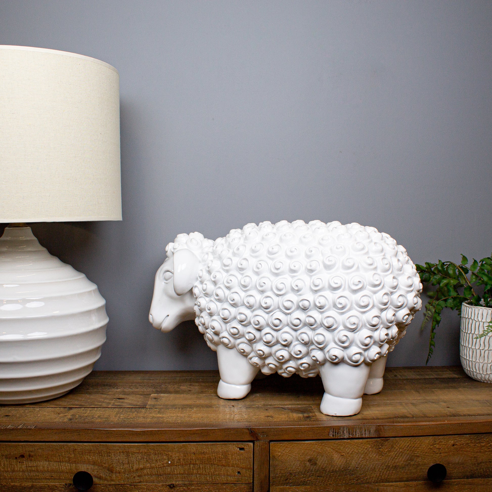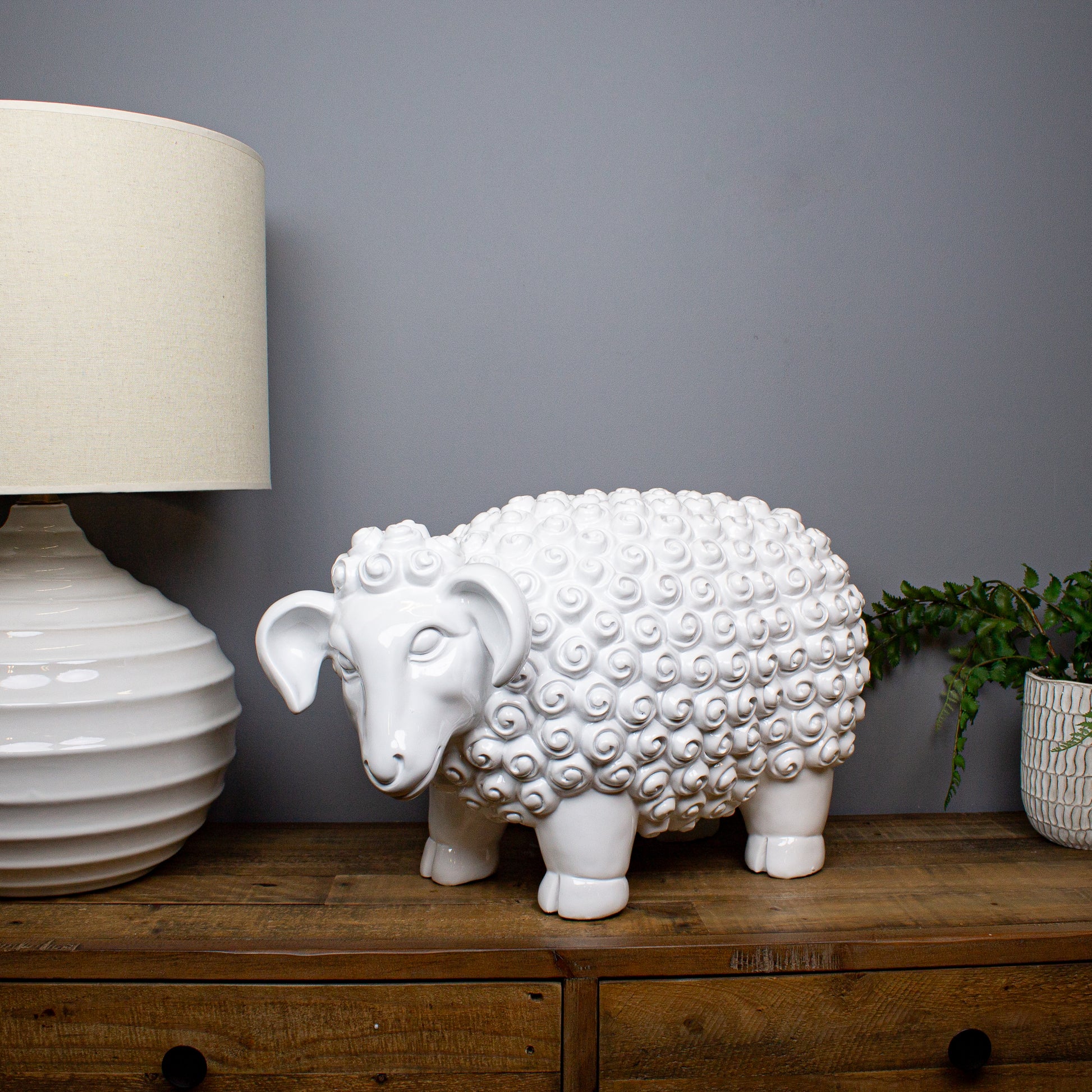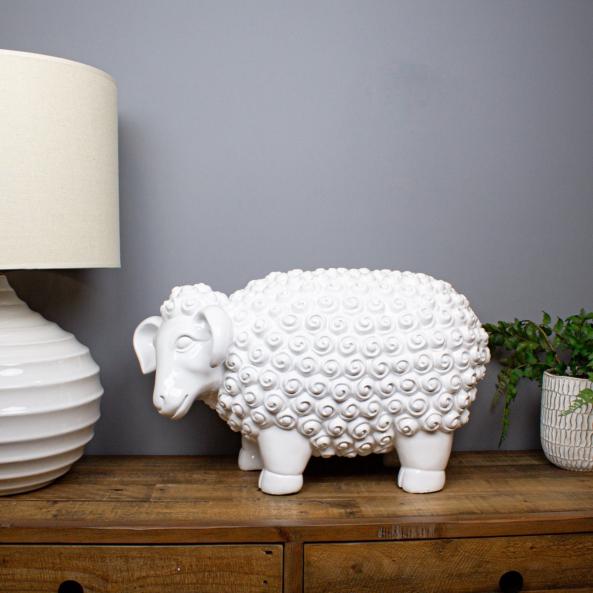 Playful, bold and refreshingly uncomplicated, the Giant White Sheep Sculpture is designed to raise a smile. Floor standing and generously sized, it takes a familiar farmyard character and reworks it in smooth resin with a crisp, high-gloss white finish. The coat is gently sculpted to suggest curly fleece, giving just enough texture without tipping into fussy detail.