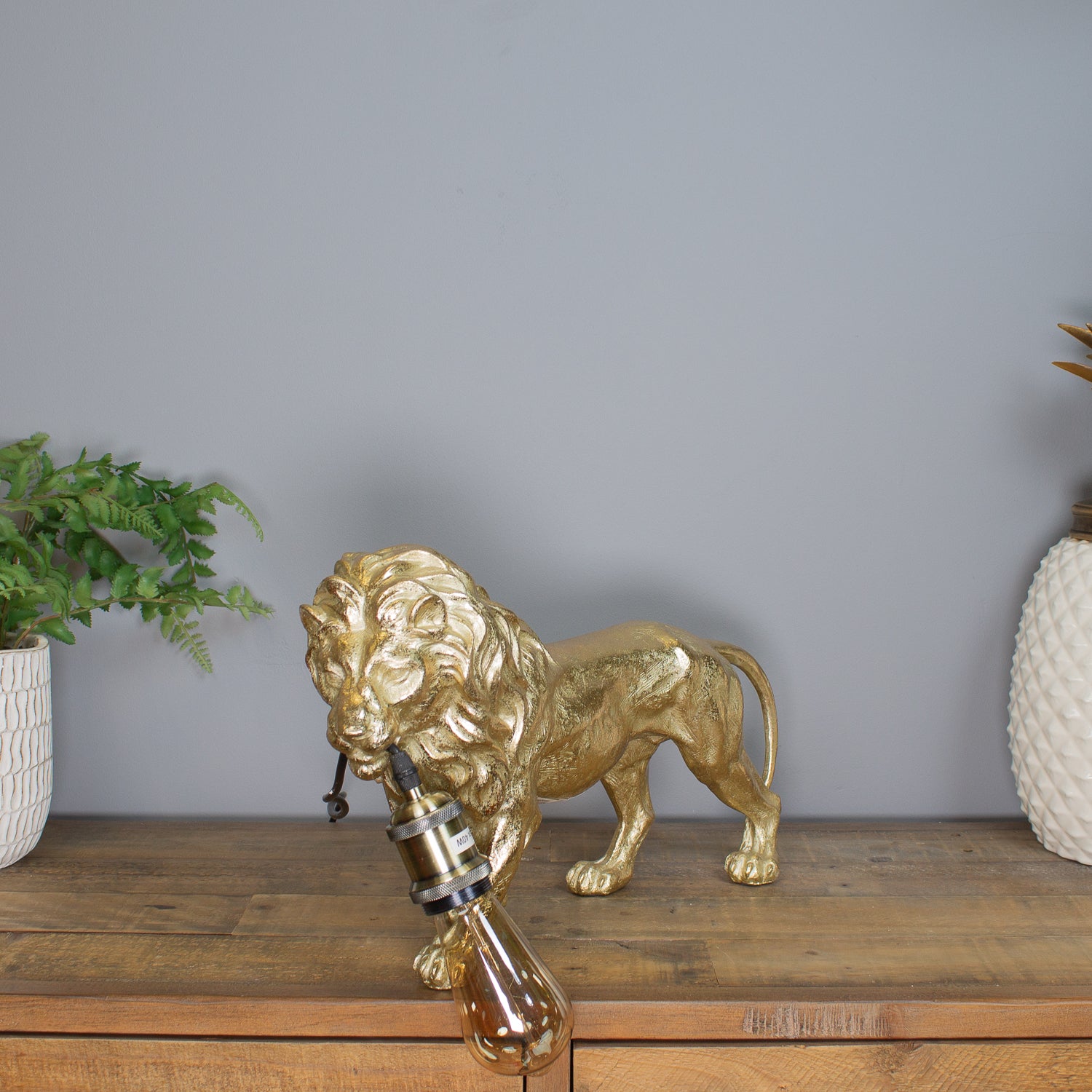 Make a bold and luxurious statement with the Gold Lion Lamp, a showstopping piece that exudes strength, style, and sophistication. This majestic lion is crafted from resin with a gleaming gold finish, and holds a lamp fitting in its mouth—bringing light and presence to any space with commanding charm.