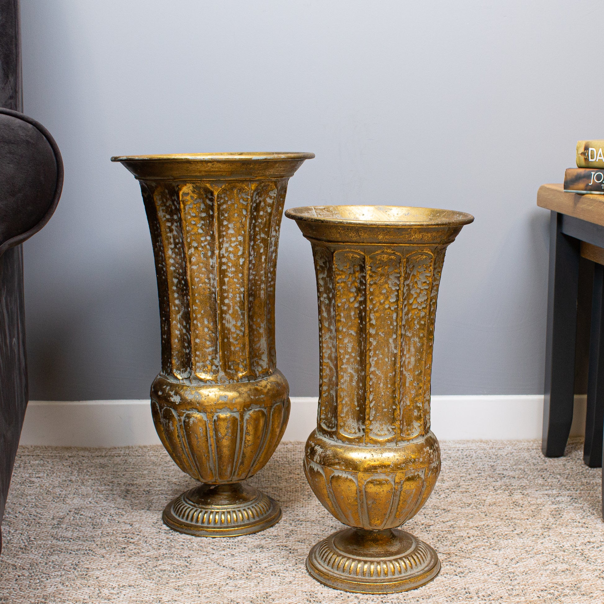 The Tangier Vase is a richly sculptural piece with a classical, Moorish-inspired profile. Crafted from metal and finished in an aged gold, its surface carries a softly mottled patina that gives depth and a sense of history. The form is elegant and balanced, beginning with a defined foot, swelling gently at the base before tapering upwards into vertically fluted sides and a smooth, slightly everted rim.