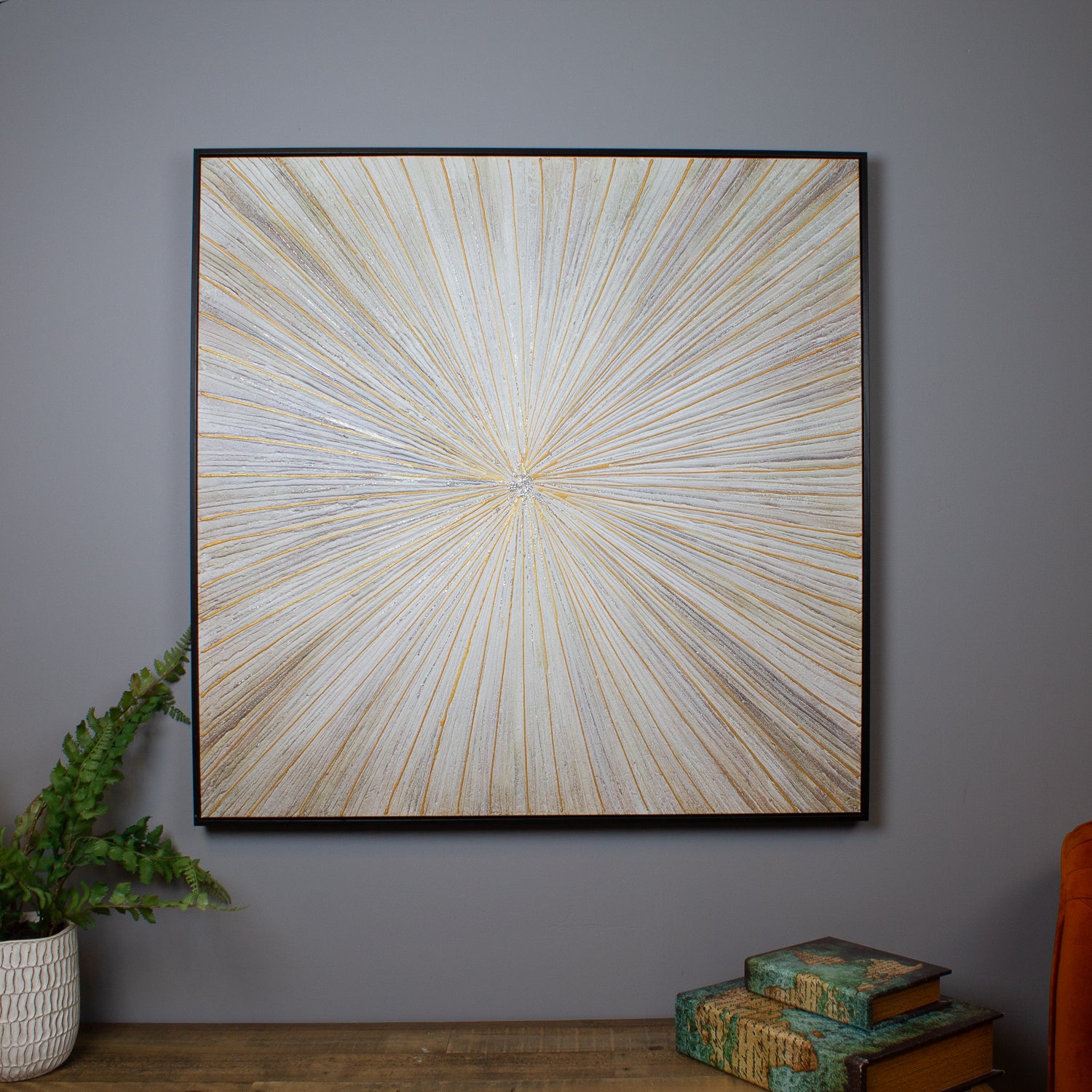 This captivating abstract design radiates outward in a stunning starburst effect, creating a sense of movement and brilliance. Carefully painted with meticulous detail, the piece is enriched with metallic accents that catch the light beautifully, adding a touch of luxurious shimmer. Inset into a sleek black frame, this statement artwork offers a perfect balance of bold contrast and refined elegance.