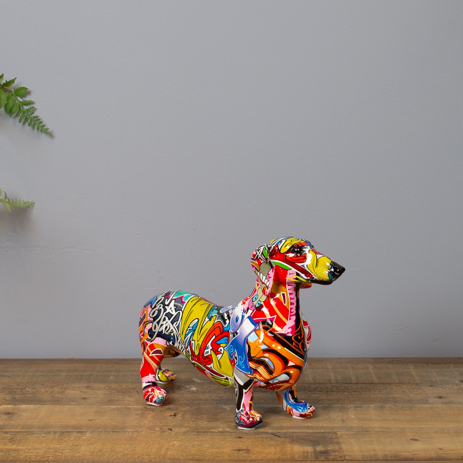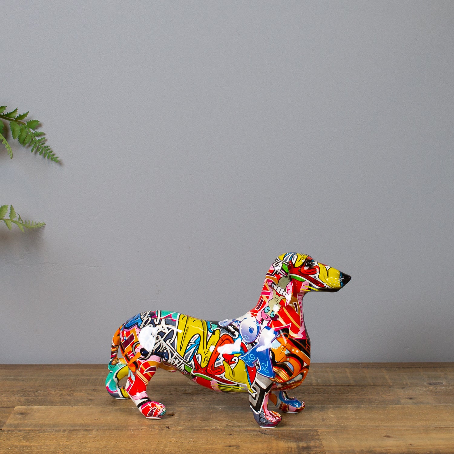Coated in a glossy graffiti-style print, the piece bursts with urban colour and street-art energy. Whether it's sitting on a shelf or styling a sideboard, this pup makes a bold impression from every angle.