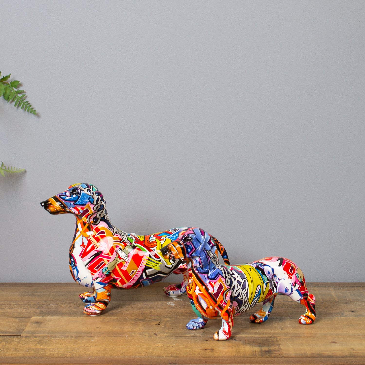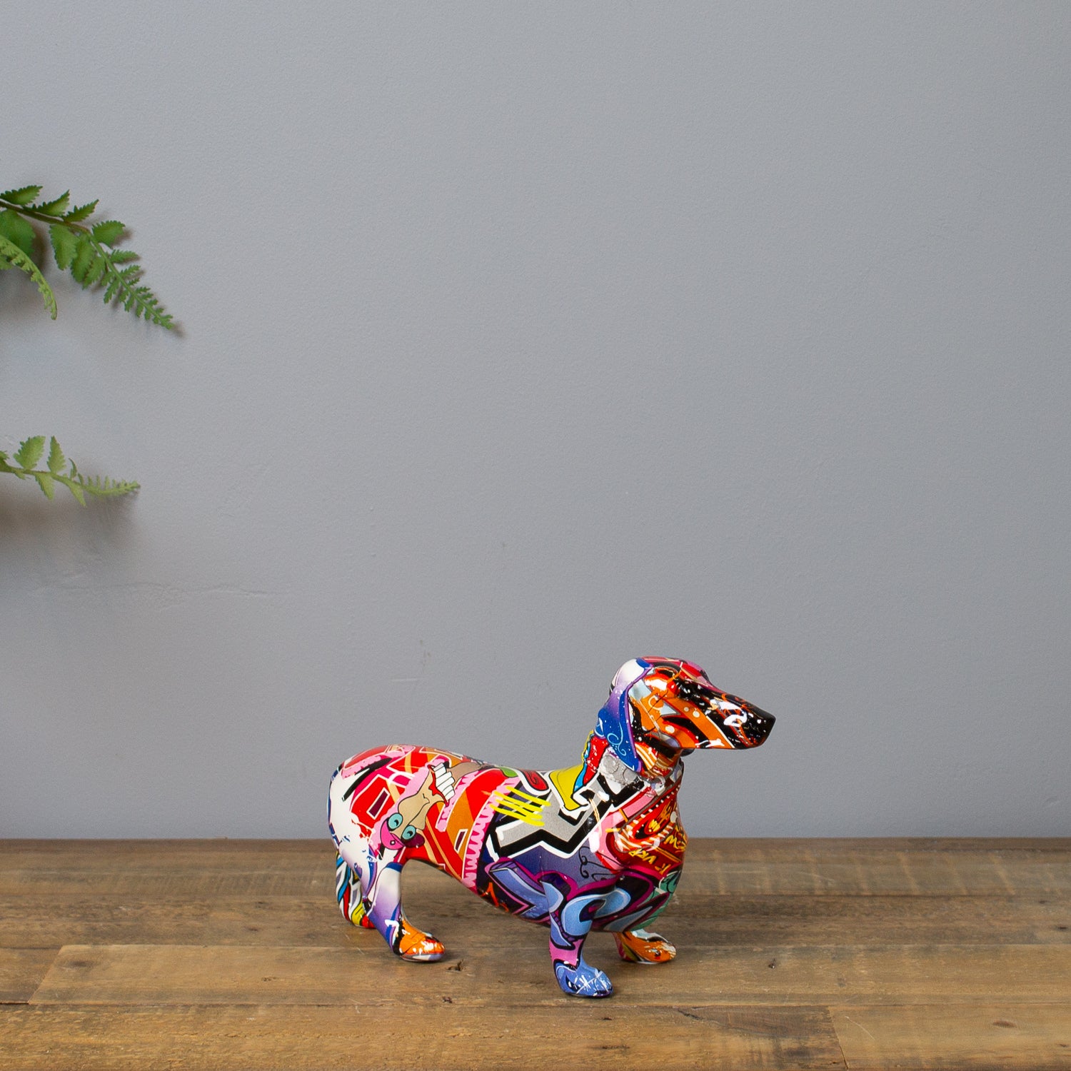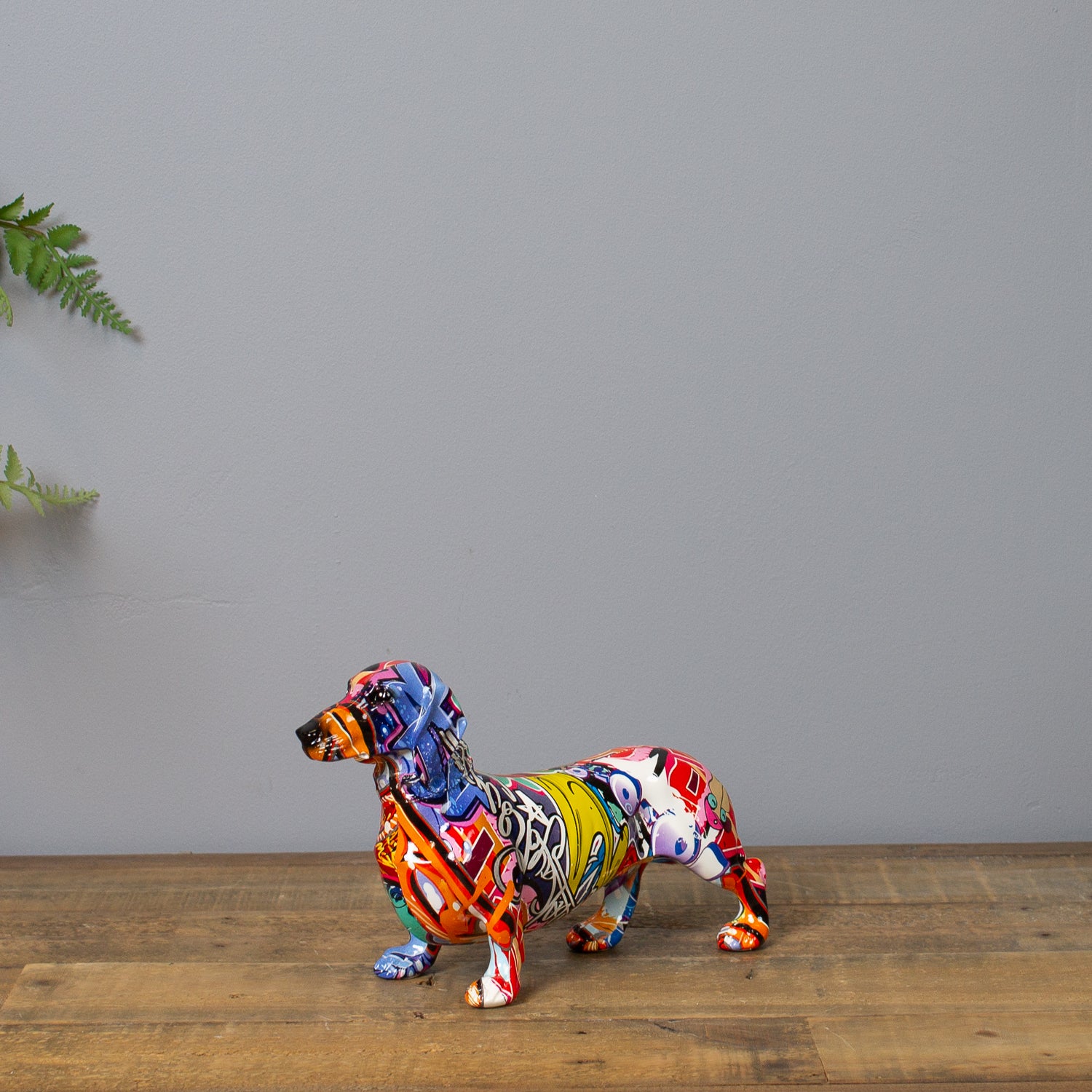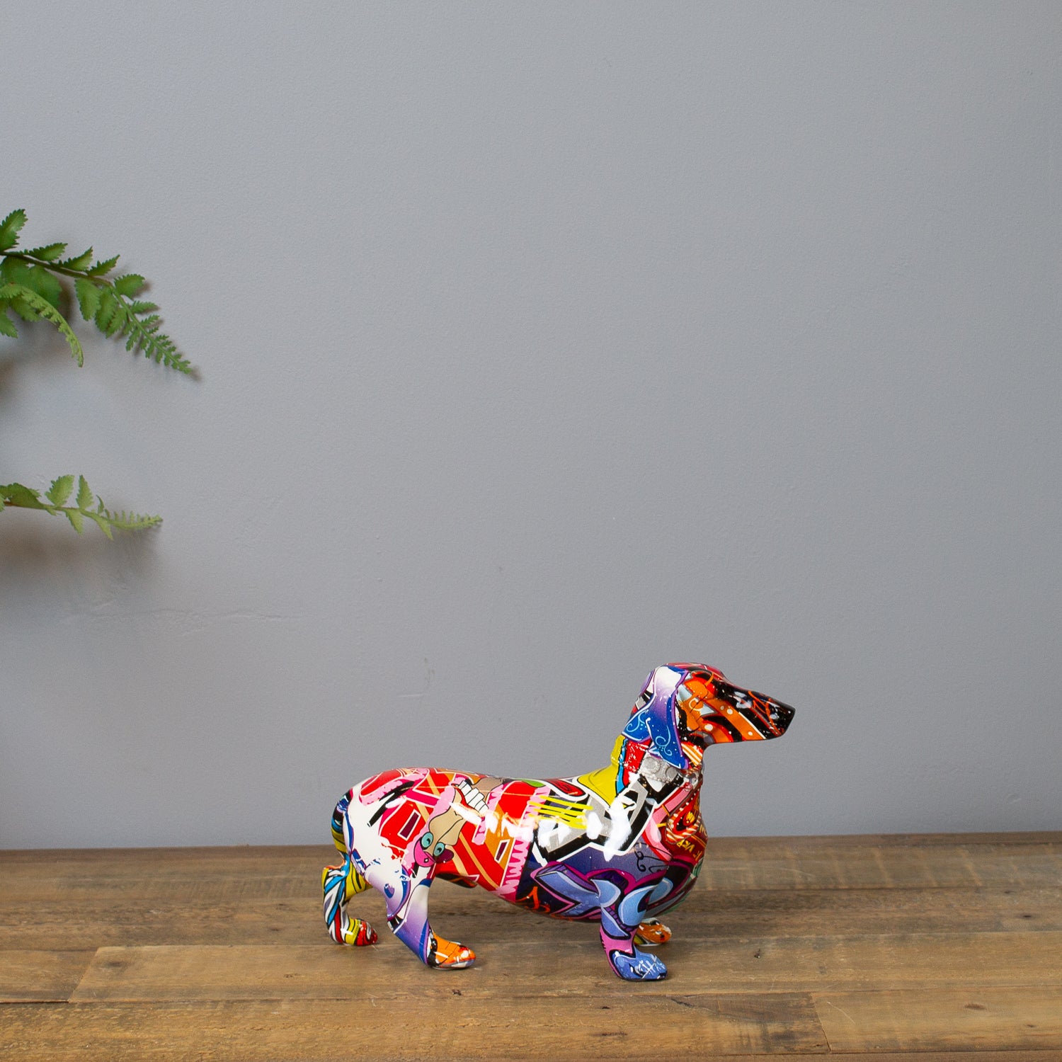 This little dog comes with a big personality. Our Graffiti Dachshund Ornament may be small in stature, but it brings bold energy to any surface. Dressed in a high-gloss graffiti print bursting with colour, it adds a street-style twist to a classic silhouette.