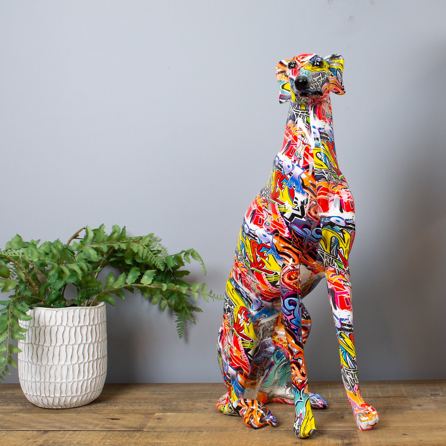 Graceful, poised, and packing a punch of colour – our Graffiti Sitting Greyhound Ornament is a true statement piece. Known for their sleek lines and dignified stance, this elegant hound takes on a bold new look with a high-gloss graffiti-style finish that brings street art flair into the home.