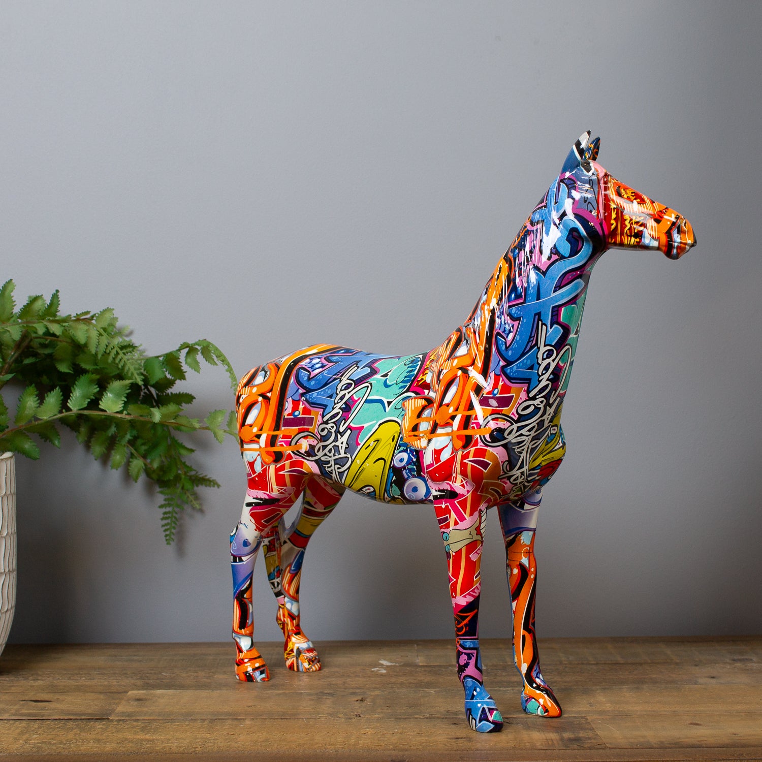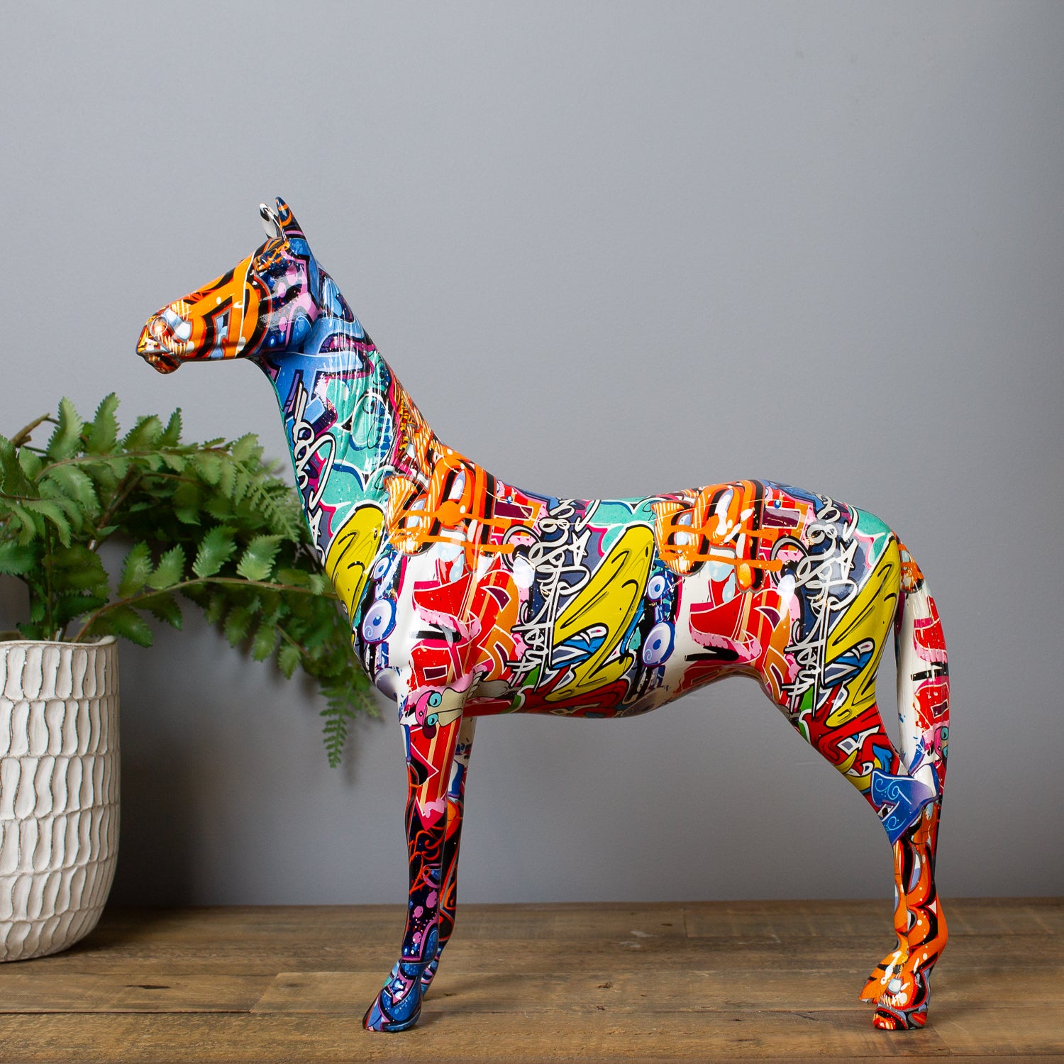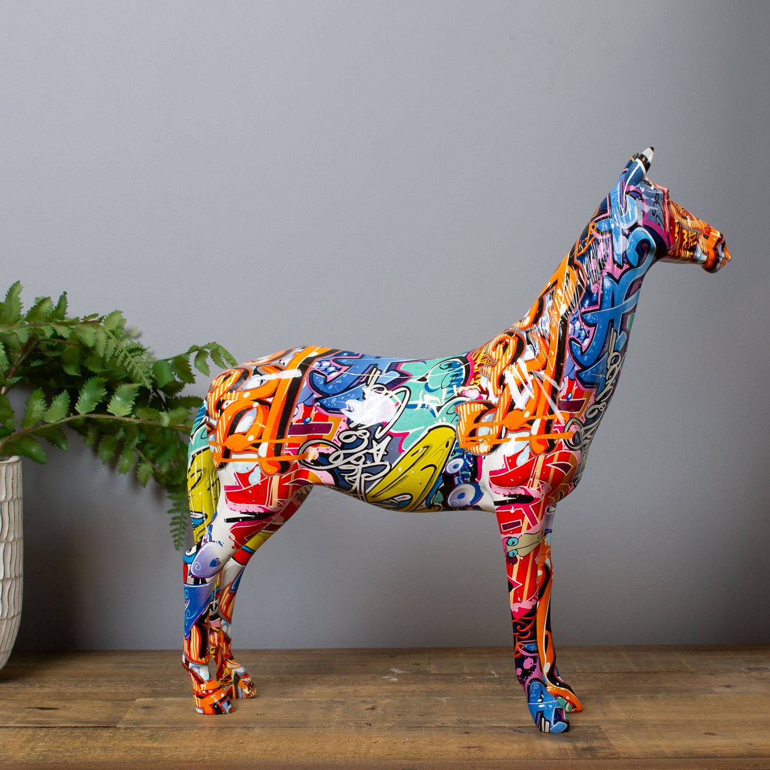 Classic elegance gets a rebellious makeover in our Graffiti Horse Ornament. Sculpted in a proud standing pose and finished with a high-gloss graffiti-style print, this large statement piece fuses timeless form with modern street-art attitude.