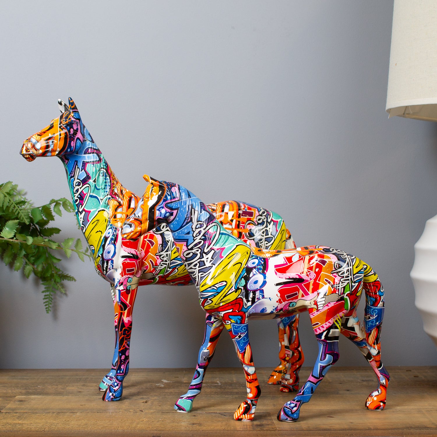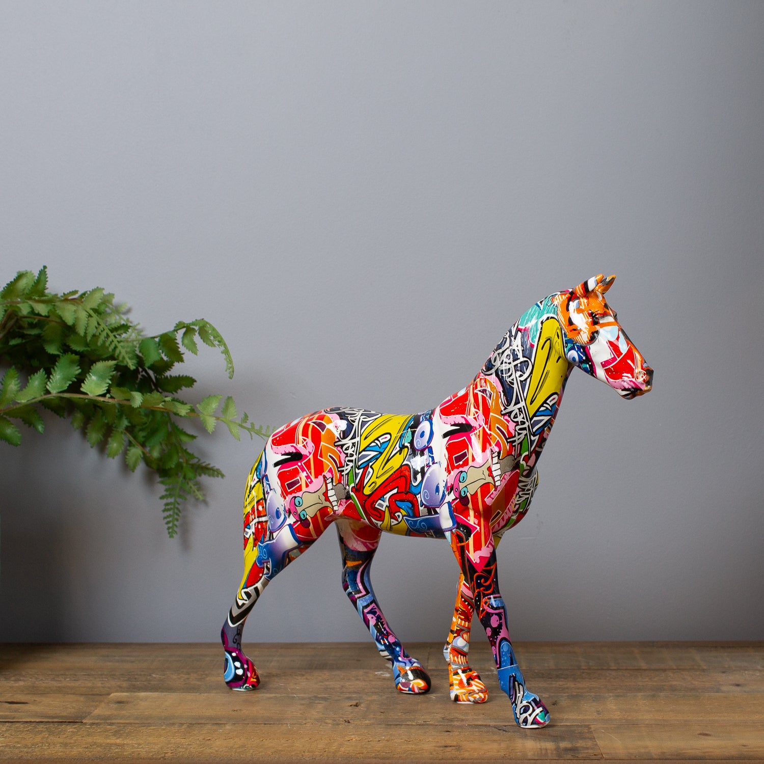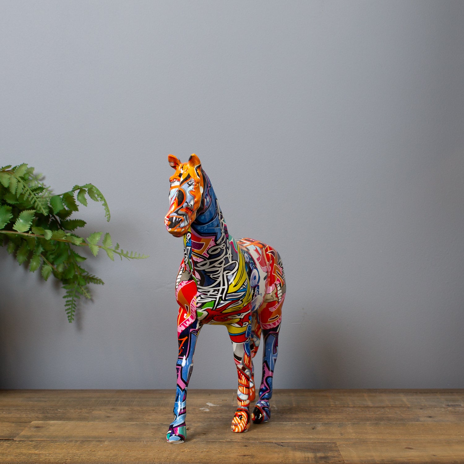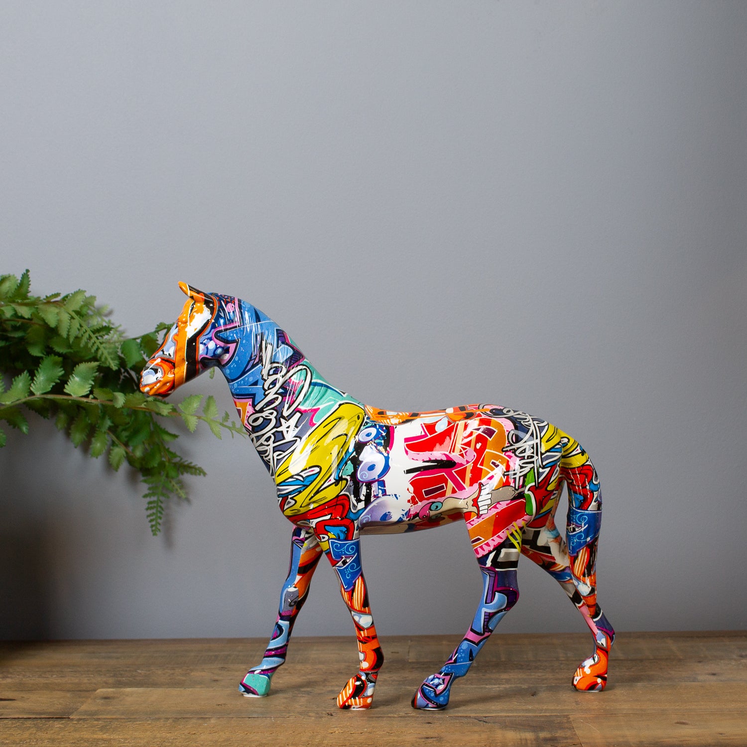 Majestic meets modern in our Graffiti Horse Ornament. This striking piece takes the elegance of equine sculpture and reinvents it with a high-gloss graffiti print bursting with bold colour and street-art style.