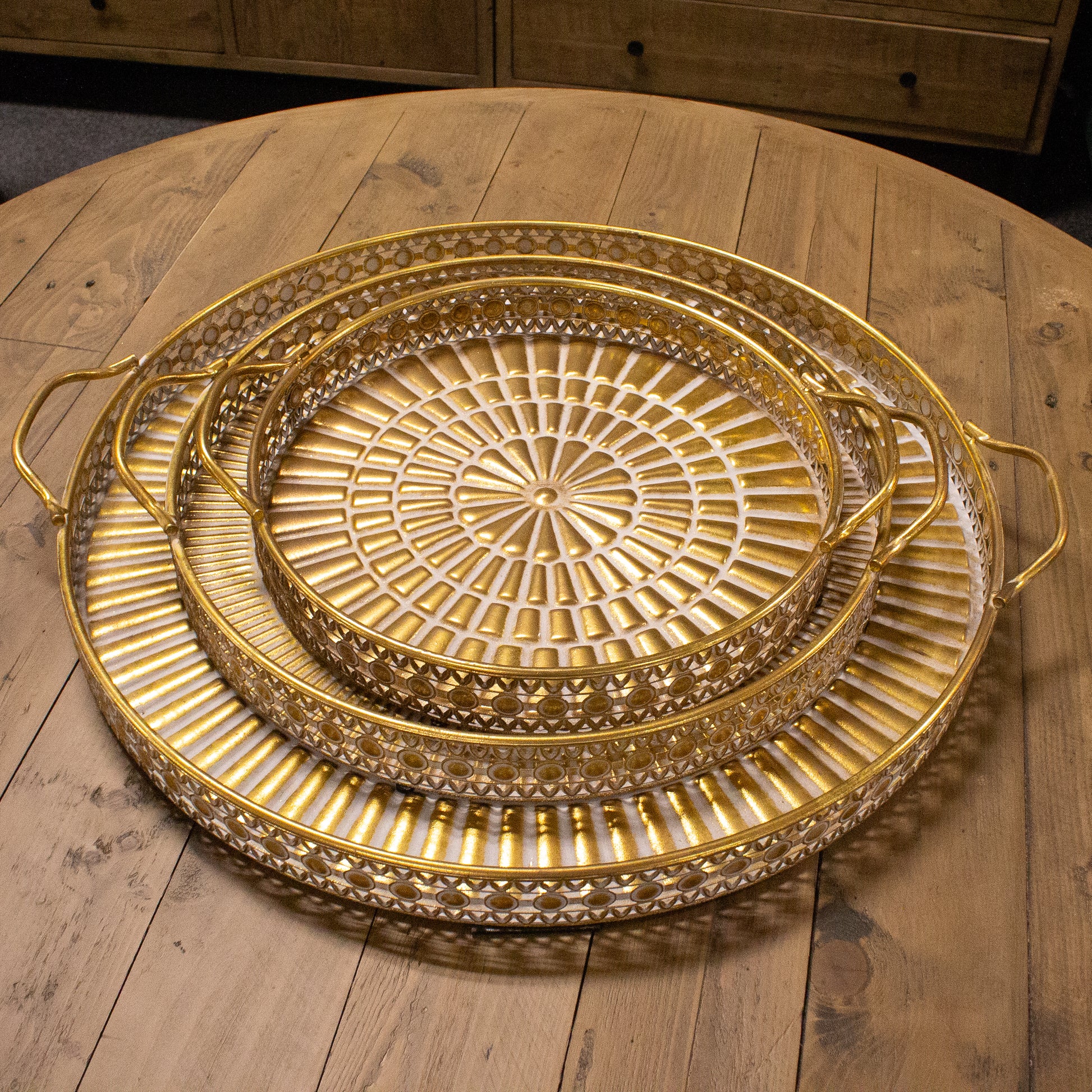 These handled trays bring a subtle layer of detail to everyday styling. Crafted from gold-coloured metal, each tray features a raised rosette-style pattern across the base, adding texture without overpowering. The gently detailed sides and curved handles frame the design neatly, giving the trays a decorative feel that remains light and versatile.