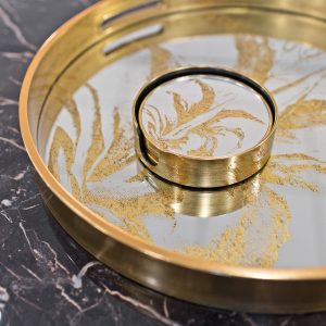 A beautifully crafted, set of four round glass coasters with a mirrored gold leaf pattern design in the centre set on to the glass plate.