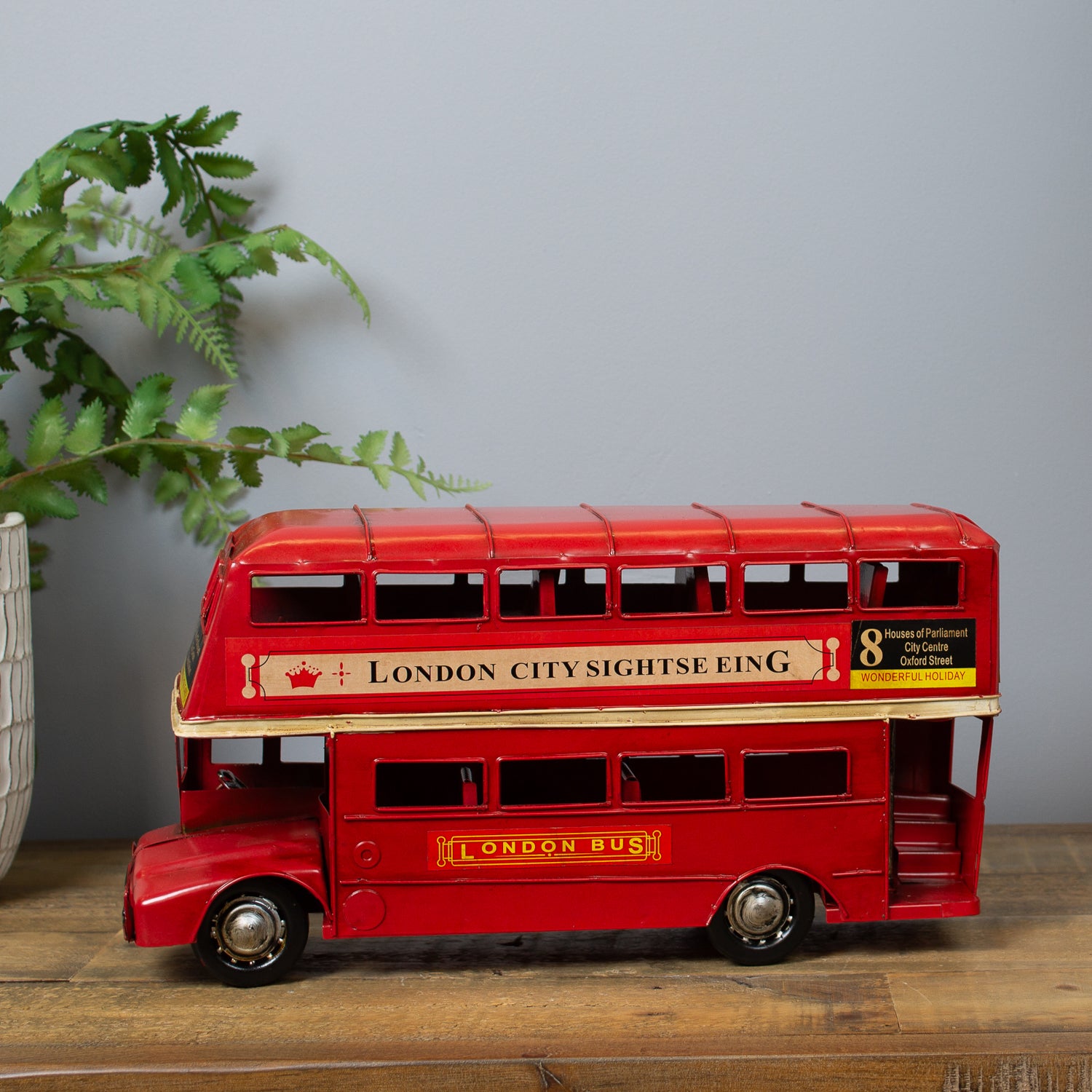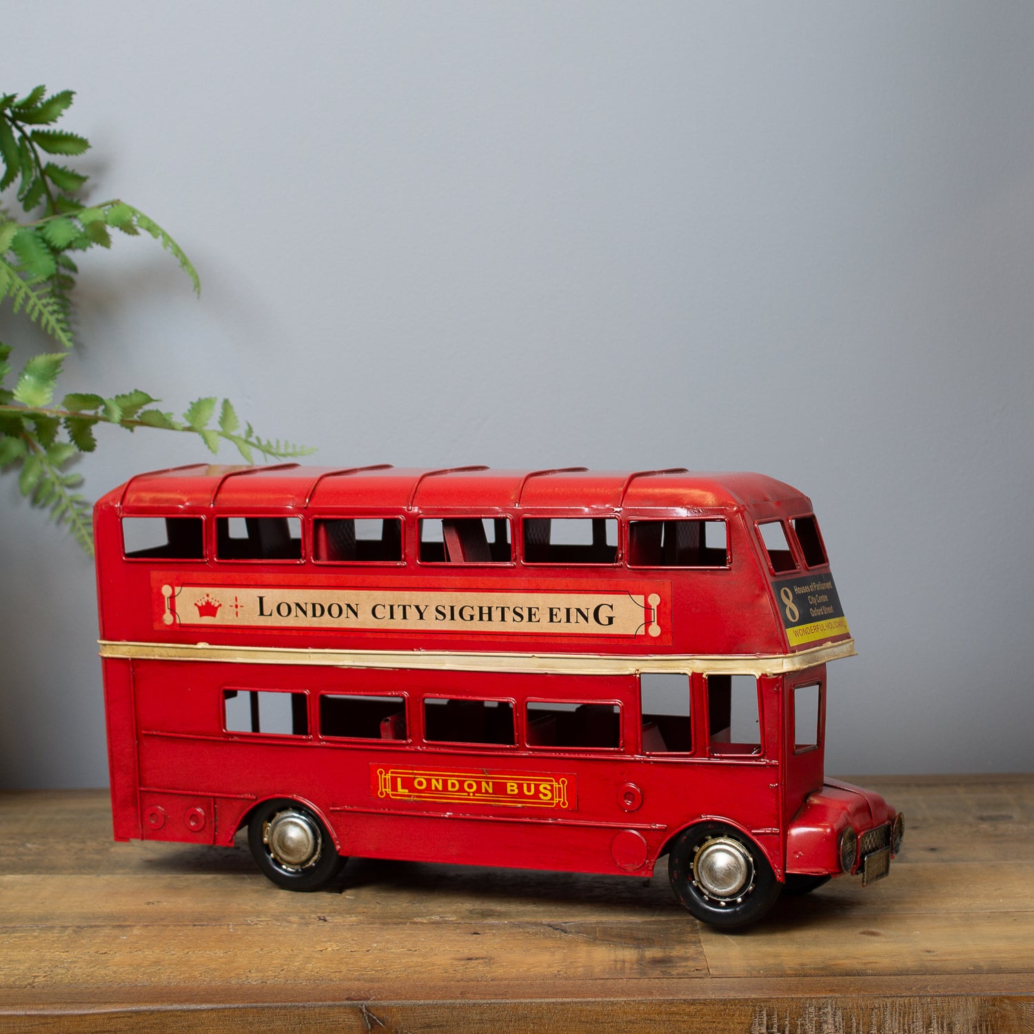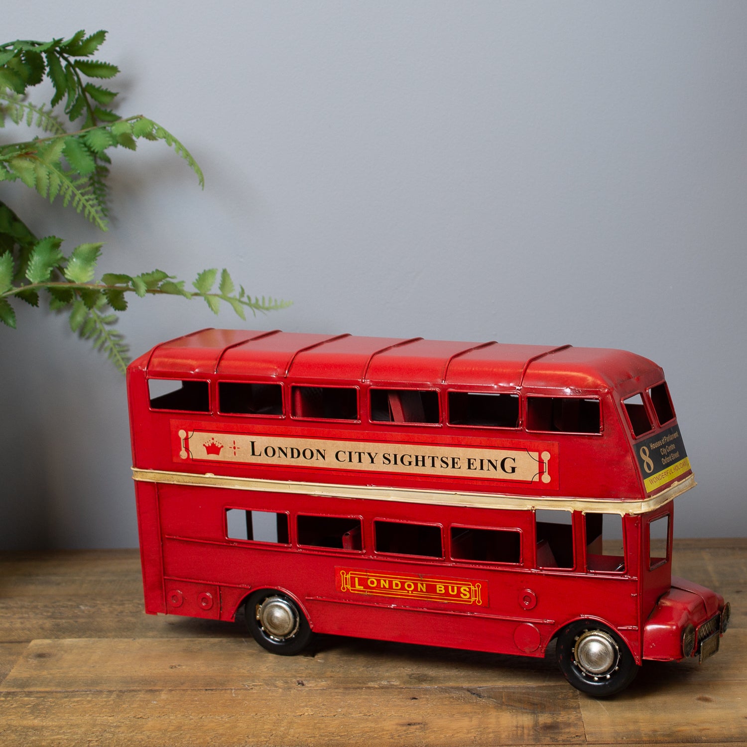 Expertly crafted from metal with a gently beaten, rustic finish, this vintage-inspired piece captures all the charm of the capital’s most beloved bus. Painted in classic London red, it features route numbers above the cab and tiny billboard-style adverts along the side—just like the real thing.