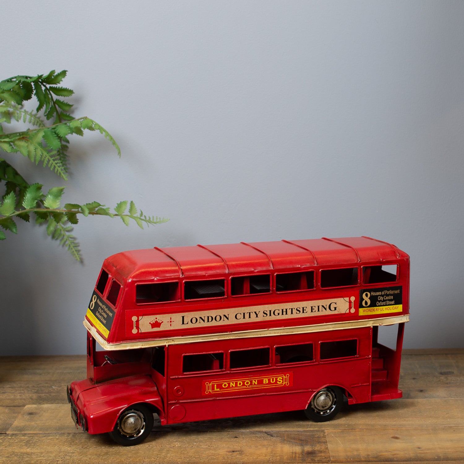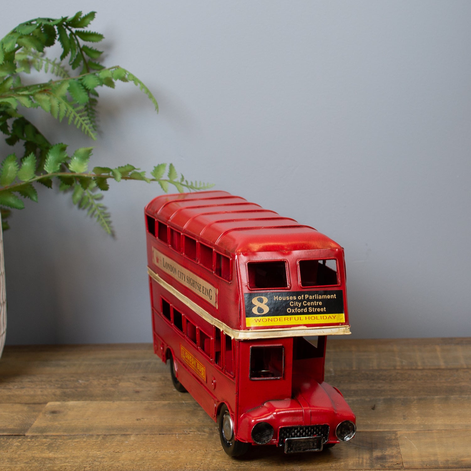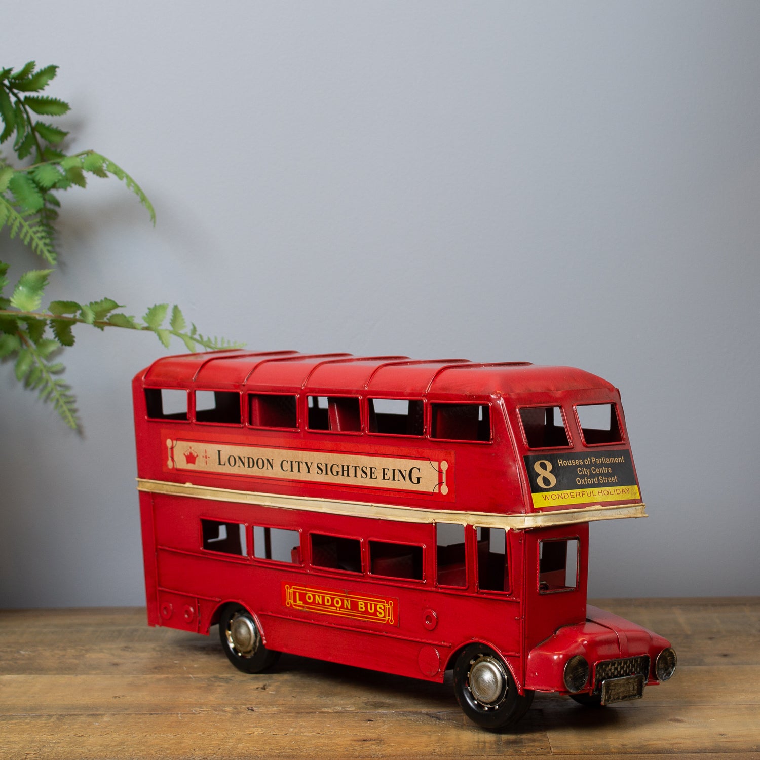 Expertly crafted from metal with a gently beaten, rustic finish, this vintage-inspired piece captures all the charm of the capital’s most beloved bus. Painted in classic London red, it features route numbers above the cab and tiny billboard-style adverts along the side—just like the real thing.