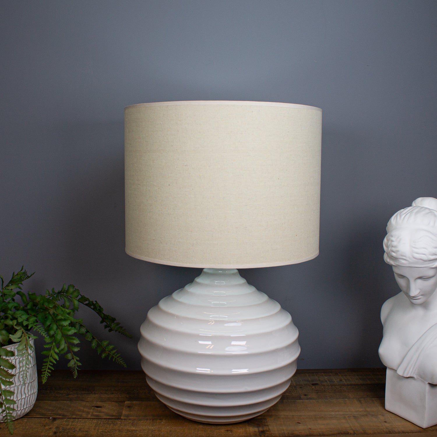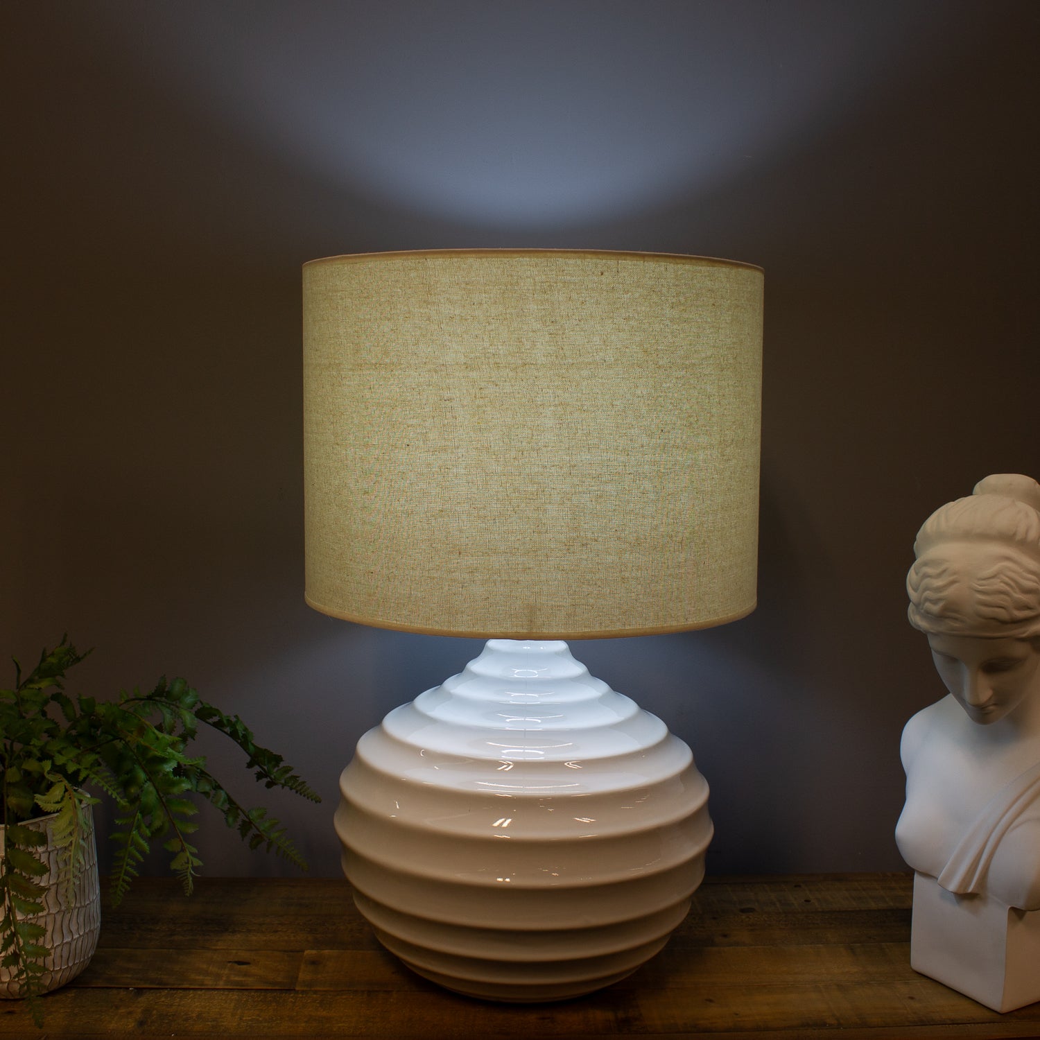The base’s subtle narrowing toward the neck enhances its soft, sculptural shape, while a neutral linen shade completes the look with understated charm. This piece brings a warm, ambient glow to any space — perfect for a hall console or lounge side table, where it can shine without shouting.