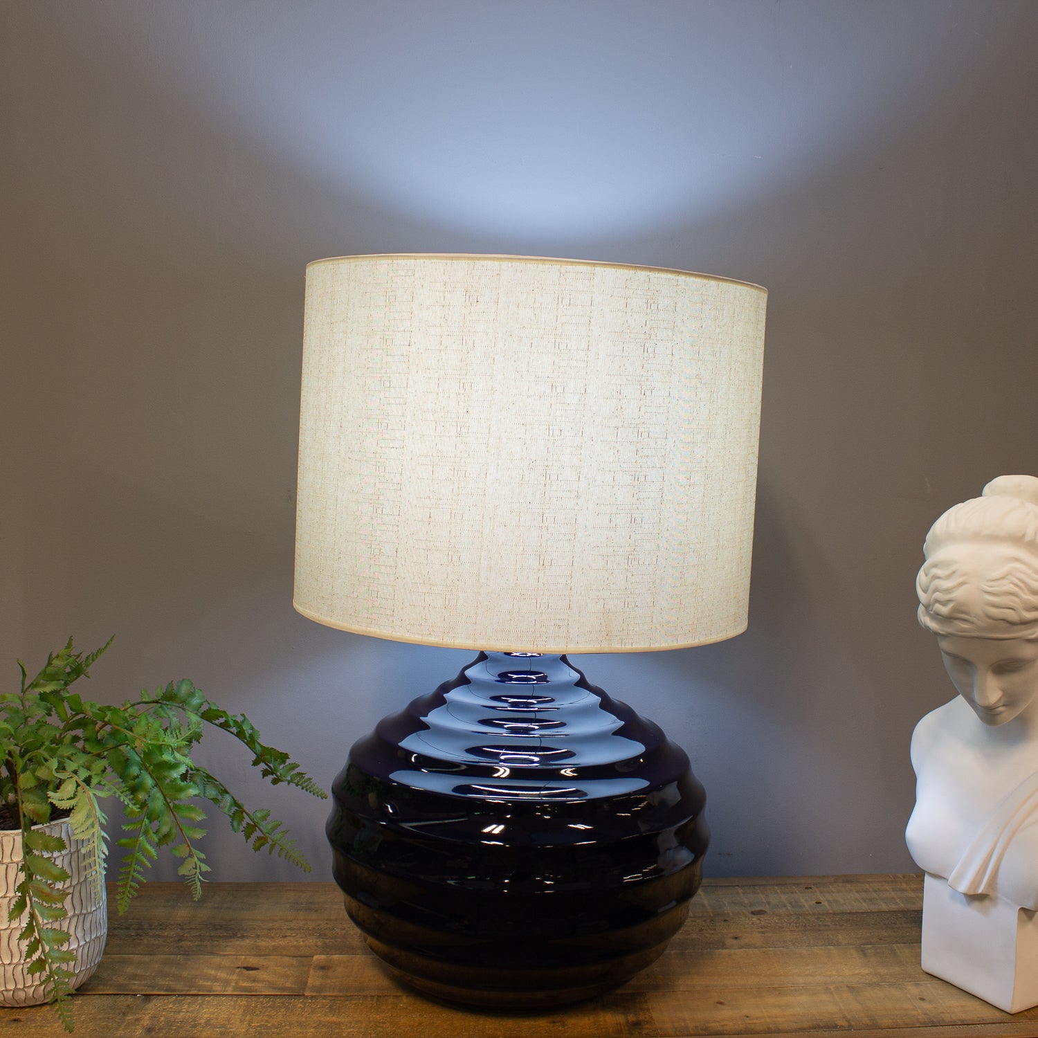 The base’s subtle narrowing toward the neck enhances its soft, sculptural shape, while a neutral linen shade completes the look with understated charm. This piece brings a warm, ambient glow to any space — perfect for a hall console or lounge side table, where it can shine without shouting.