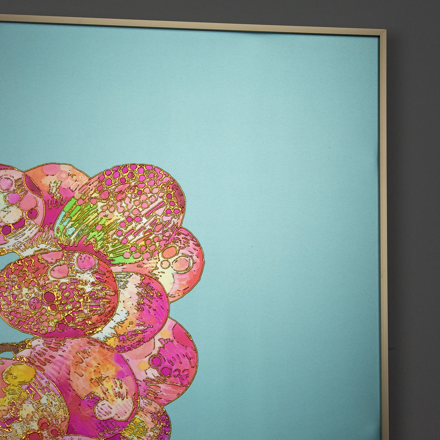 Printed on a matte metallic canvas, with a brushed metal frame the artwork exudes modern elegance, with subtle reflections that enhance its intricate details. Whether you’re a wine lover, foodie, or art enthusiast, this statement piece brings a bold, decadent touch to any contemporary space.