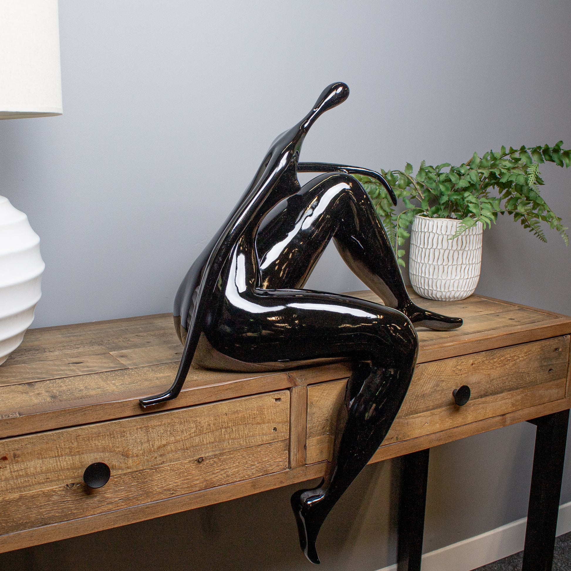 Designed to perch rather than sit neatly in place, the Relaxed Edge Muse Sculpture brings a sense of ease and informality to sculptural décor. The figure is shown seated in a laid-back pose, one leg hanging freely over the edge of a shelf while the other bends comfortably, the body leaning into a moment of rest. It feels natural, unforced and quietly expressive.