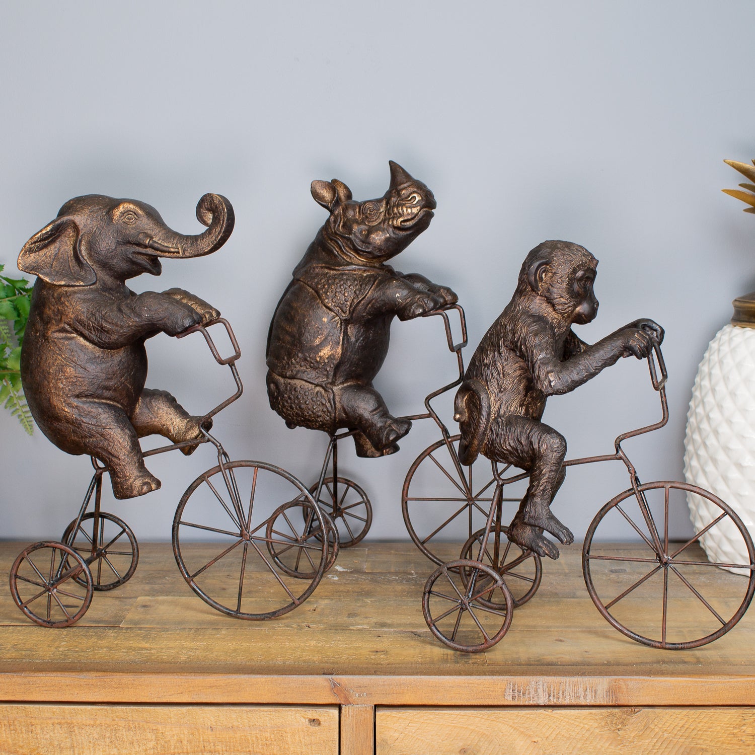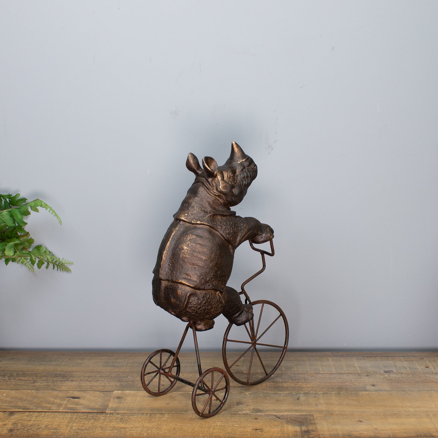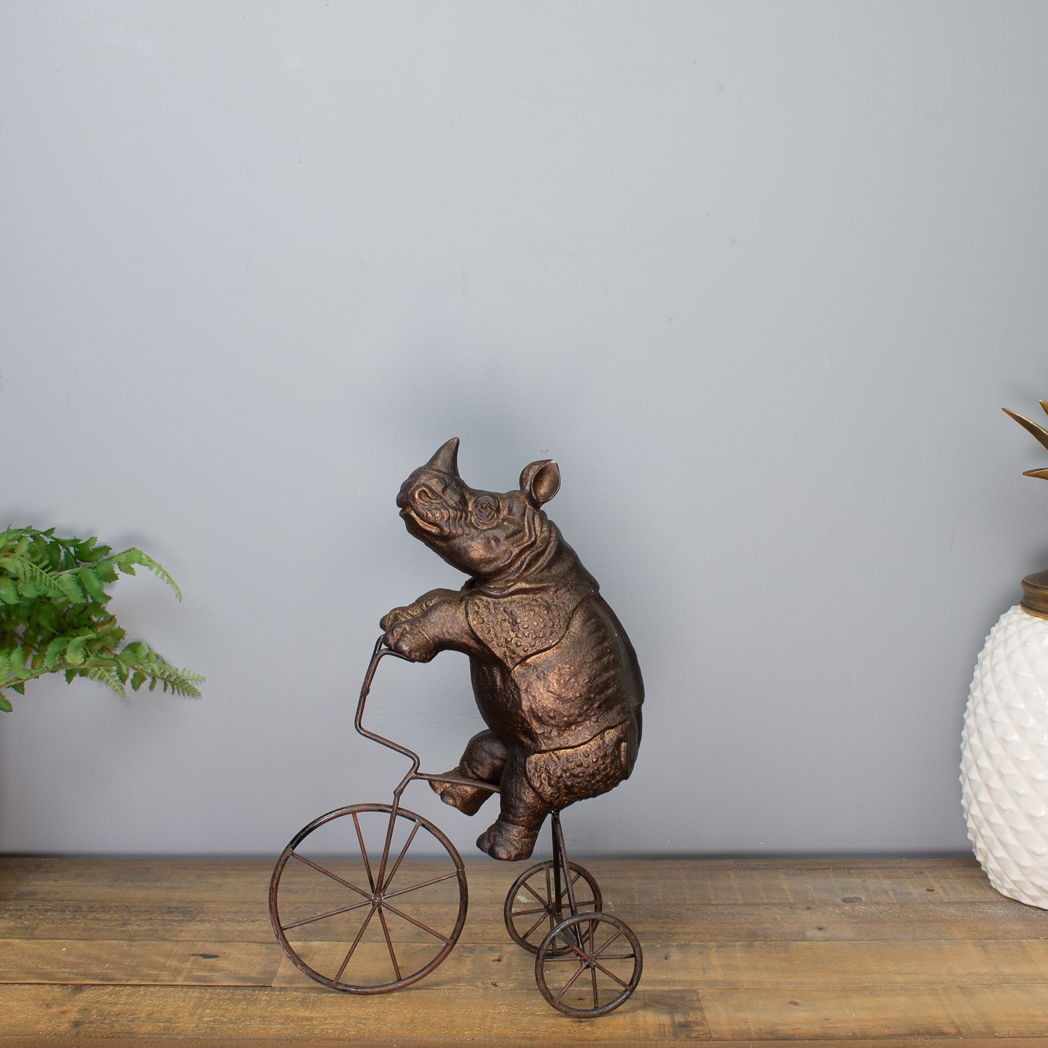 Let the Rhino on Tricycle Sculpture roll into your space with bold energy and cheeky charm—a celebration of imagination, contrast, and creative décor.