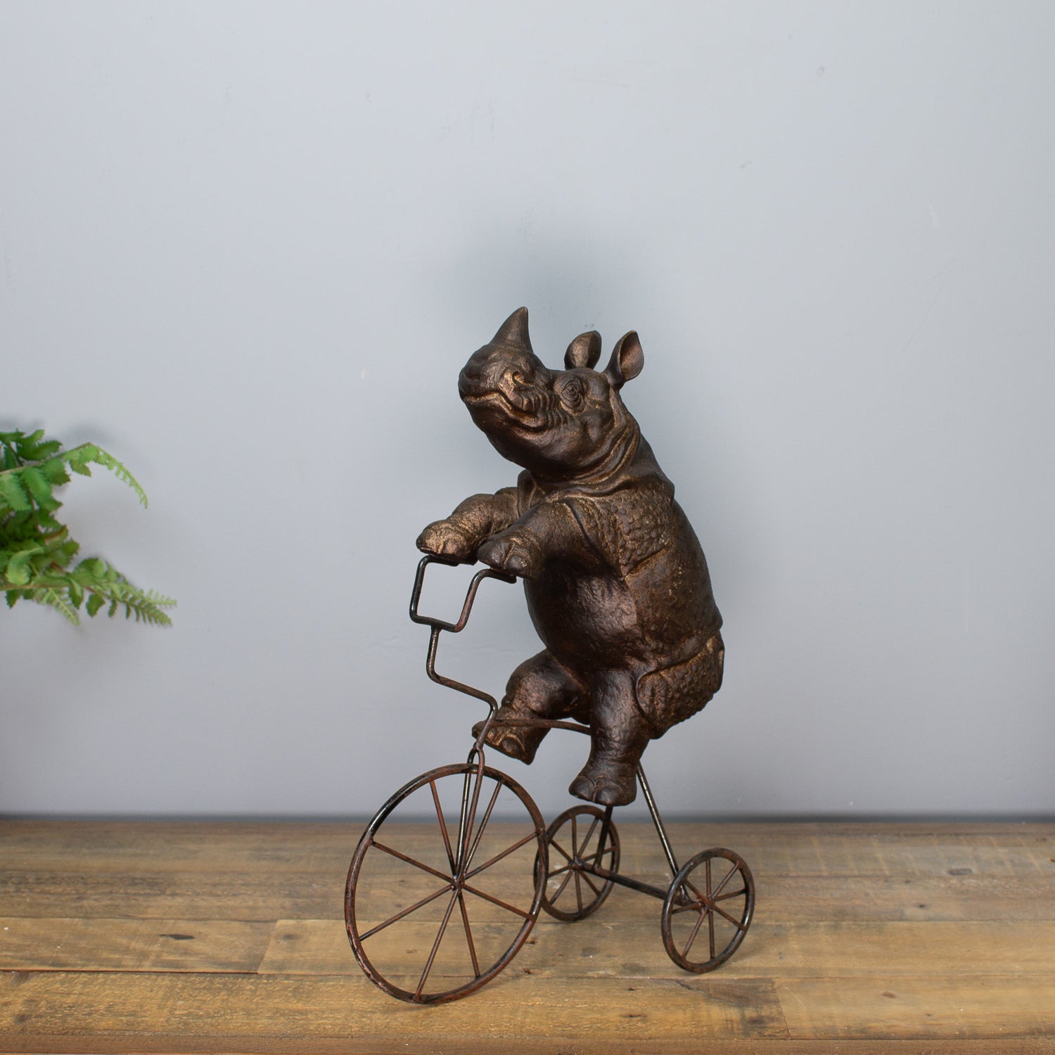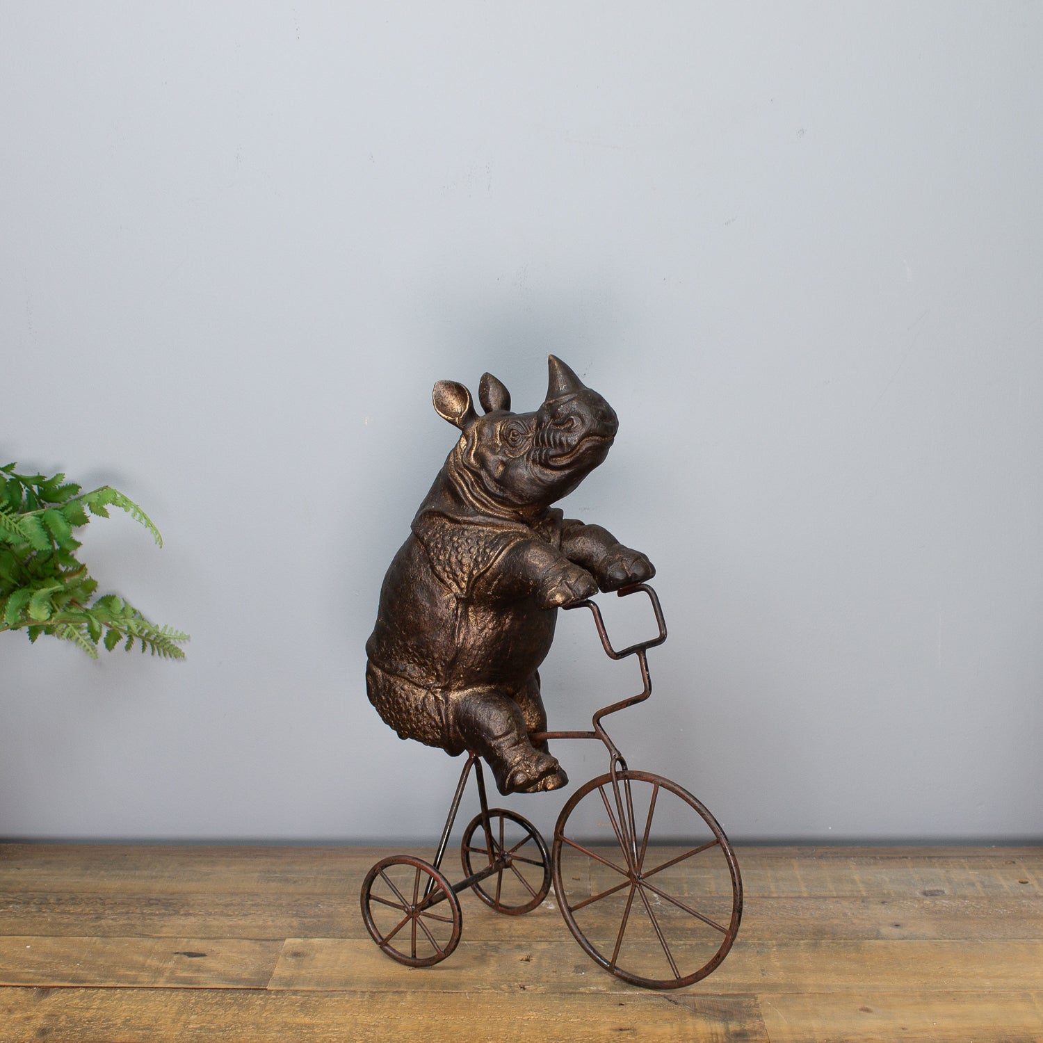 Bring a dose of unexpected humour and charm to your décor with this quirky Rhino on a Tricycle Sculpture. Crafted from textured resin, the powerful rhino is captured mid-ride on a vintage-style metal tricycle, blending strength and silliness in one unforgettable piece.