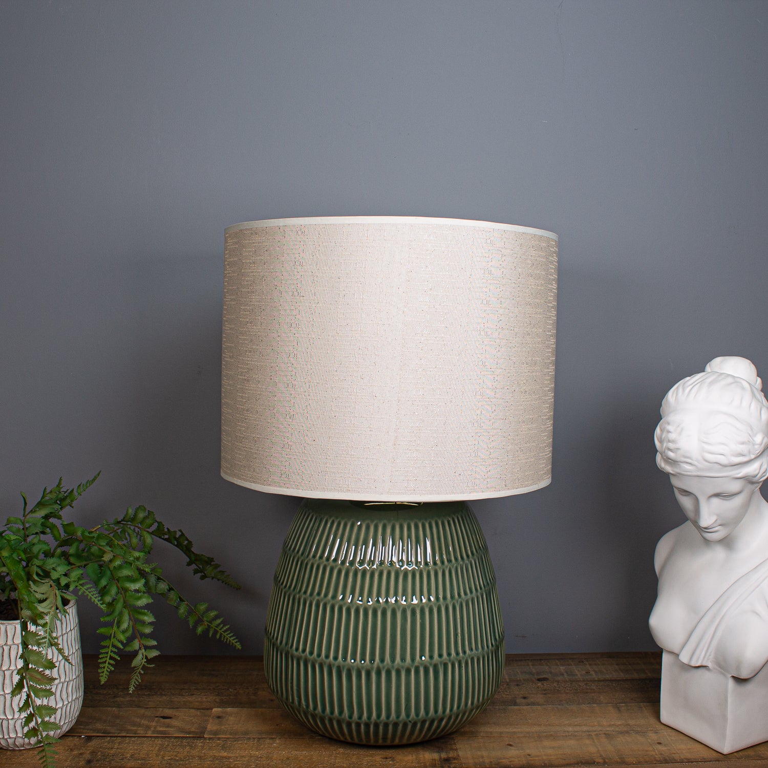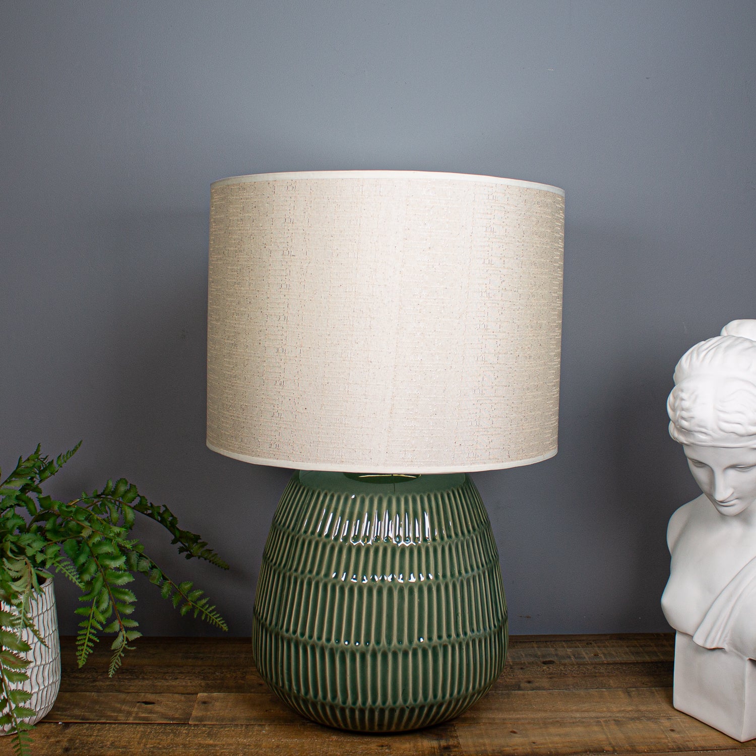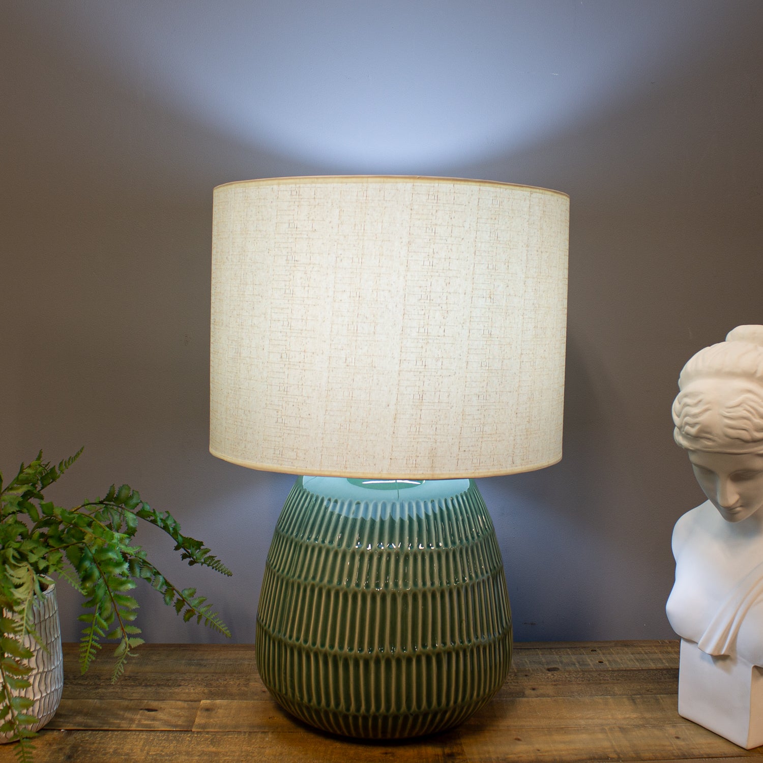 Paired with a neutral linen shade, this lamp is ideal for adding a cosy, ambient glow to a lounge or hallway console, bringing texture, tone, and character into any modern setting.