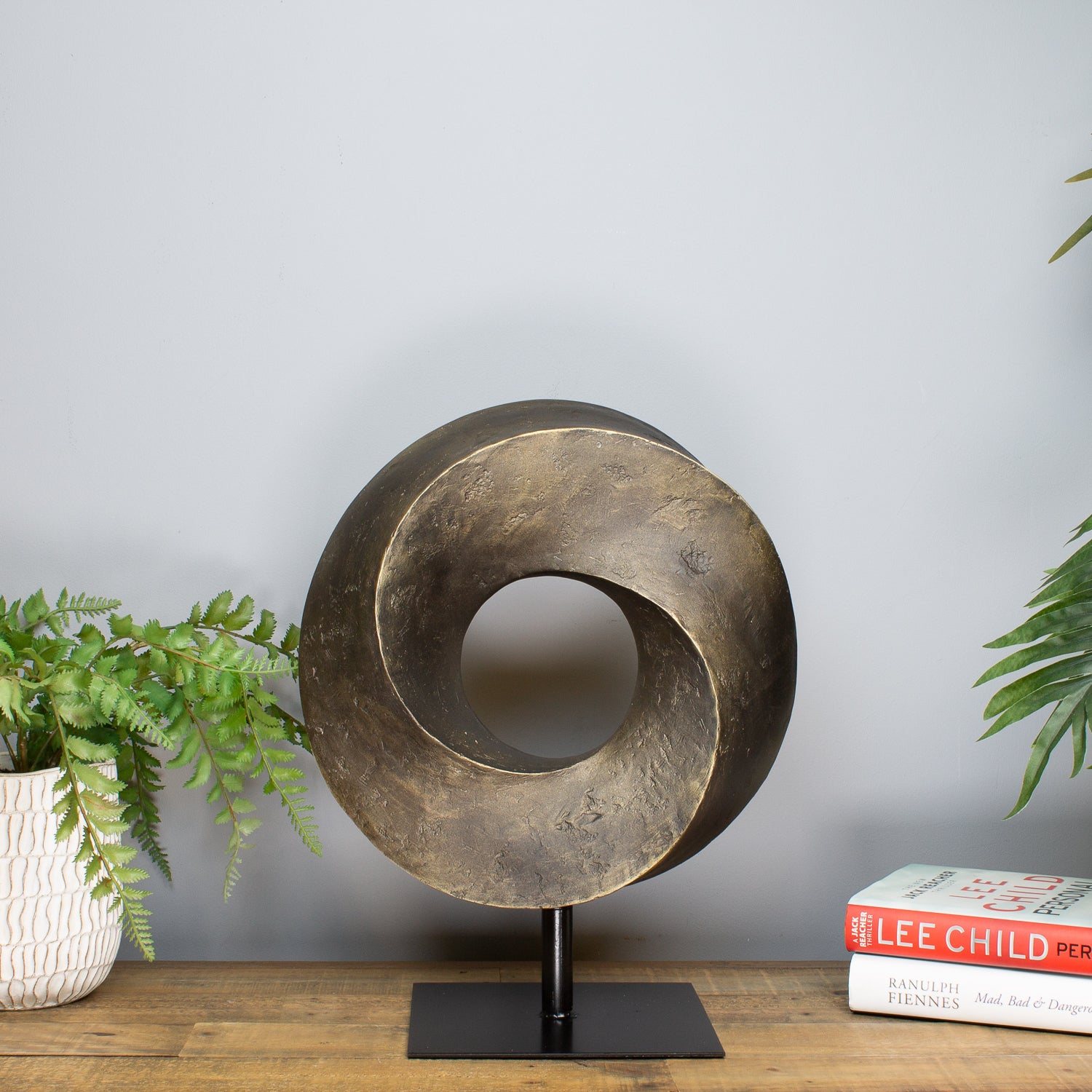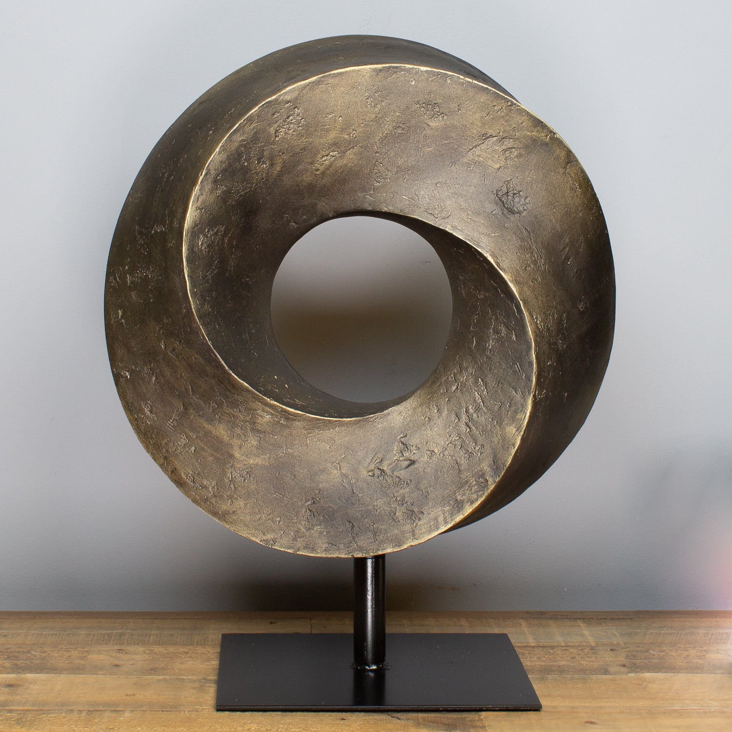 Elevate your space with the Round Ribbon Sculpture, a beautifully crafted piece that captures the elegance of fluid motion in a continuous loop. Made from bronze-coloured resin, its smooth, swirling form brings a sense of harmony, unity, and refined modern style.