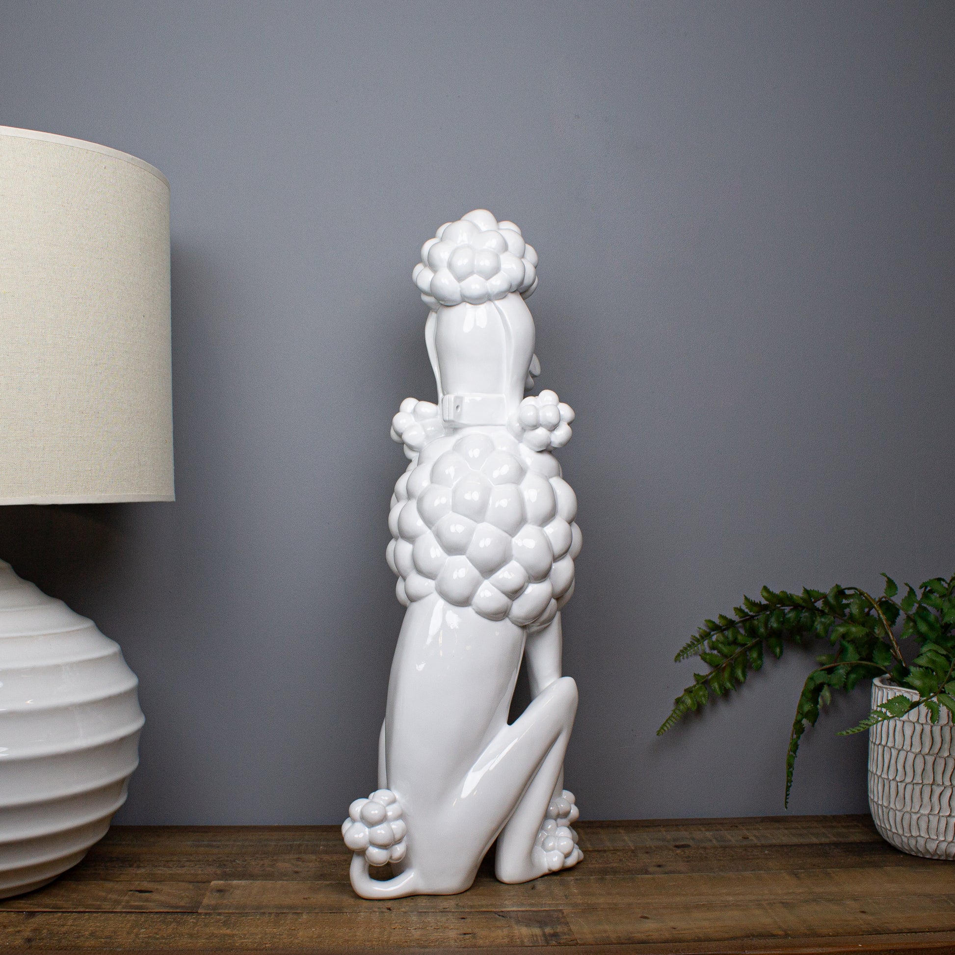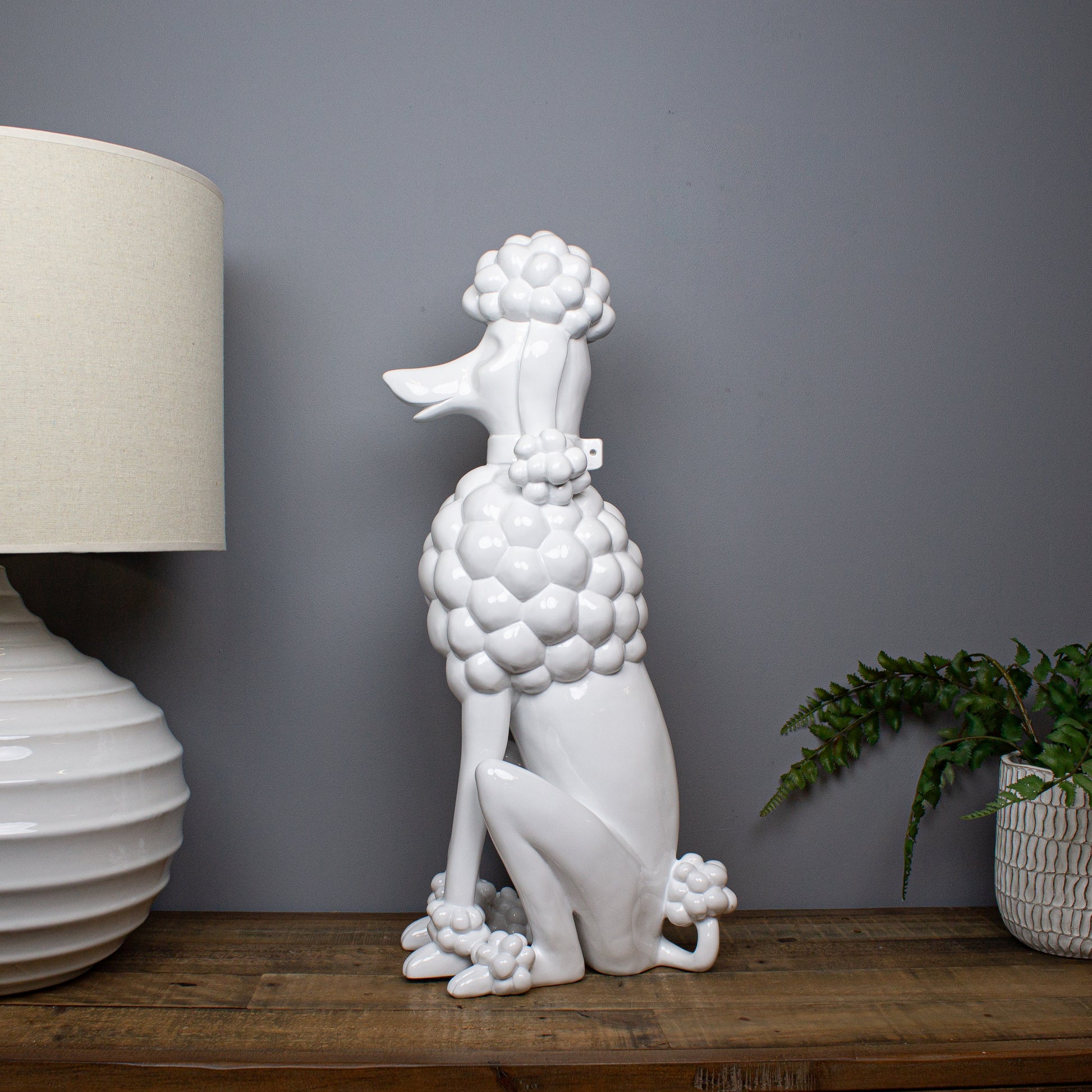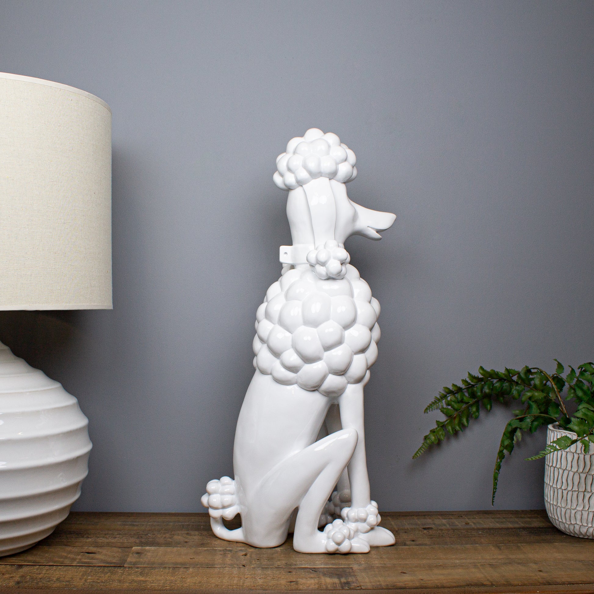 Elegant, playful and quietly confident, the Gloss White Giant Poodle Sculpture offers a softer take on a boldly sculptural form. Shown seated and trimmed in classic poodle style, the clean lines and generous proportions give the piece a strong presence, while the crisp white finish keeps it feeling refined and contemporary.
