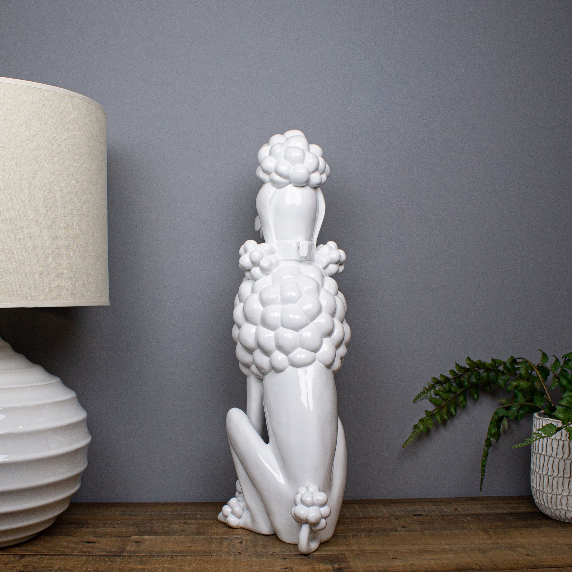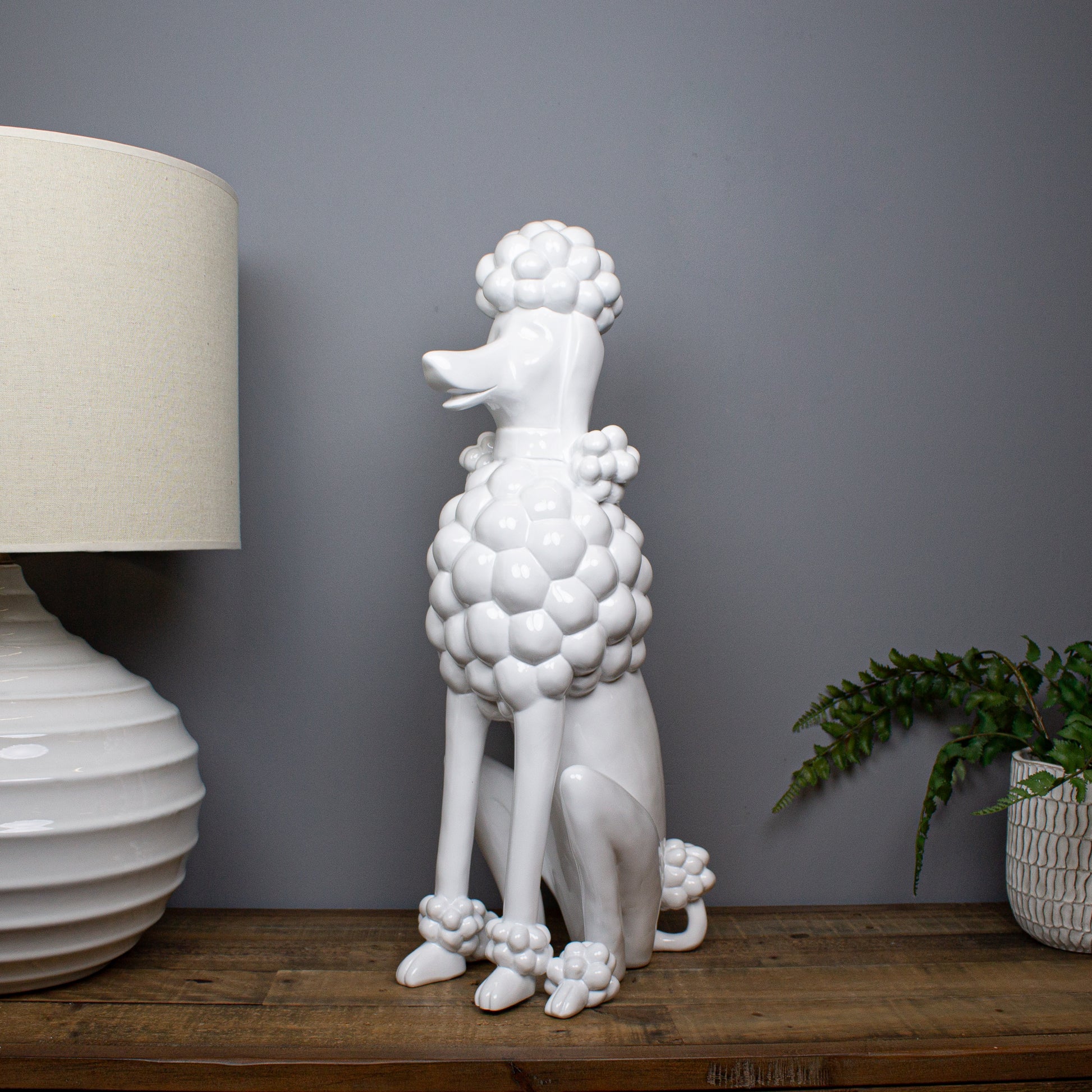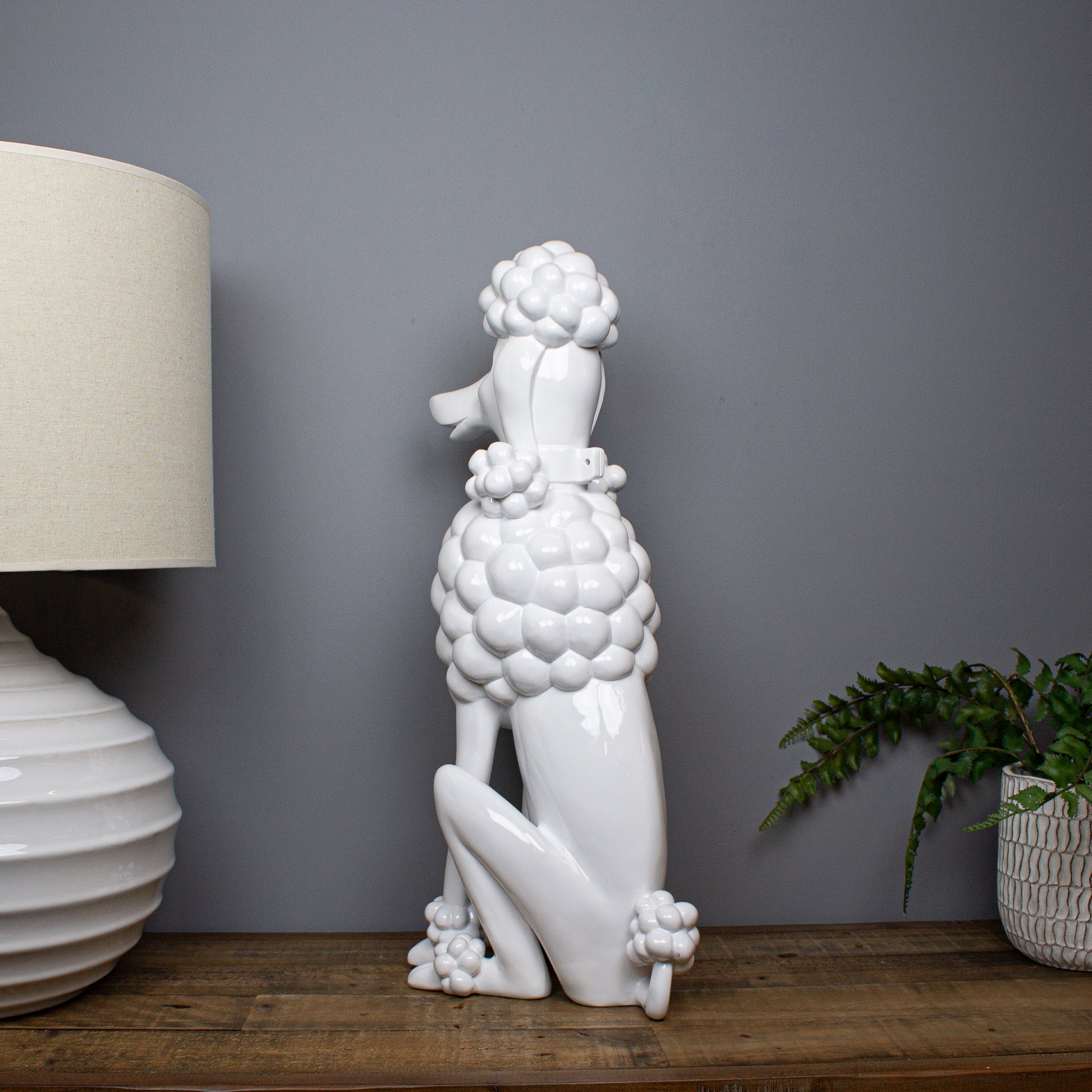 Elegant, playful and quietly confident, the Gloss White Giant Poodle Sculpture offers a softer take on a boldly sculptural form. Shown seated and trimmed in classic poodle style, the clean lines and generous proportions give the piece a strong presence, while the crisp white finish keeps it feeling refined and contemporary.