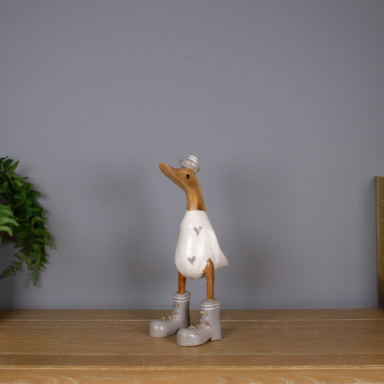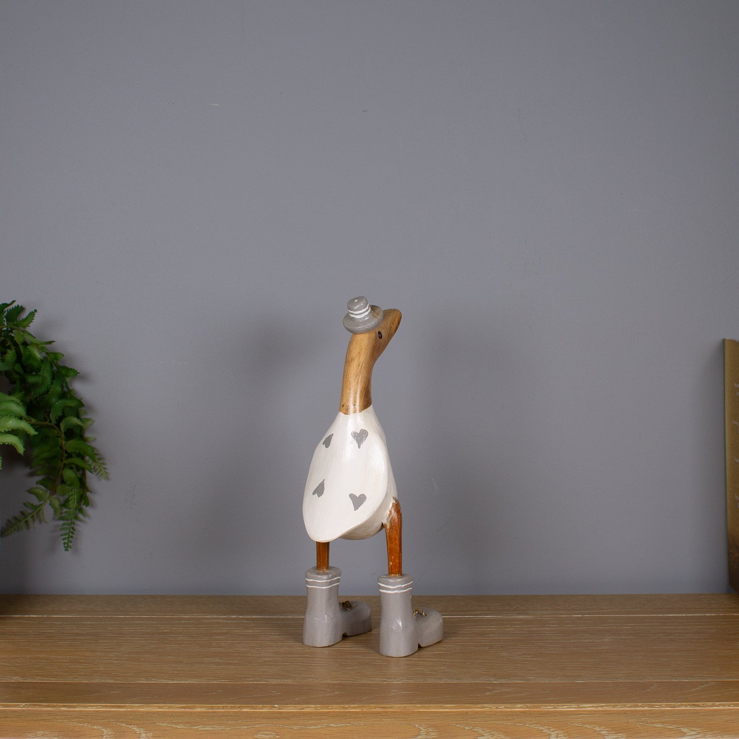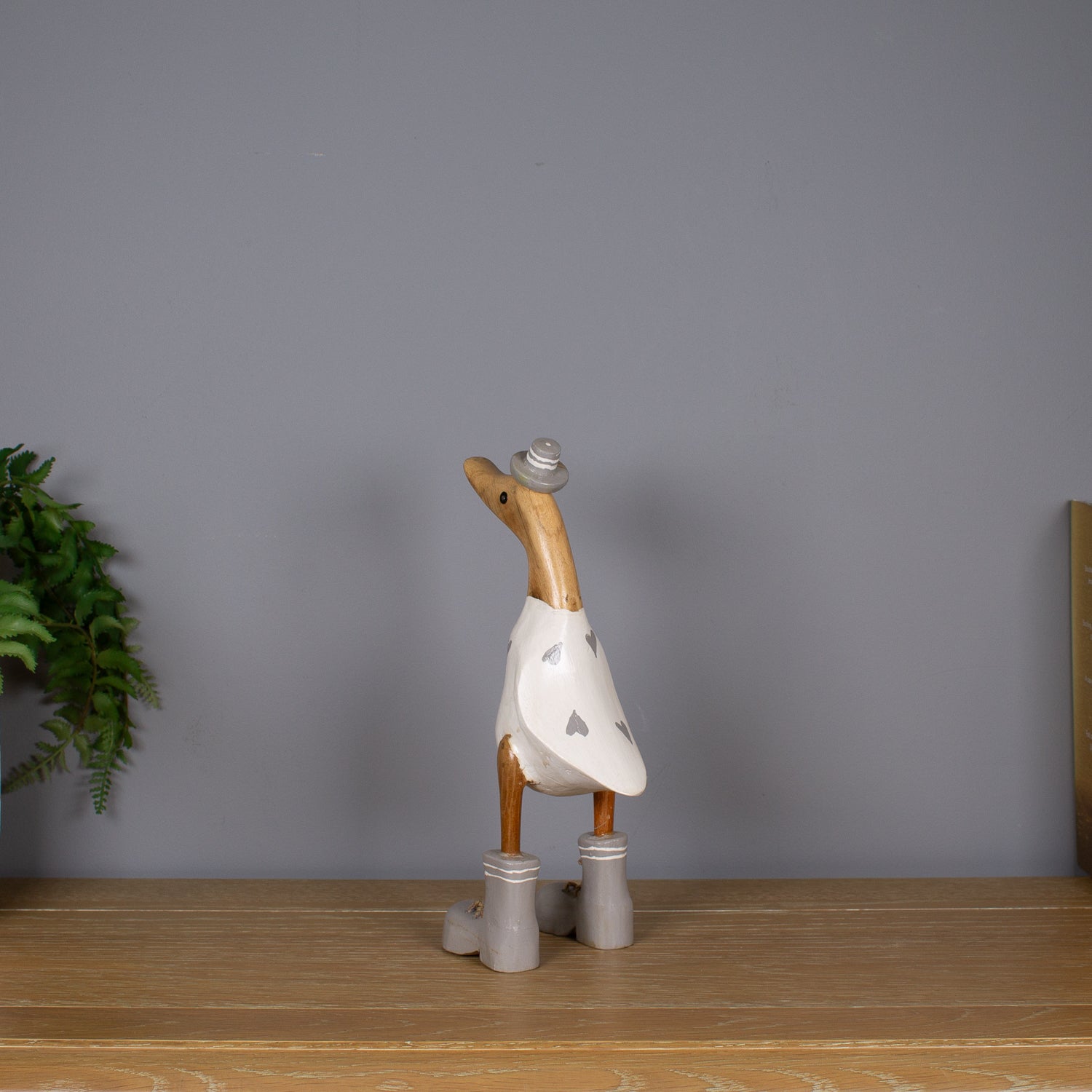 Hand-carved from sustainable bamboo and painted in a soft white coat adorned with pale grey hearts, this adorable duck comes complete with matching grey boots and a stylish hat—ready to brighten up your hallway, nursery, or bedside with her gentle charm.