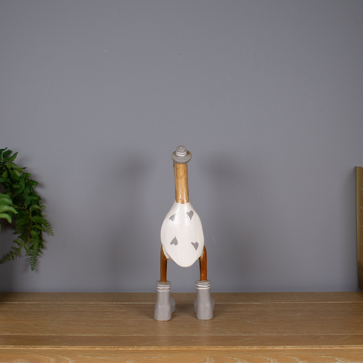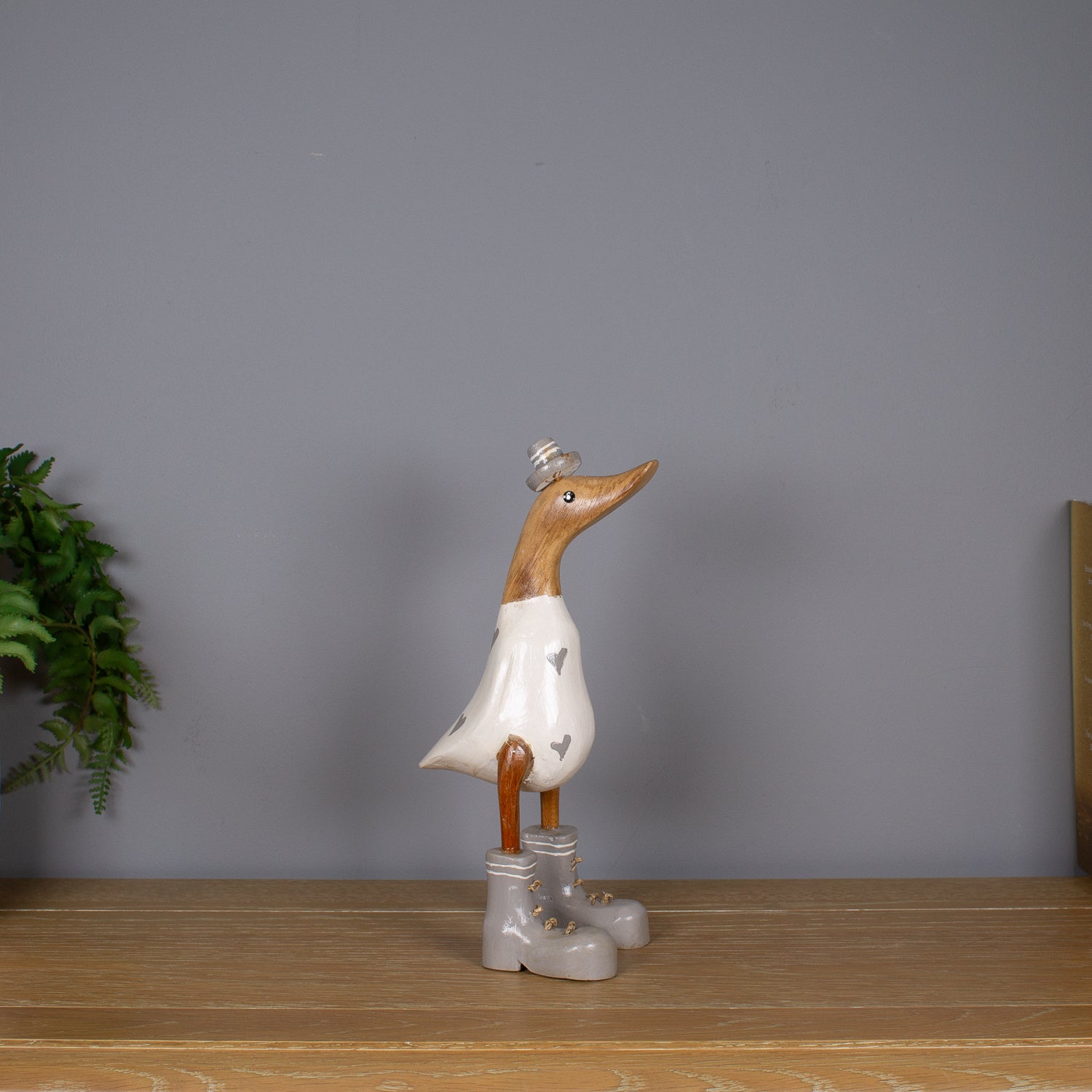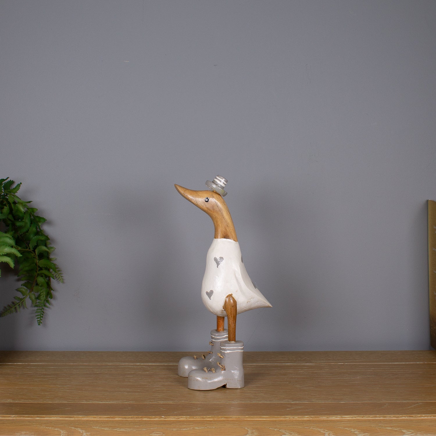 Hand-carved from sustainable bamboo and painted in a soft white coat adorned with pale grey hearts, this adorable duck comes complete with matching grey boots and a stylish hat—ready to brighten up your hallway, nursery, or bedside with her gentle charm.