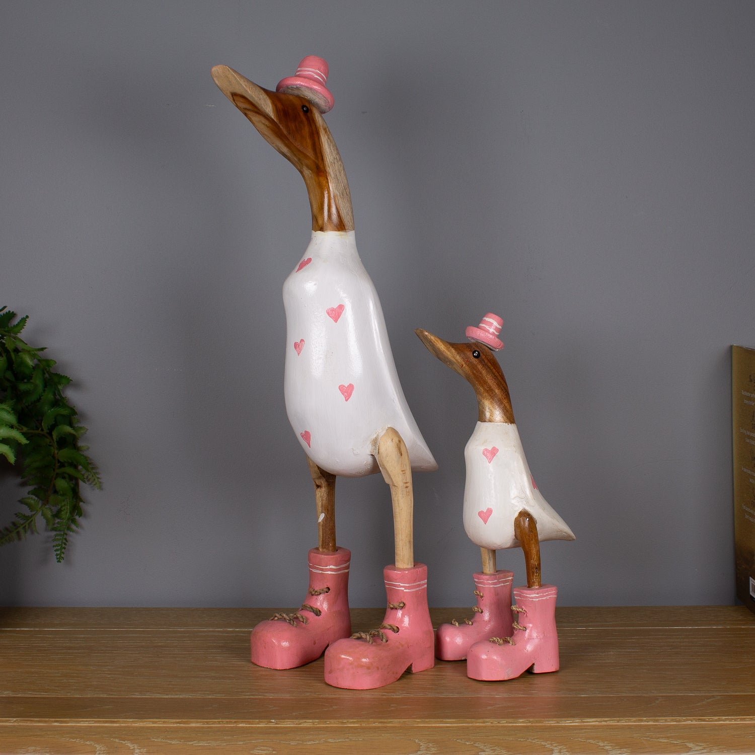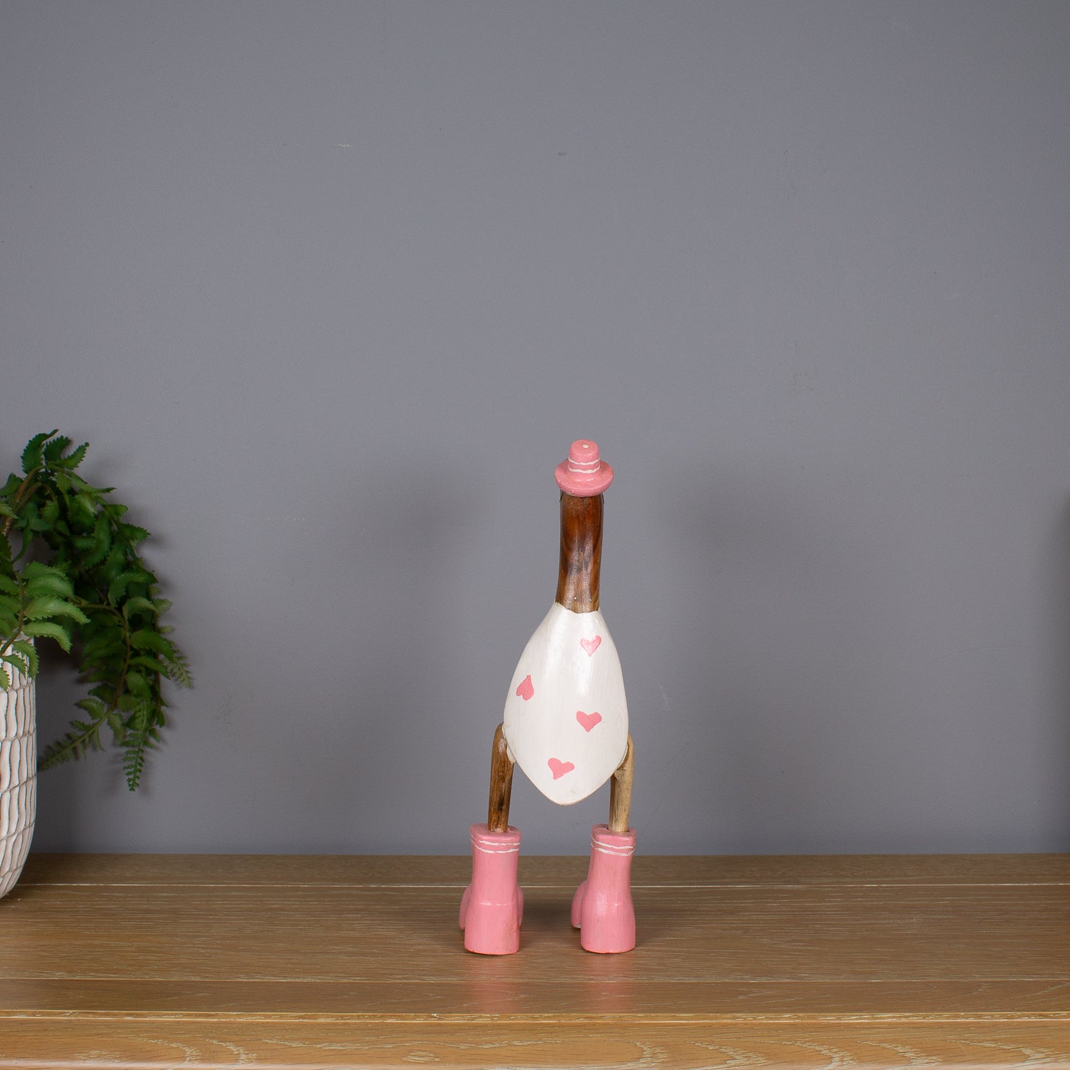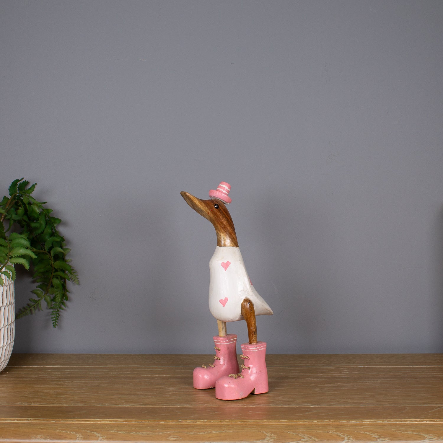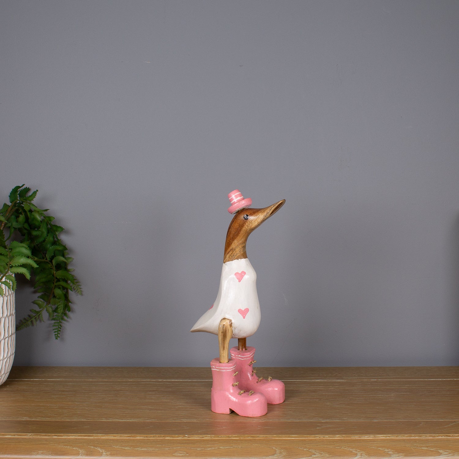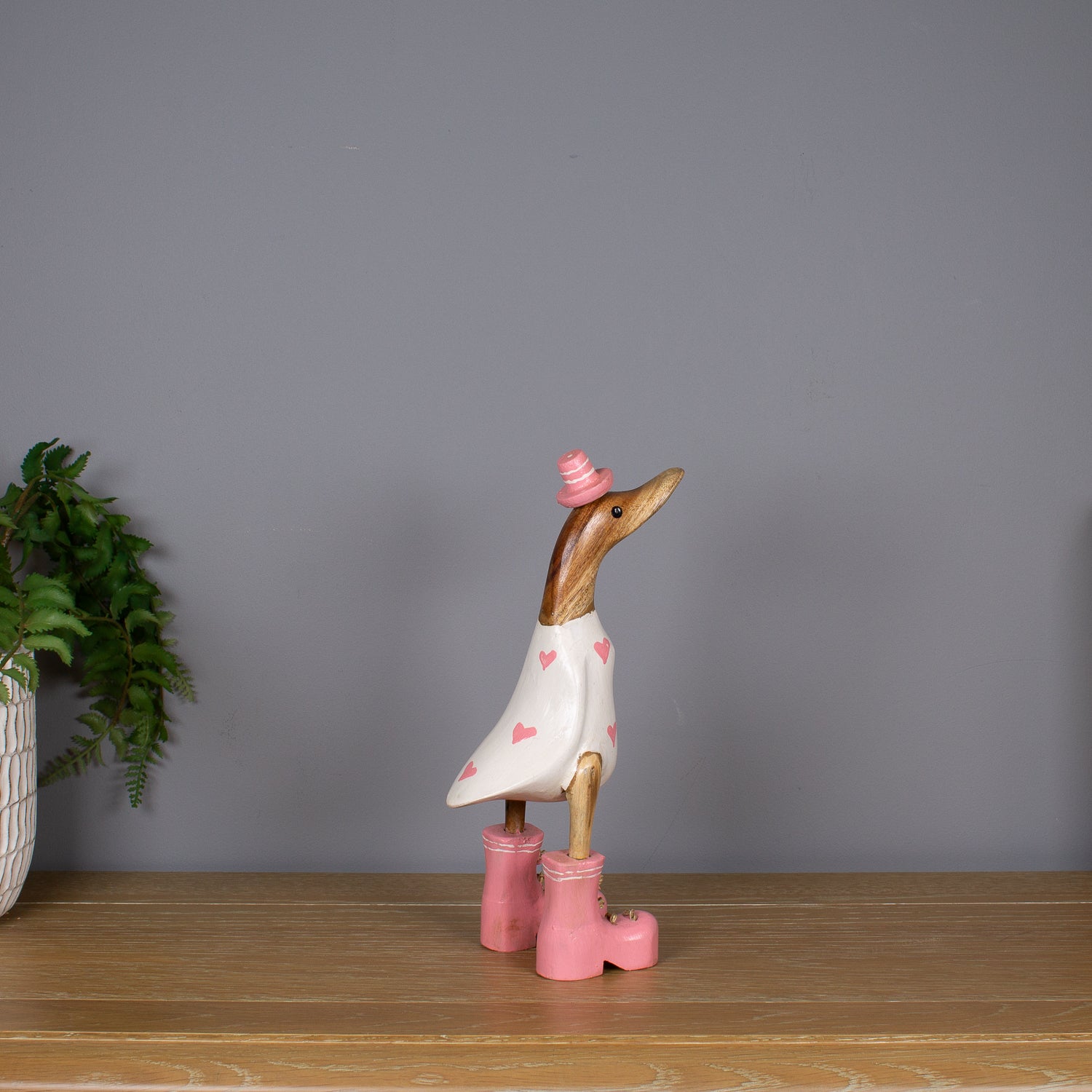 Hand-carved from sustainable bamboo and painted in a soft white coat adorned with pastel pink hearts, this adorable duck comes complete with matching pink boots and a stylish hat—ready to brighten up your hallway, nursery, or bedside with her gentle charm.