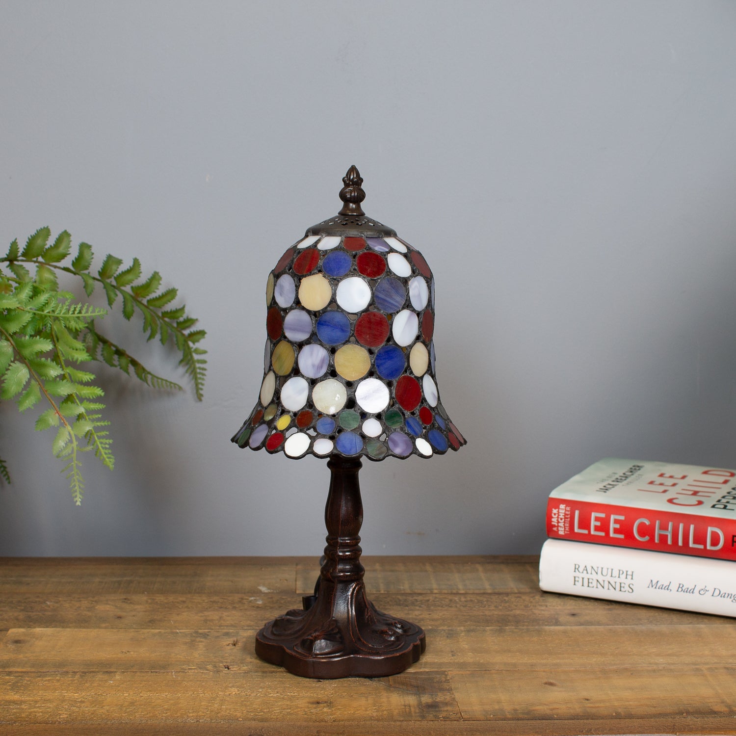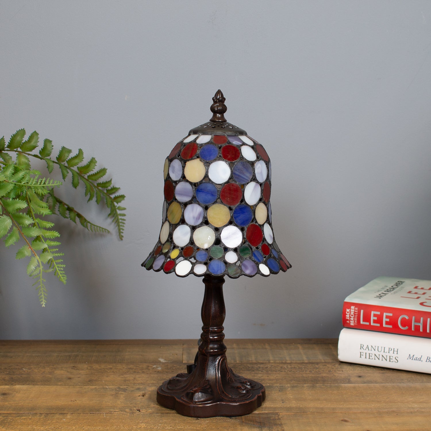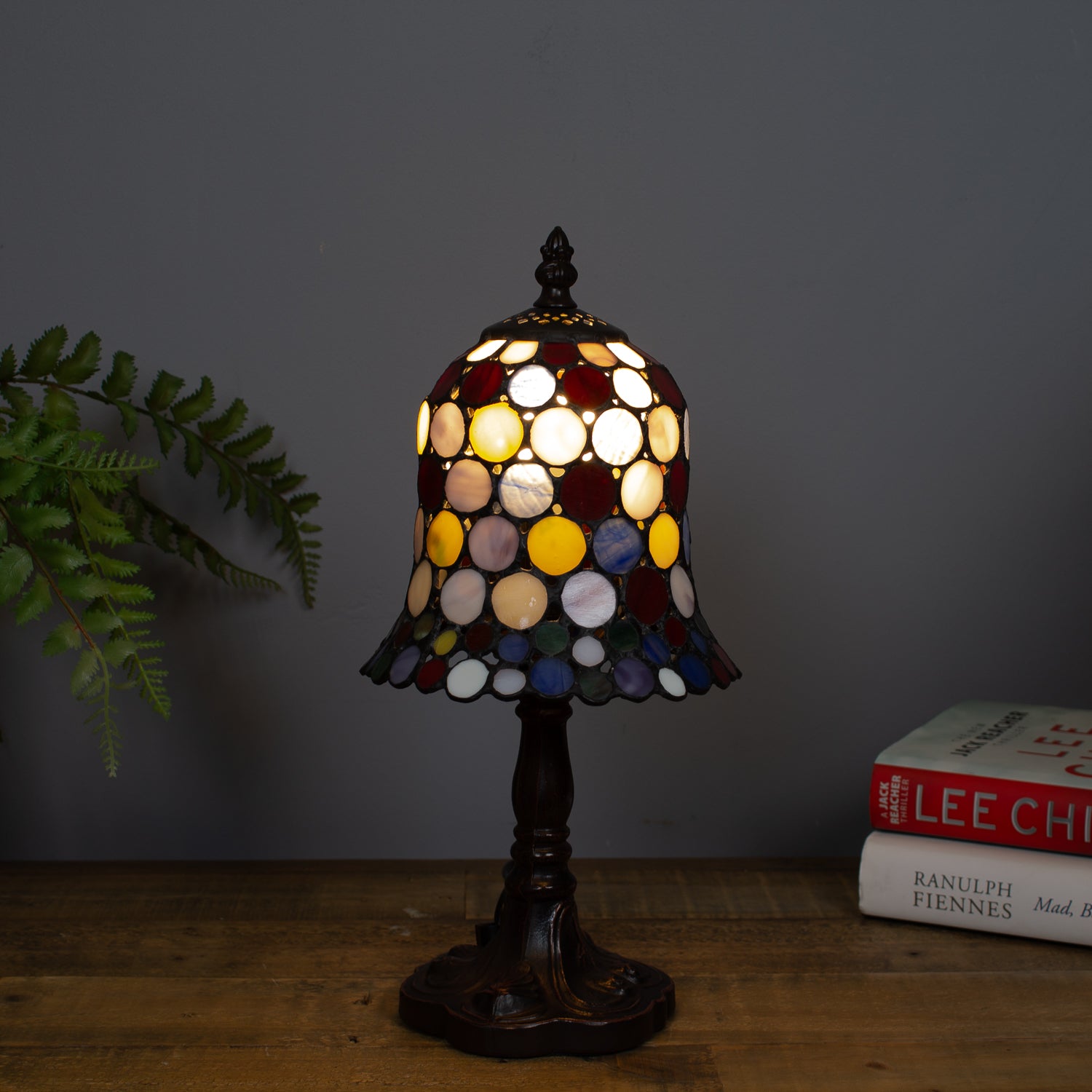 Bring a touch of vintage charm and vibrant colour to your home with our Spot Design Tiffany Lamp. With its beautiful bell-shaped shade crafted from favrile stained glass in a playful multi-coloured spot design, this compact table lamp is the perfect little statement piece. Whether on a bedside, hallway console or tucked in a cosy reading nook, it casts a warm, ambient glow thatβs pure magic when lit.