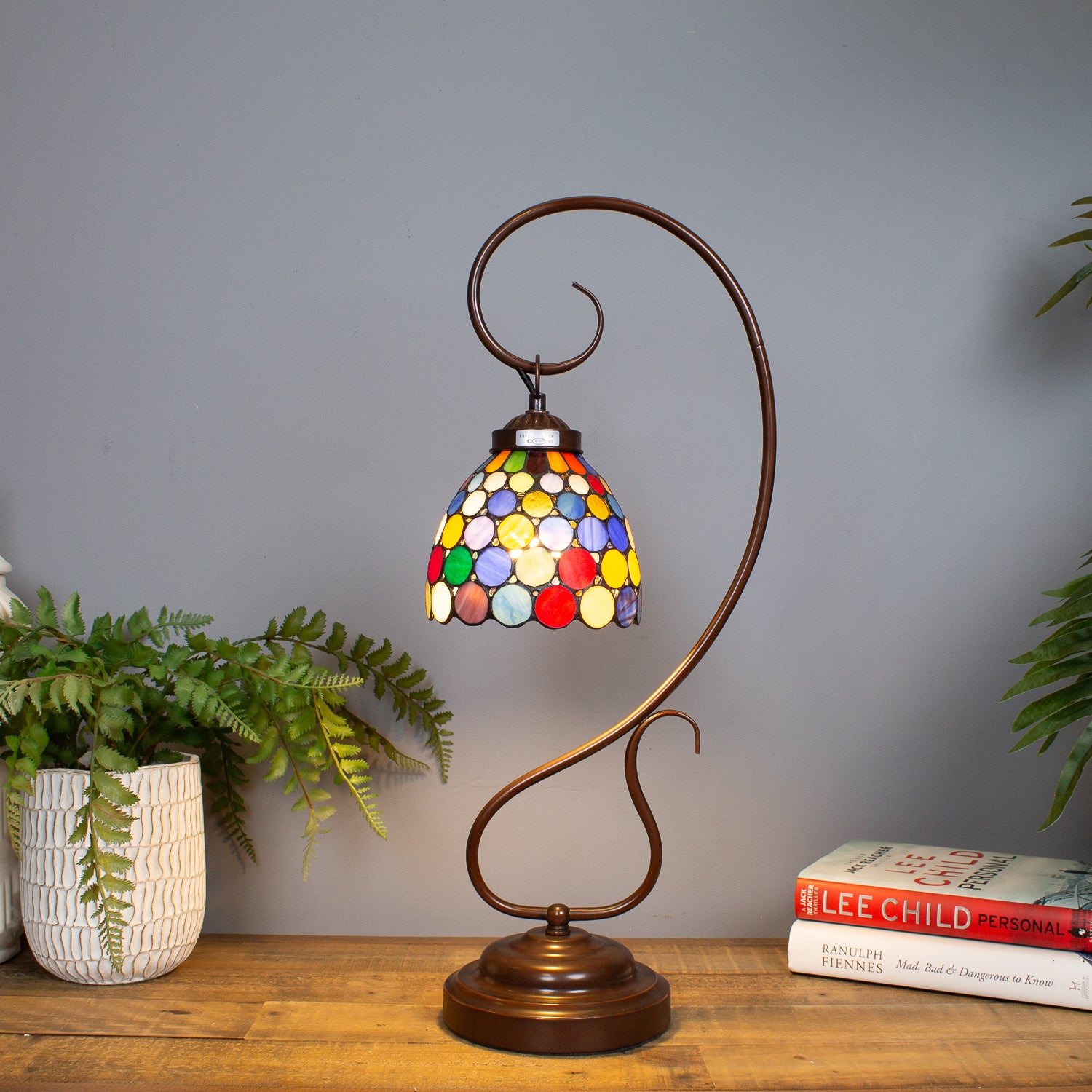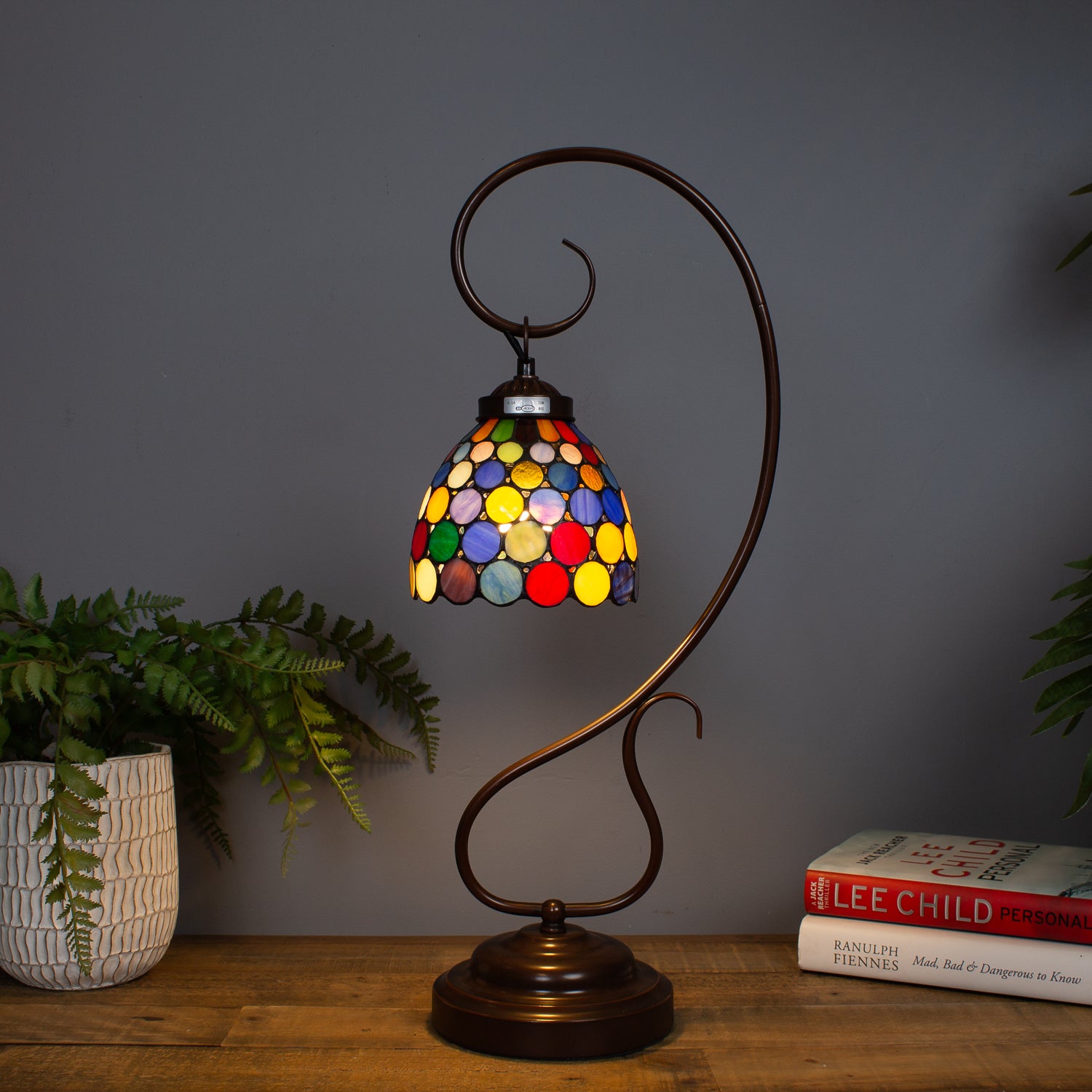The hand-cut stained glass shade showcases a stunning multicoloured spot design, casting a warm, jewel-toned glow when lit β perfect for creating ambient lighting with artistic flair. Whether perched on a console, bedside, or reading nook, this lamp is ready to turn heads.