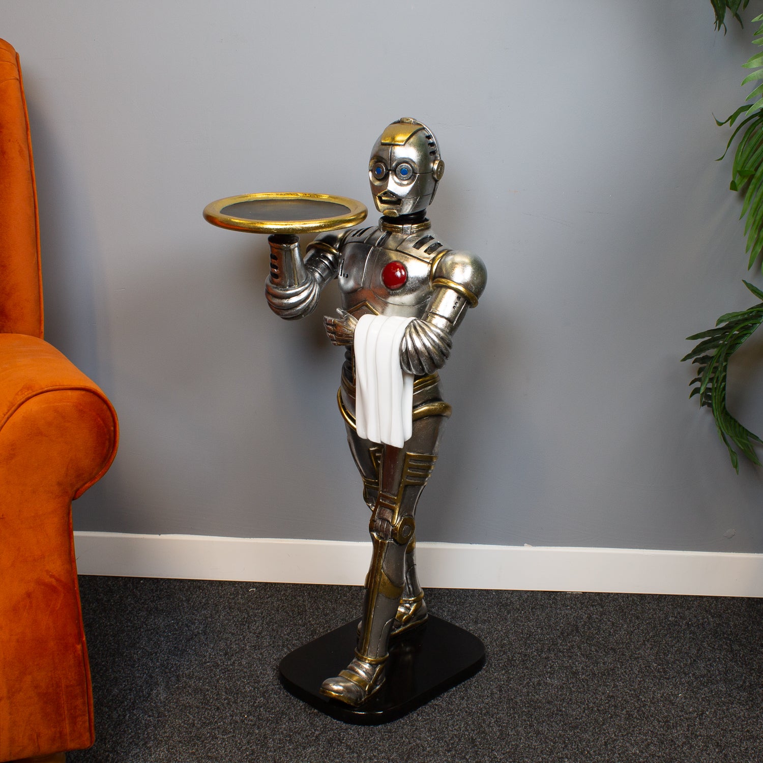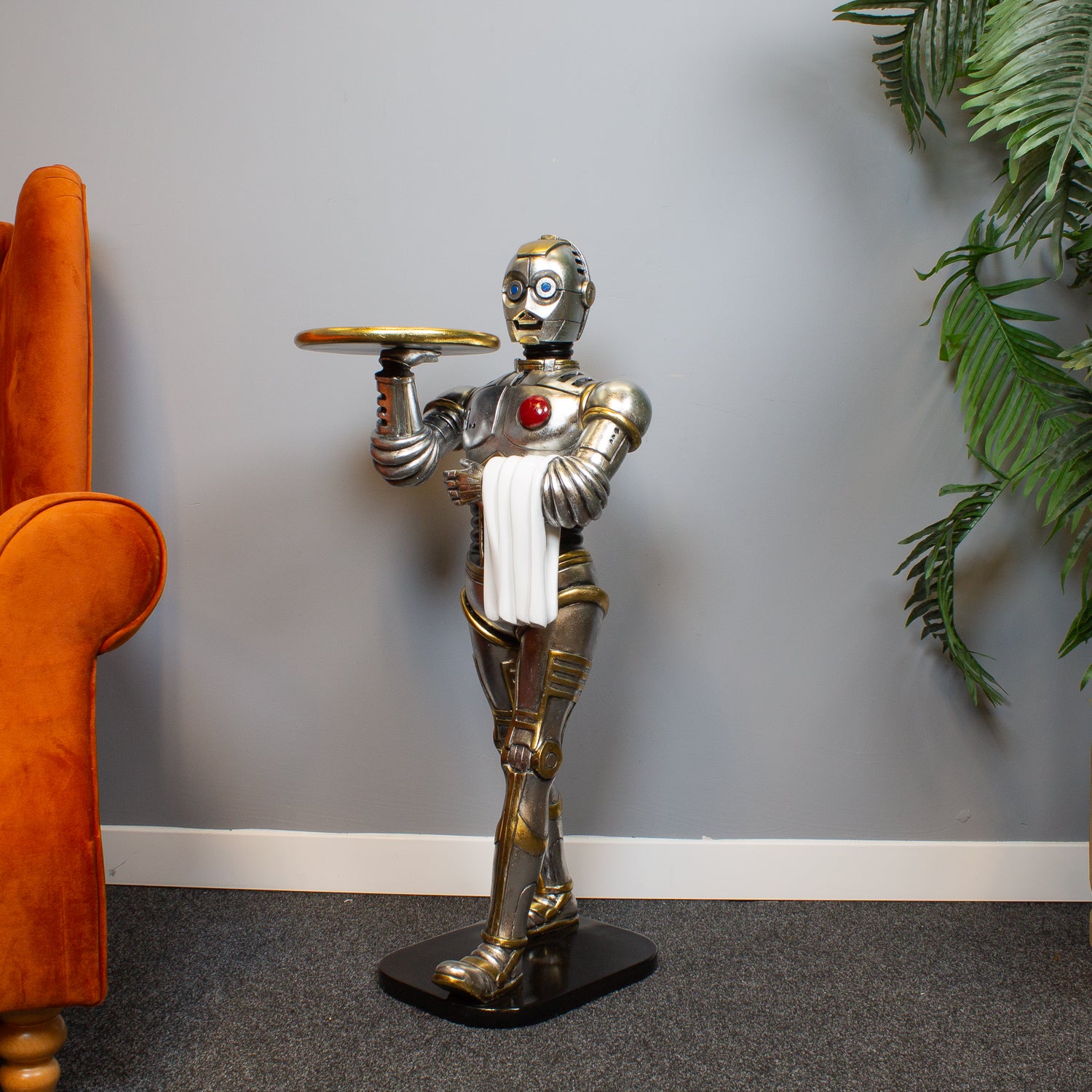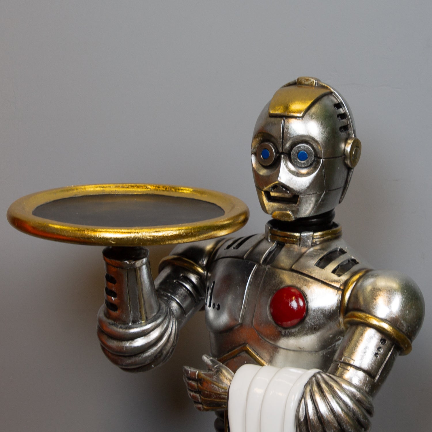 Crafted from durable polyresin and painted in a sleek silver finish, this futuristic figure takes its design cues from classic androids and iconic sci-fi styling. Whether he's serving up drinks, holding your gadgets, or simply stealing the spotlight, he's guaranteed to spark conversation.