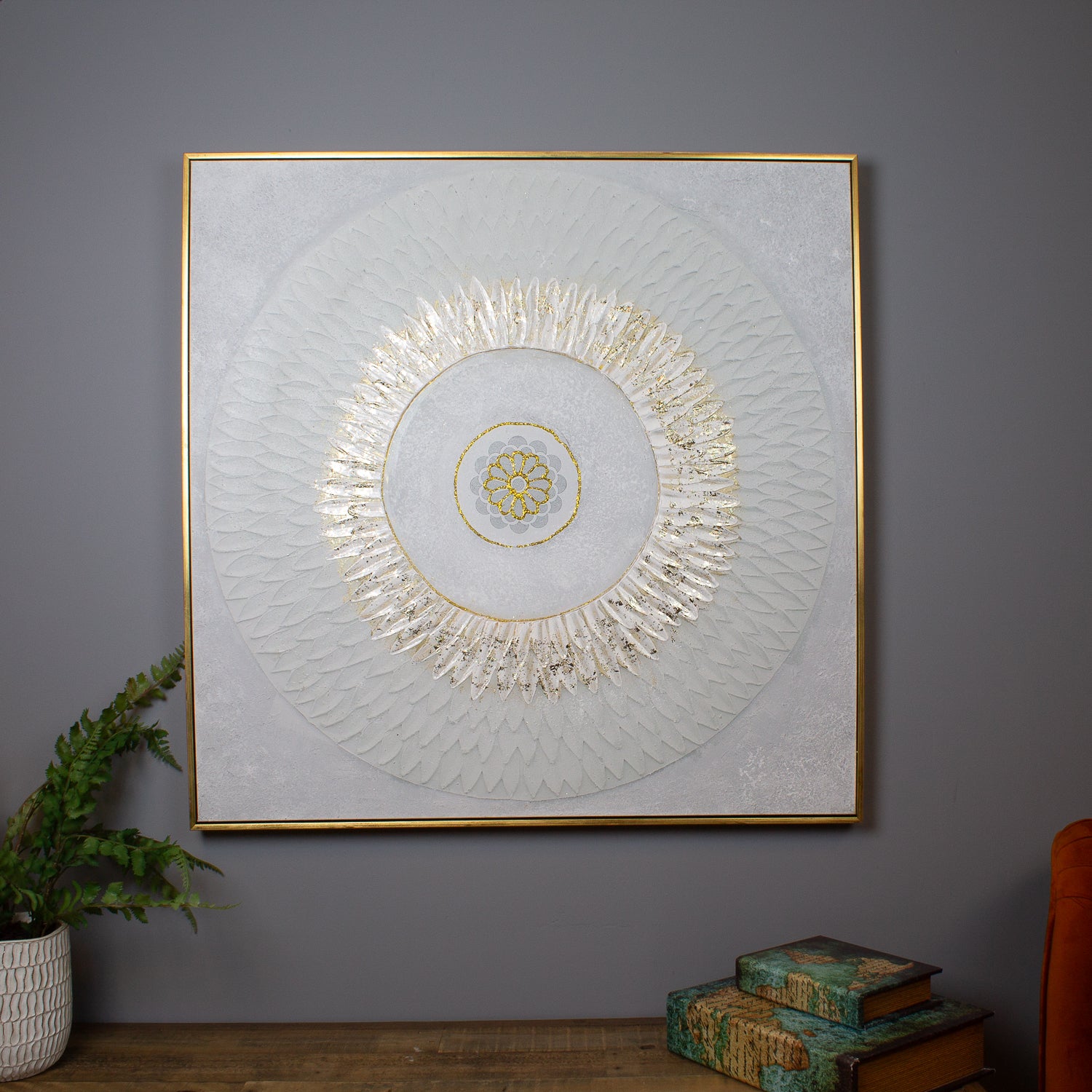 Featuring a captivating geometric composition, this piece is carefully painted and texturised, adding depth and dimension to your walls. Metallic embellishments catch the light beautifully, creating a sense of luxury and refinement. Inset into a sleek gold-coloured frame, this artwork offers a perfect balance of contemporary elegance and timeless appealβideal for any living area, bedroom, or stylish interior.