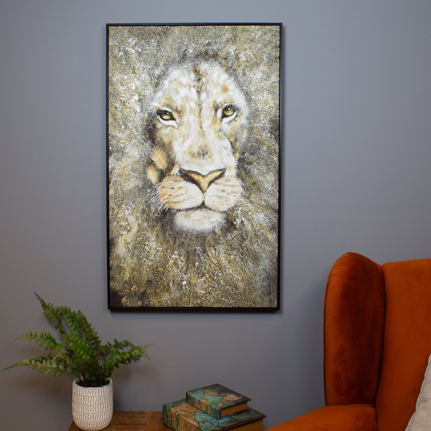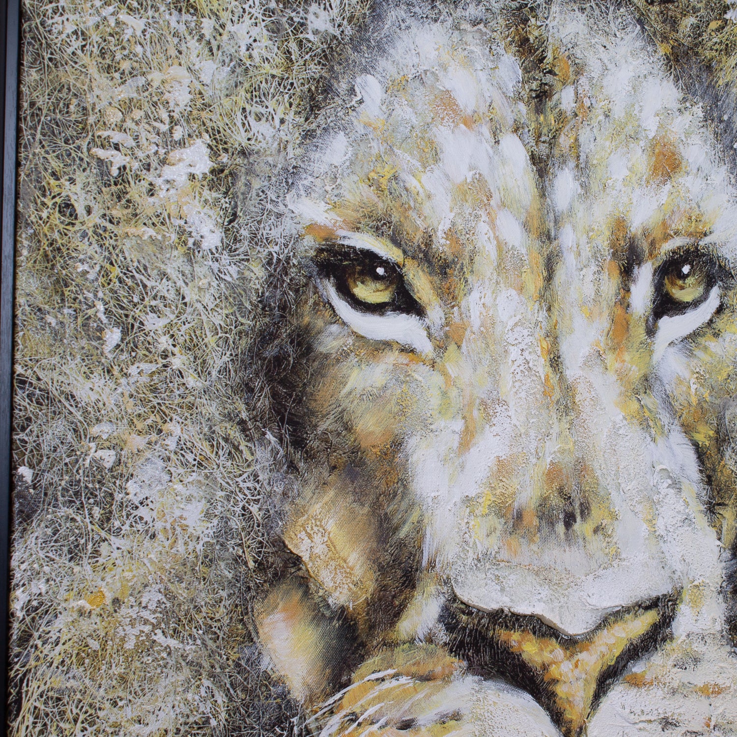 This hand-finished oil painting features a richly textured 3D mane, adding an extraordinary sense of movement and realism. The striking lion’s expression captures its raw power and noble presence, making it a must-have statement piece for any interior seeking bold elegance.
