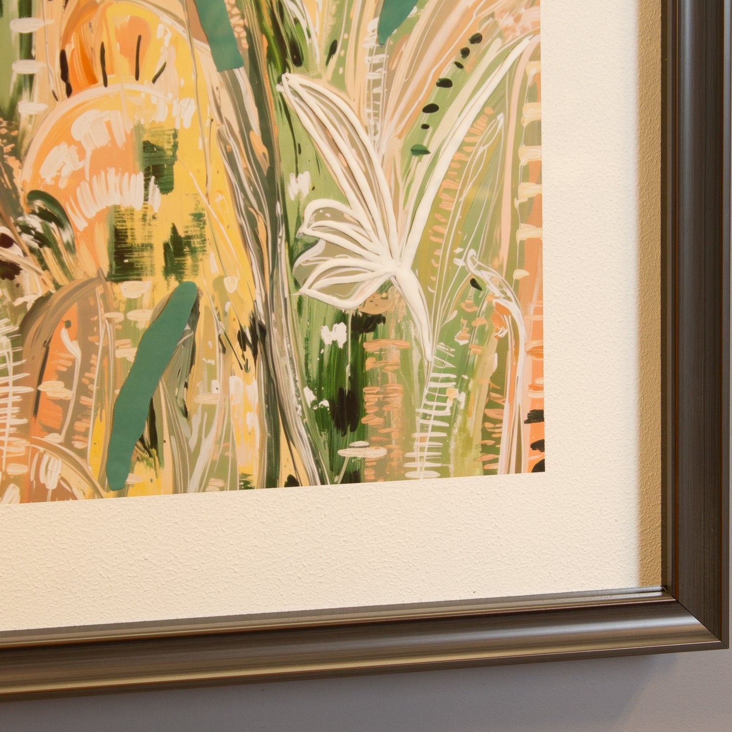 Framed behind glass in a chunky moulded charcoal grey frame and beautifully mounted, this striking piece blends sophistication with natural vibrancy. Complement your décor by displaying it alone for an elegant statement, or pair it with the complimentary Tropical Illusion No. 2 Art Print for a cohesive, tropical-inspired duo.