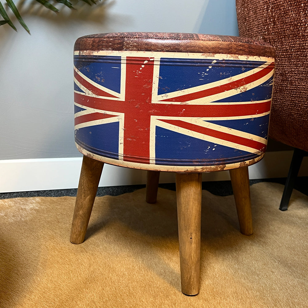 Introducing the Union Jack Stool - a unique and stylish addition to your home! With its vintage look and faux leather top featuring the iconic union jack print, this three legged stool will add a touch of British charm to any room. Sit comfortably and add a pop of patriotism to your décor.
