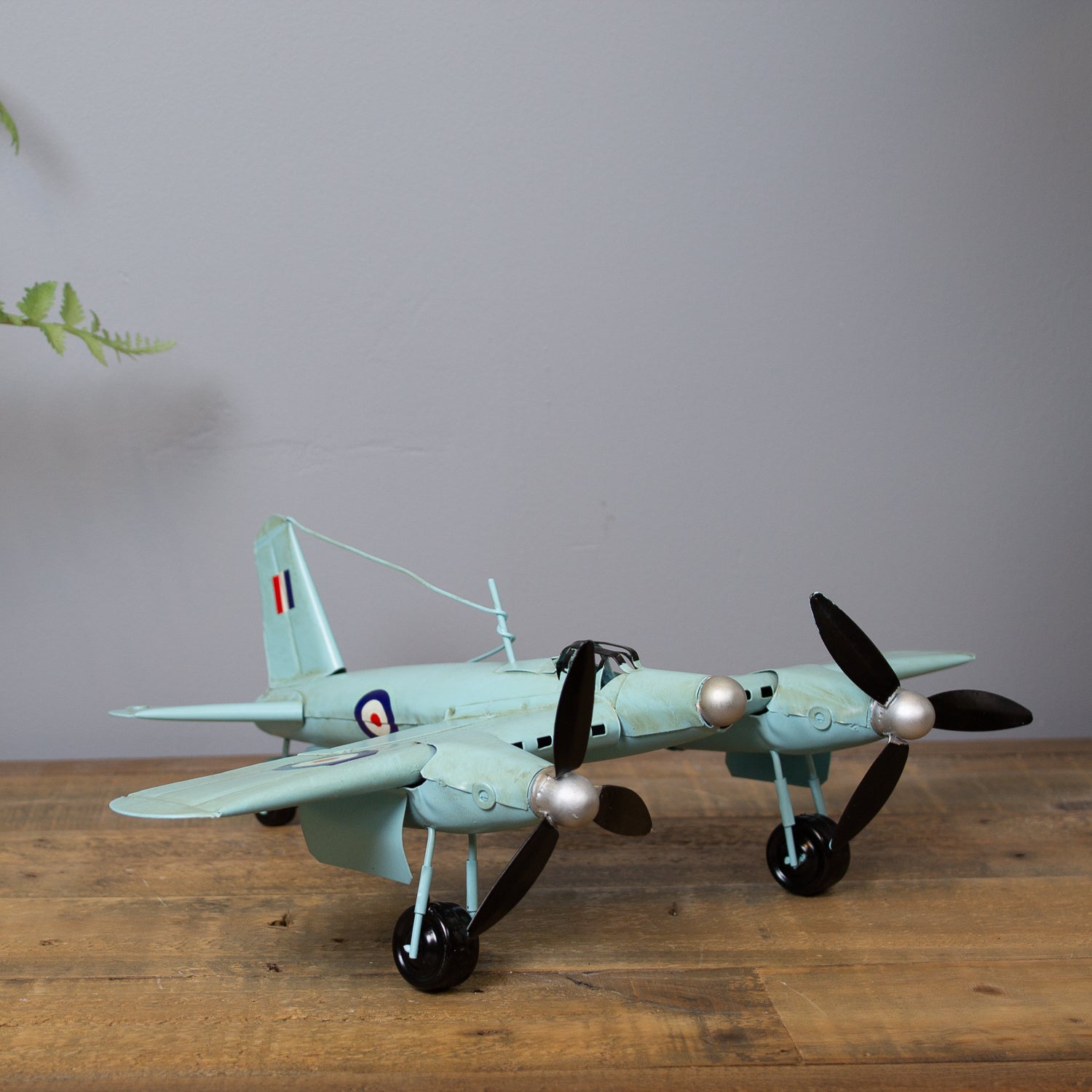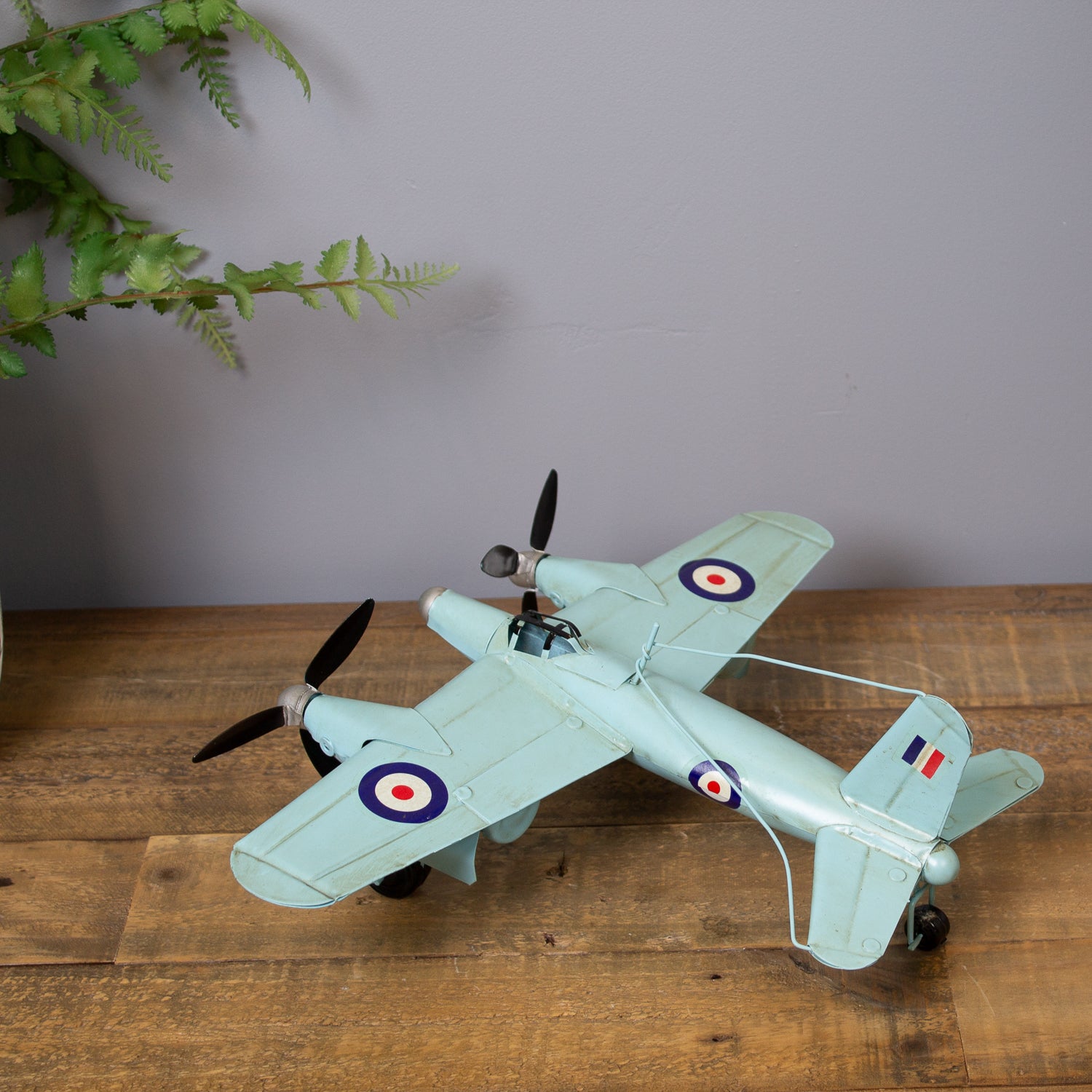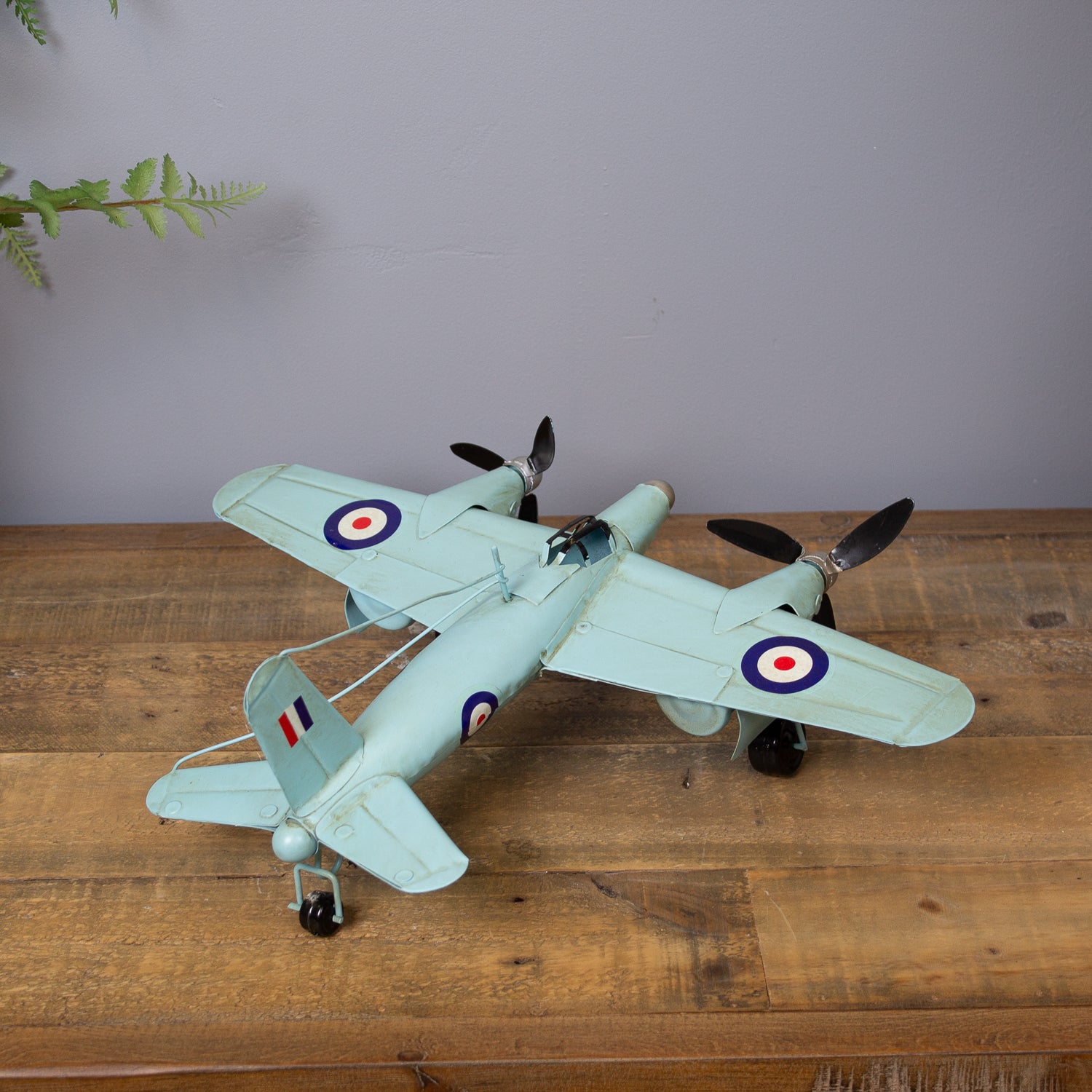Finished in a soft, powdery blue with RAF-style roundels on the wings and tail, this twin-prop aircraft captures the essence of classic flight. With a weathered, slightly rustic look that nods to wartime engineering and hand-built craftsmanship, it's a piece designed to spark conversation and admiration.
