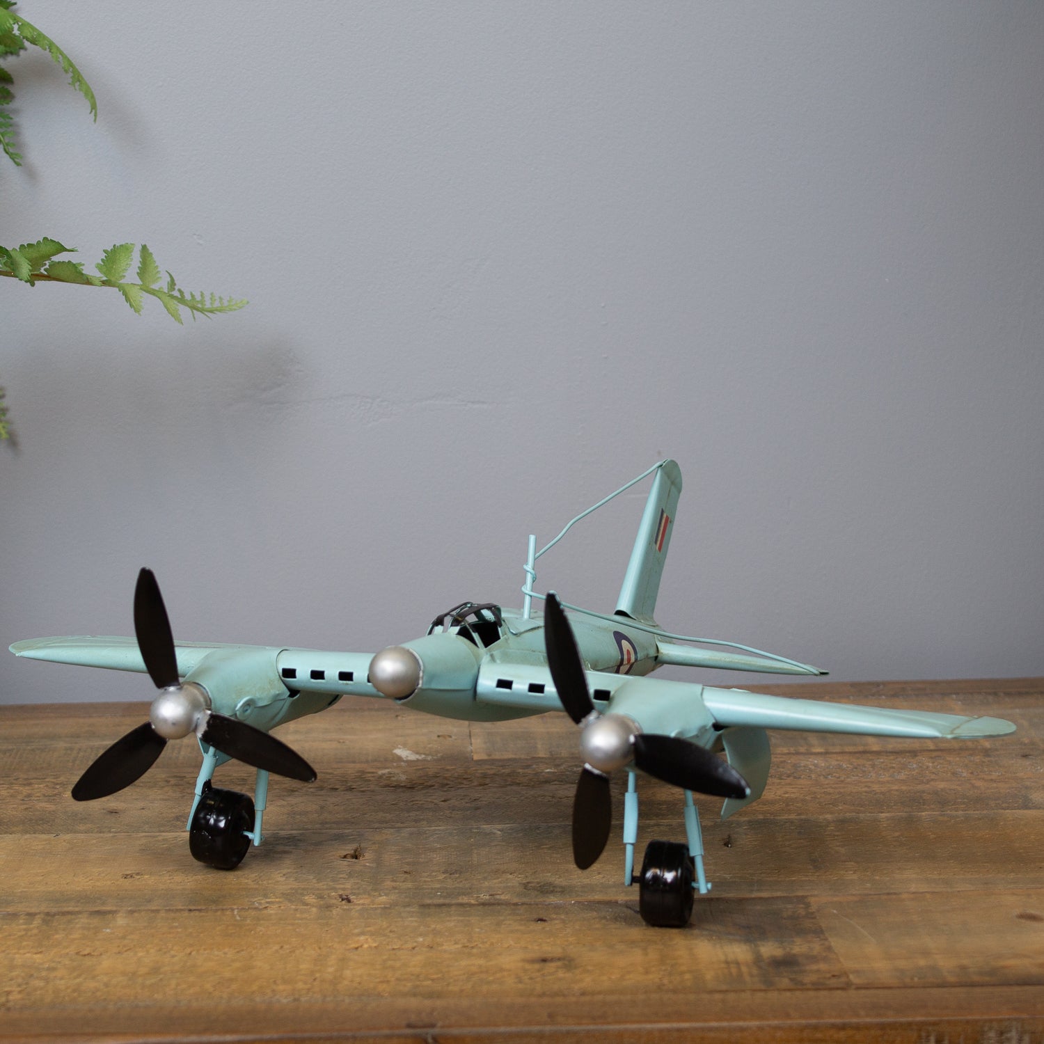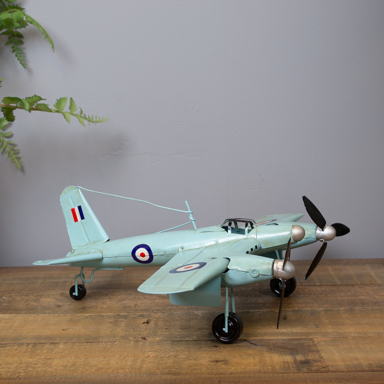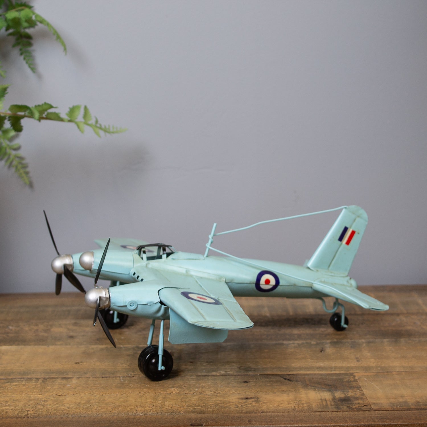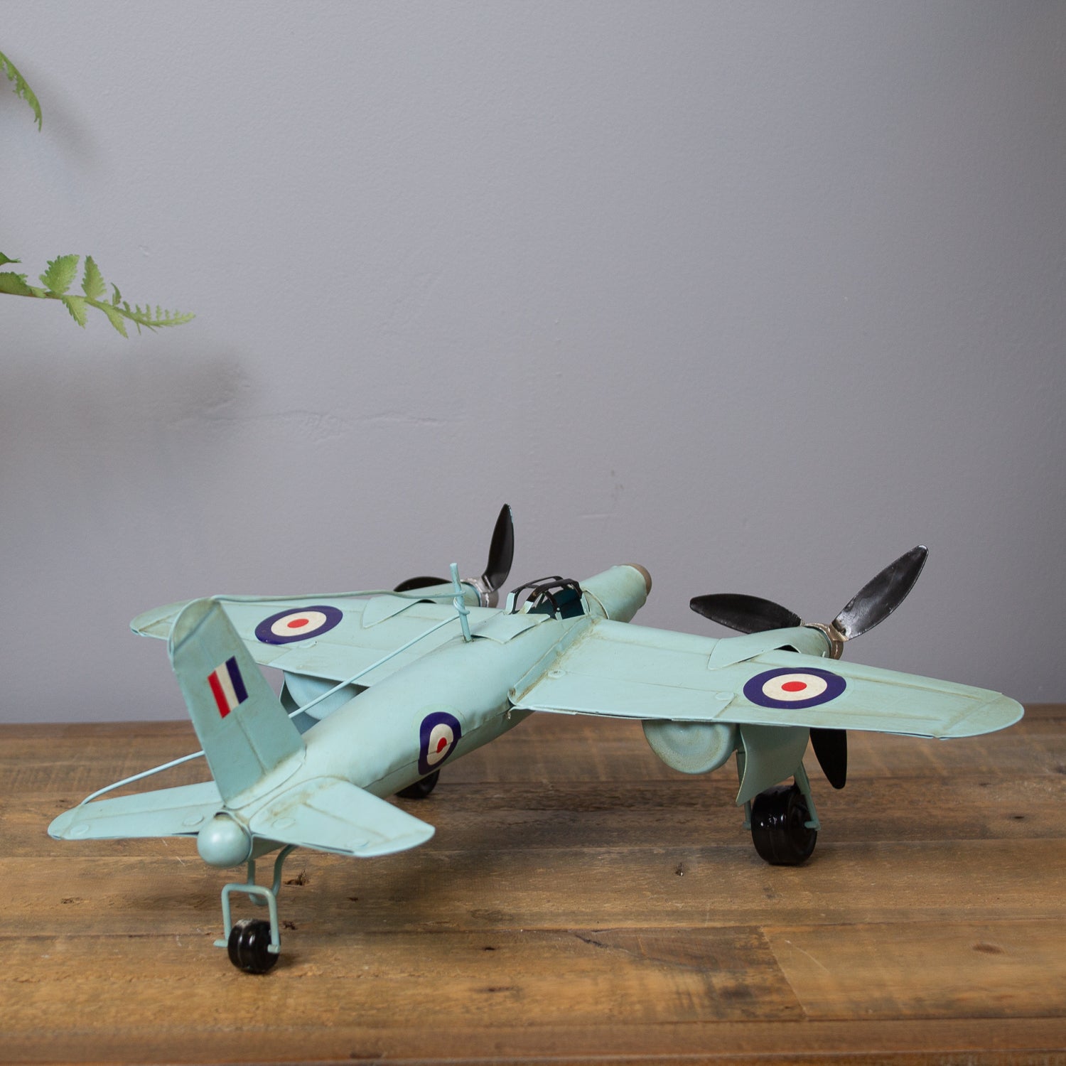 Finished in a soft, powdery blue with RAF-style roundels on the wings and tail, this twin-prop aircraft captures the essence of classic flight. With a weathered, slightly rustic look that nods to wartime engineering and hand-built craftsmanship, it's a piece designed to spark conversation and admiration.
