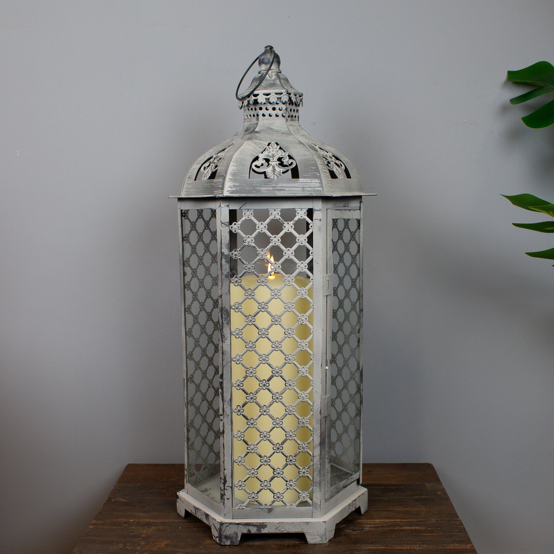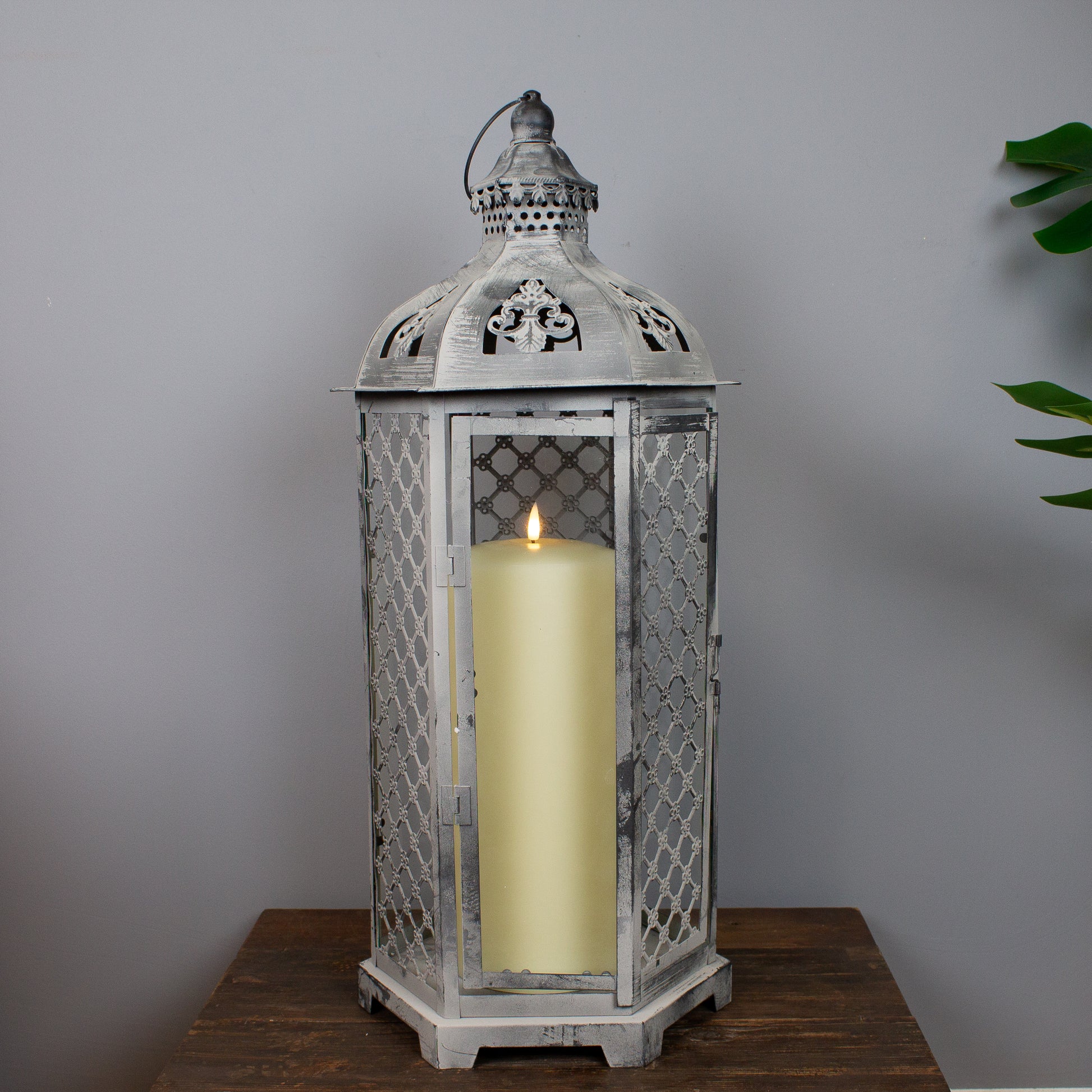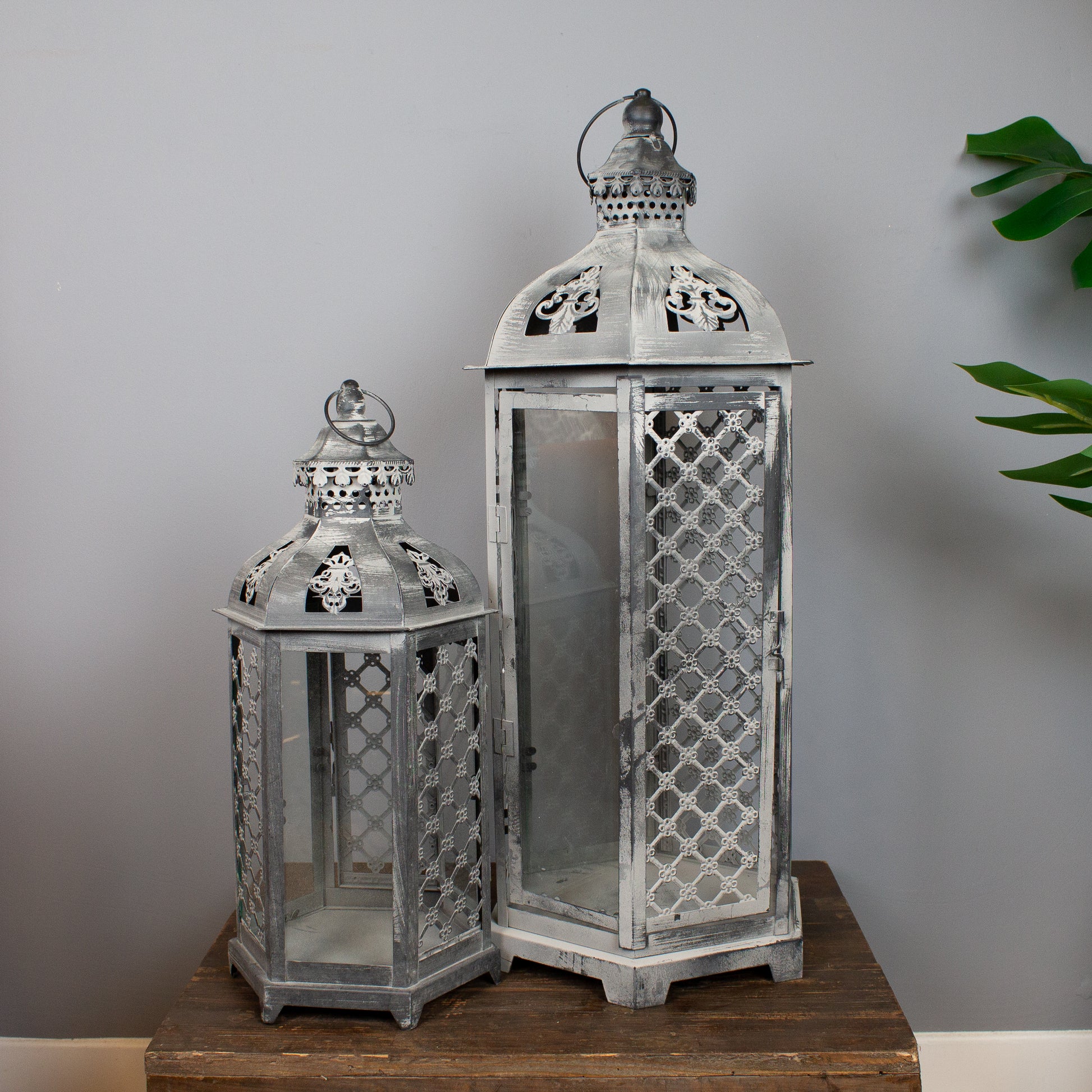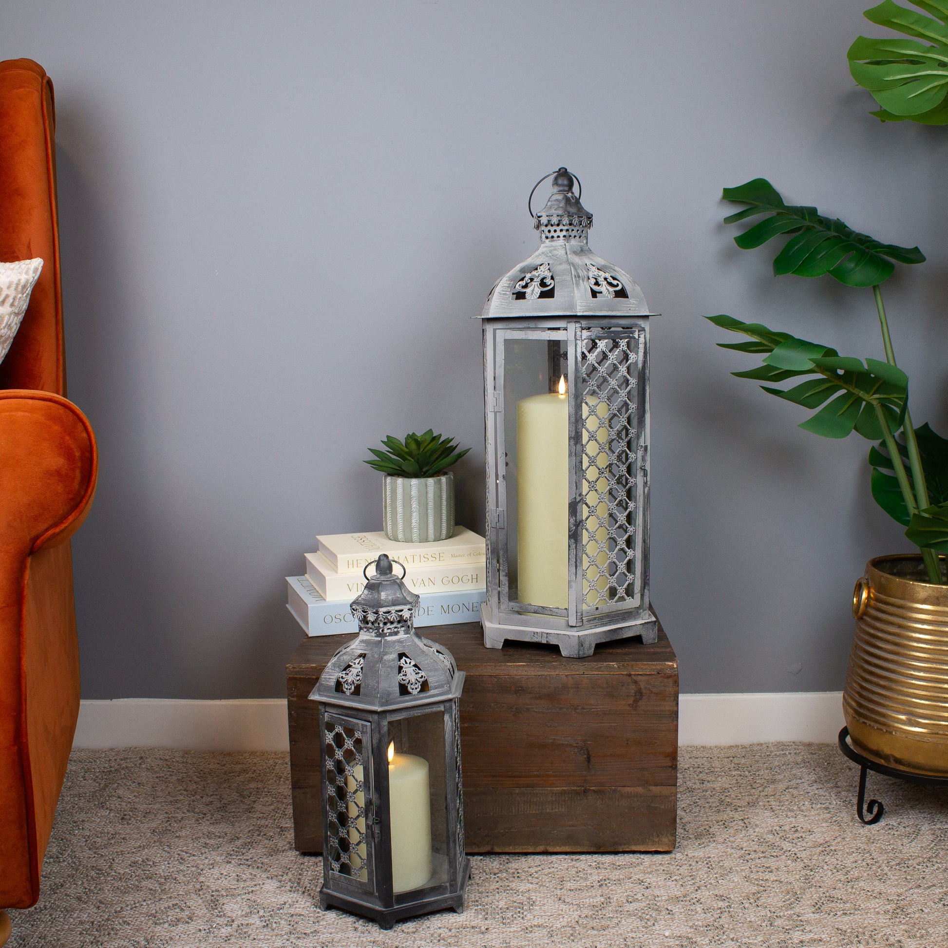 This lantern set brings ornate detailing and generous height into candle styling. Finished in a weather-worn, washed out black, each lantern features a tall hexagonal form with criss-cross patterning across every glass panel, allowing candlelight to glow through in a richly textured way. A domed top crowned with a decorative finial completes the look, giving the set its distinctive Moroccan-inspired character.