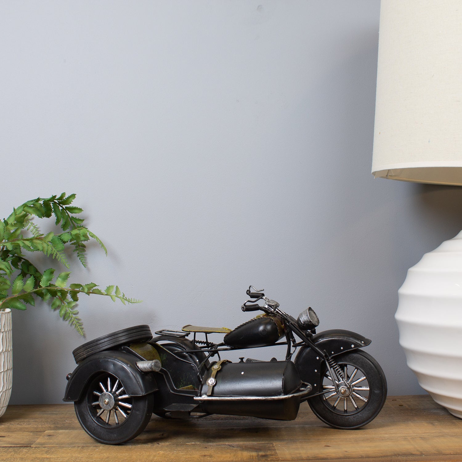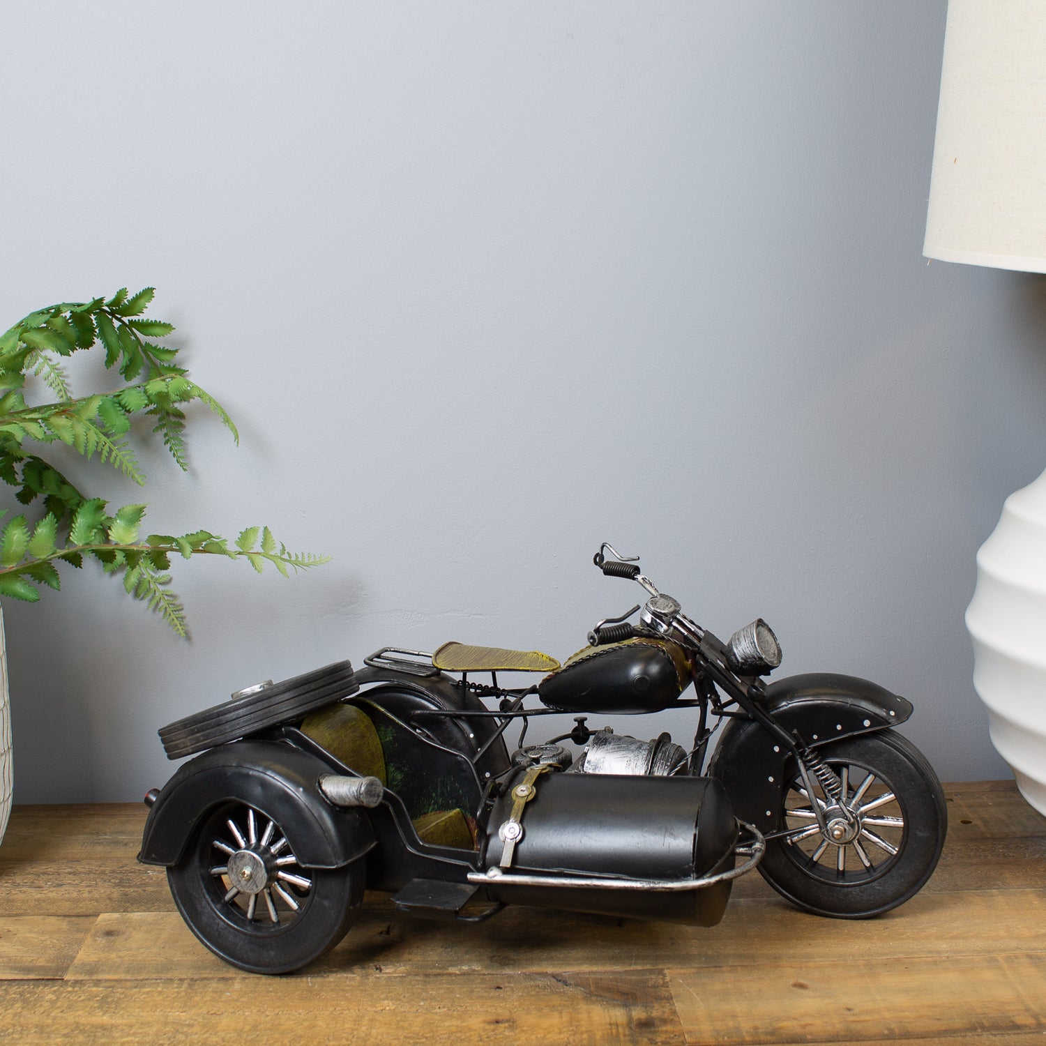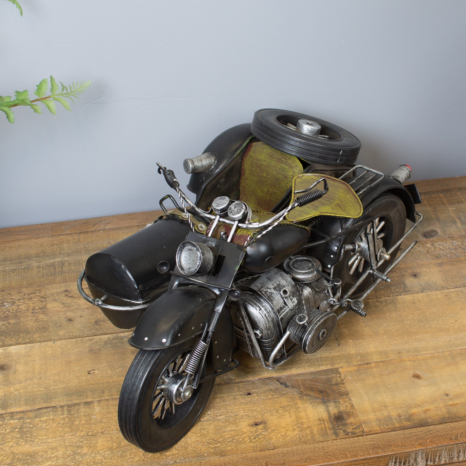 Add a touch of old-school adventure to your space with this striking black motorcycle and sidecar replica, lovingly crafted in hand-finished metal with a rustic, weather-beaten finish that tells its own story.