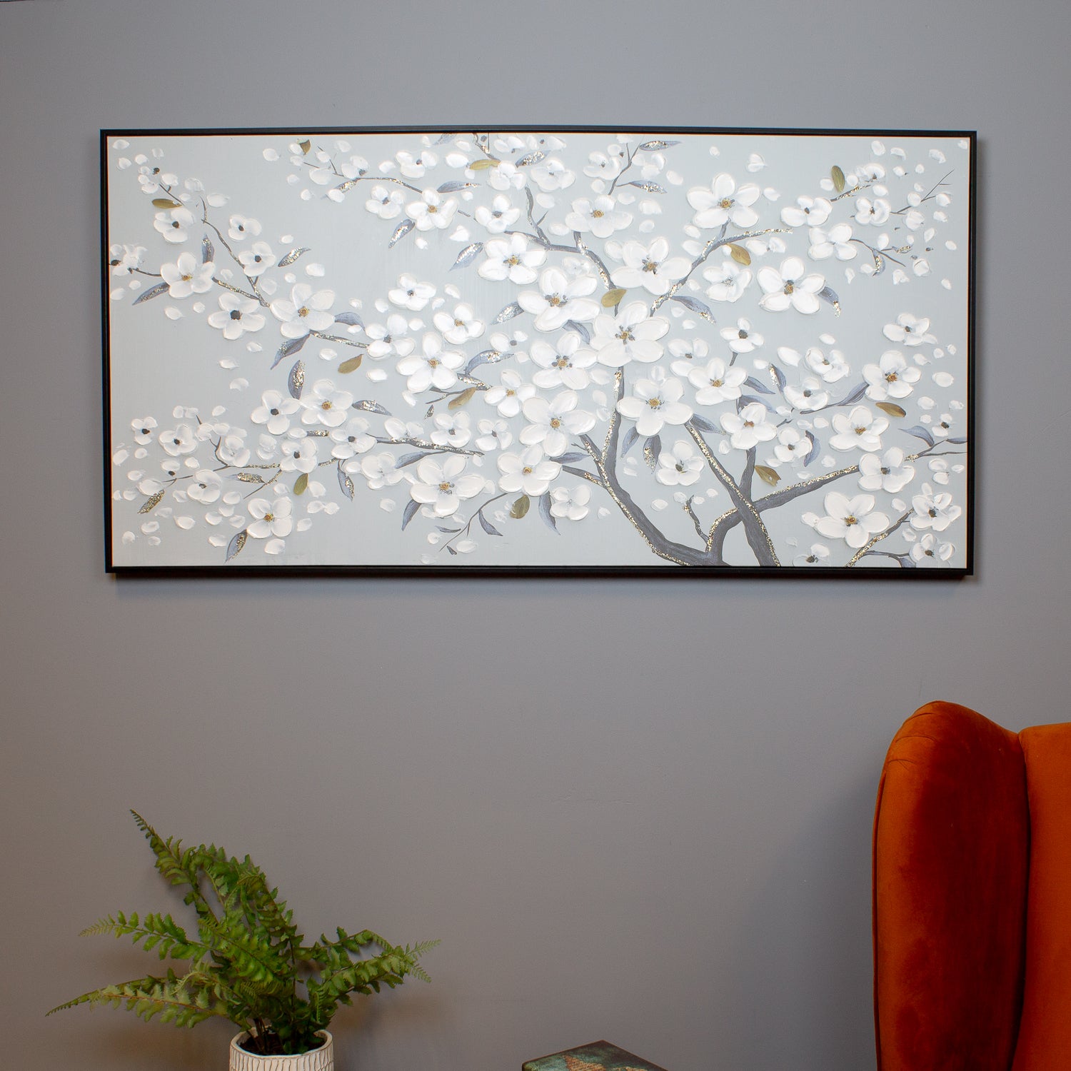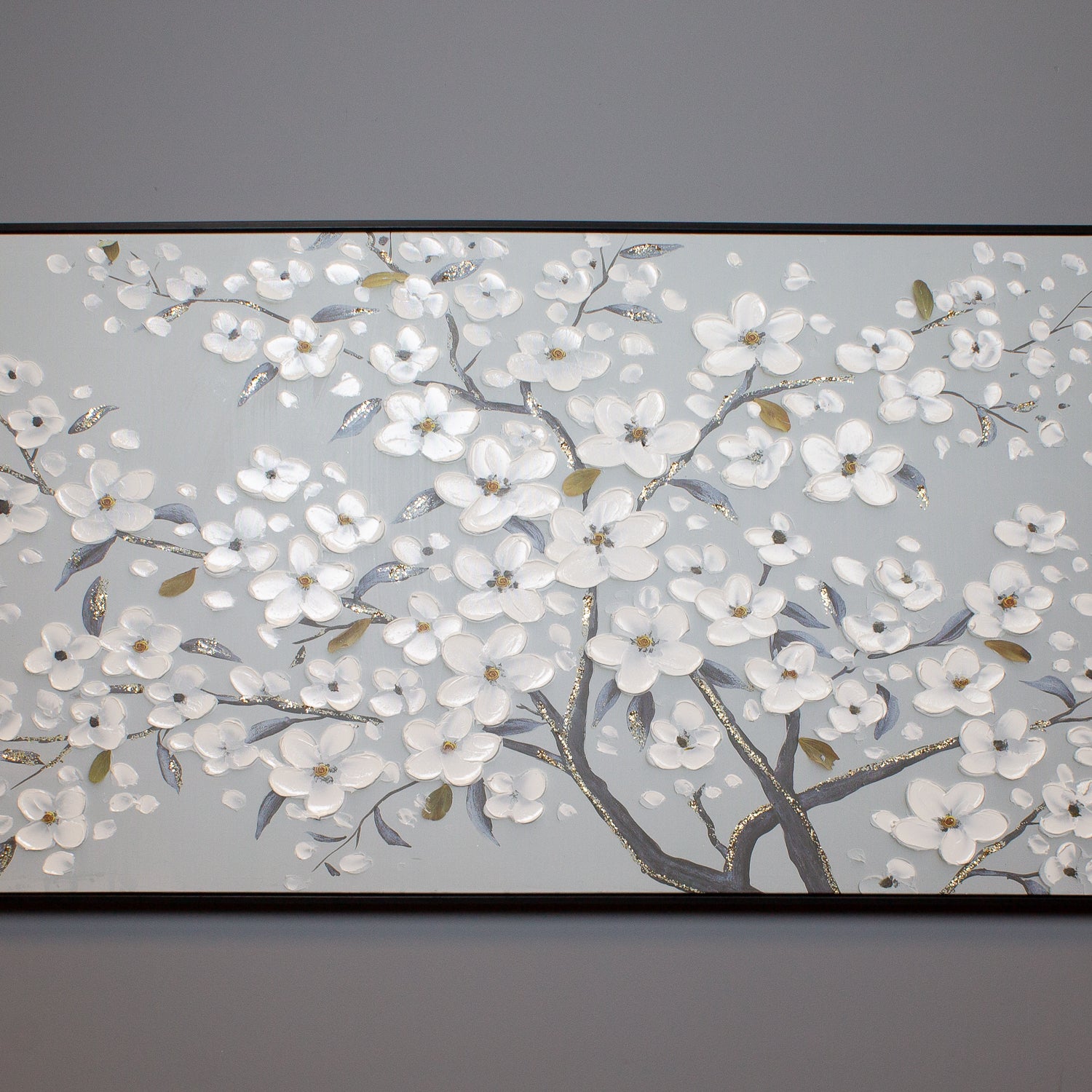 Expertly hand-finished, this piece showcases soft, elegant cherry blossoms in full bloom, evoking a sense of calm and renewal. The textured detailing adds depth, enhancing the artwork’s serene presence. Inset into a sleek black frame and measuring 122 cm x 62 cm, this painting offers a sophisticated contrast, making it a timeless statement for any space.