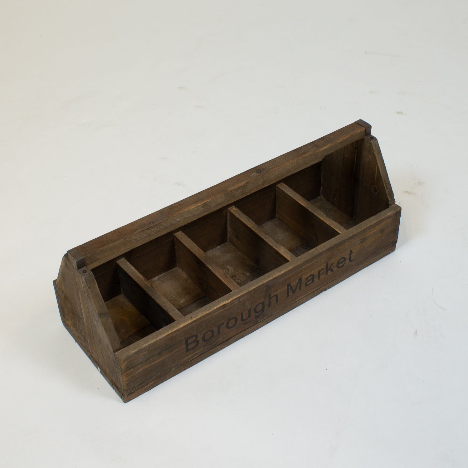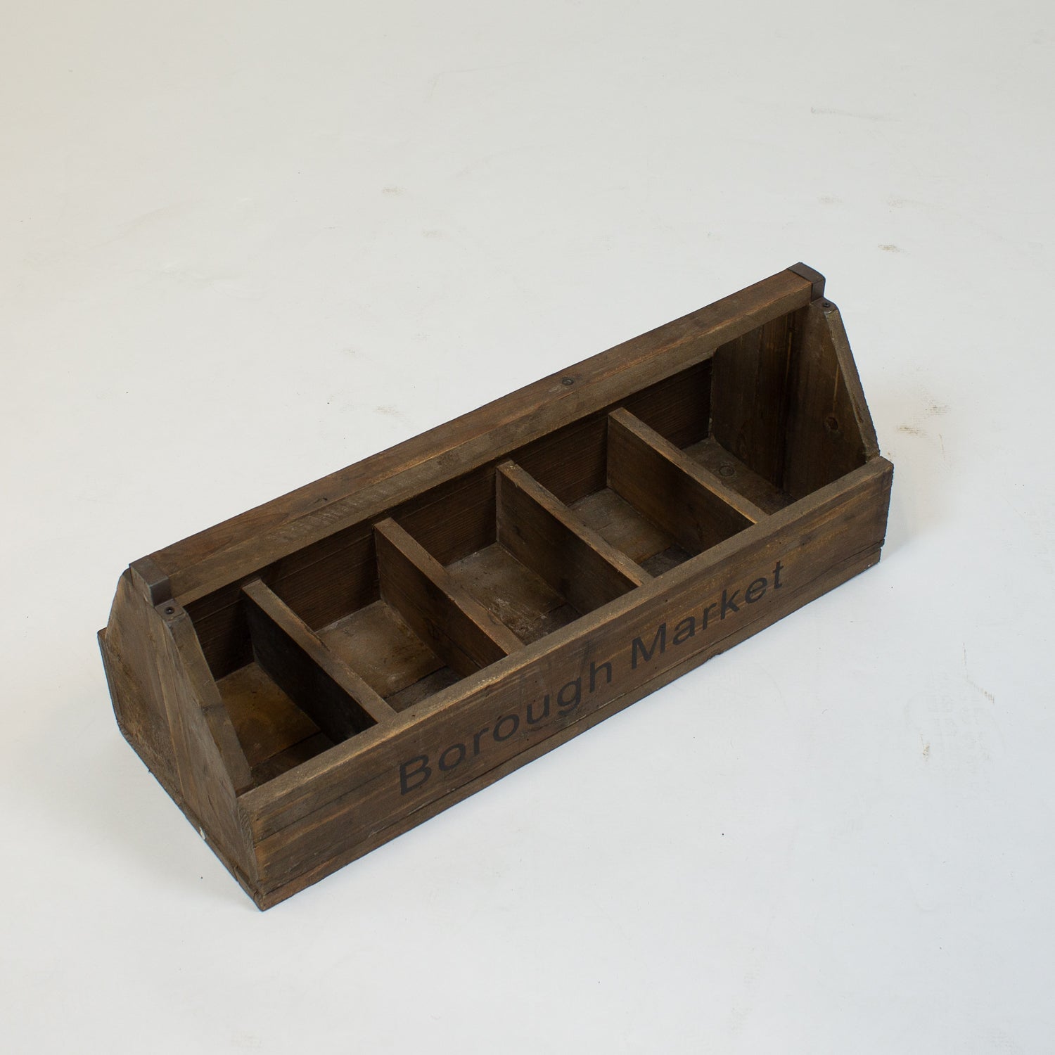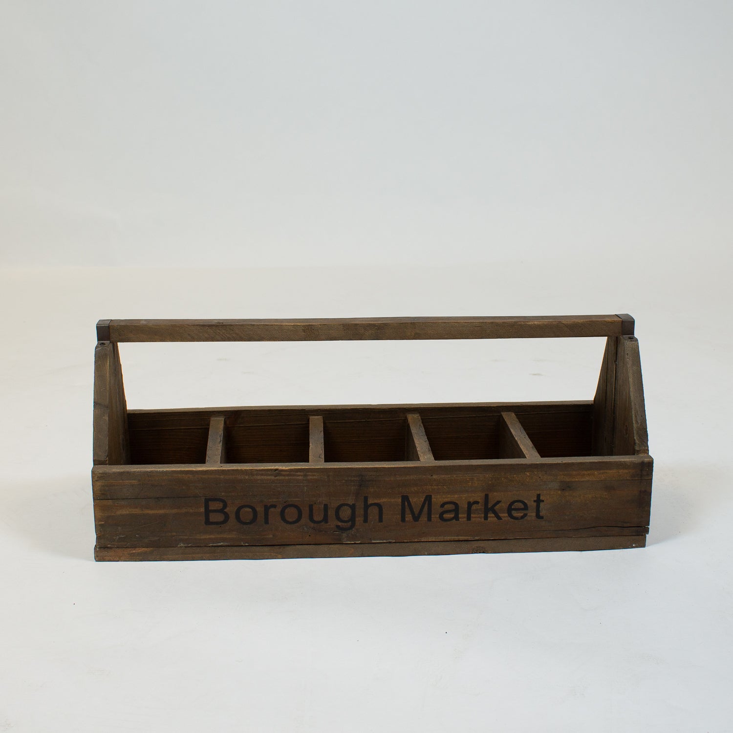 Crafted from solid wood with a sturdy central handle, this long, narrow carrier features five separate compartments, making it ideal for bottles, cutlery, tools, craft supplies—or even a display of dried flowers.
