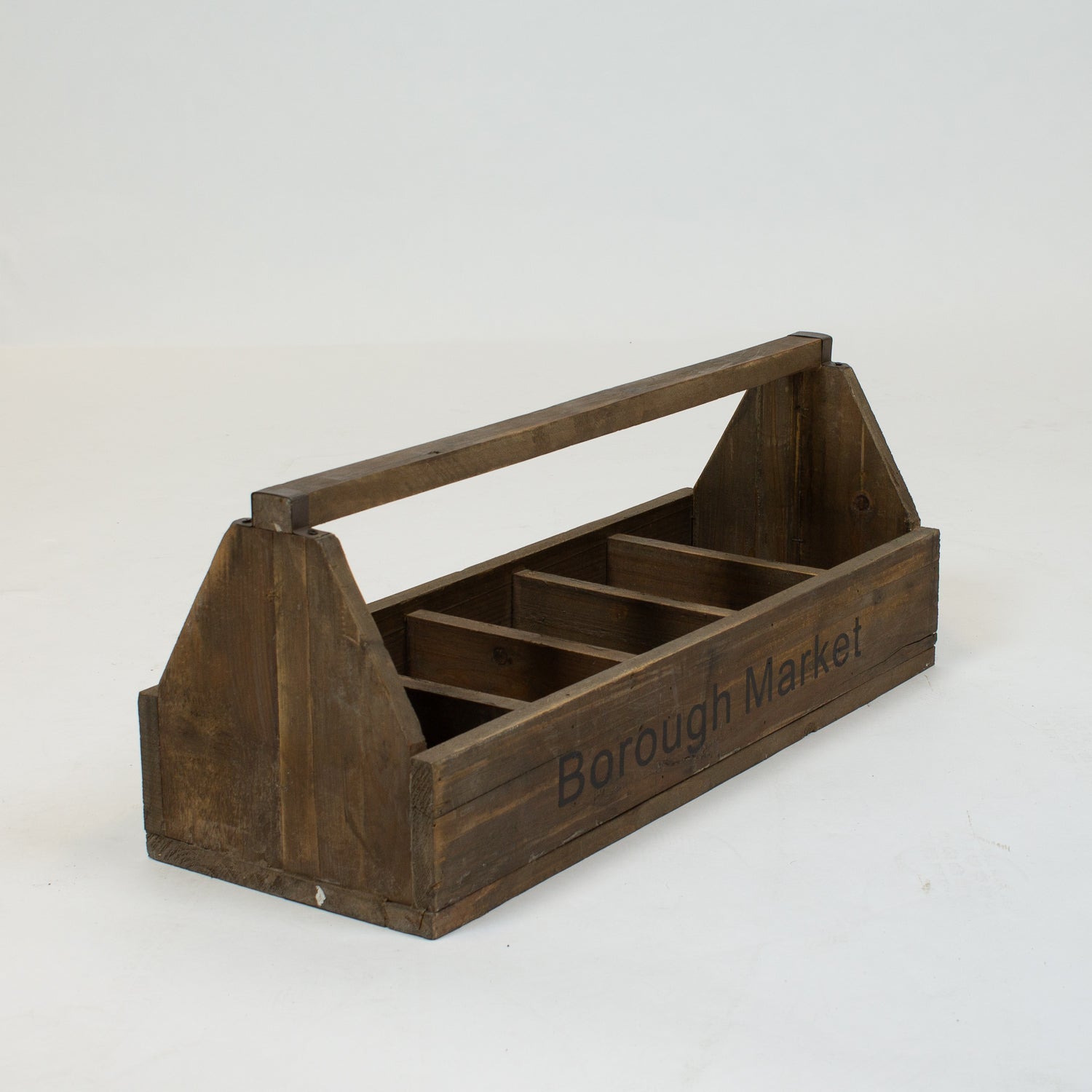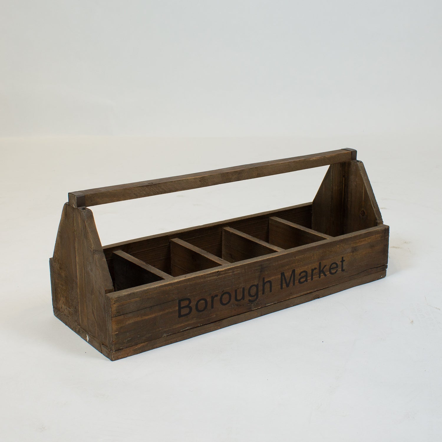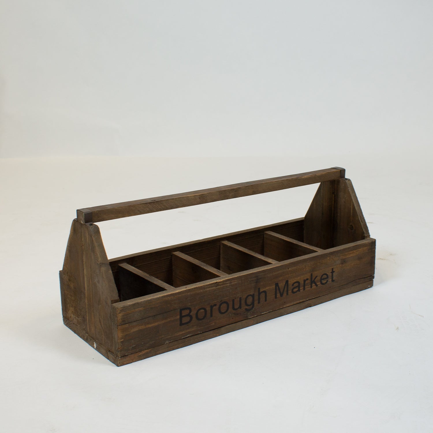 Crafted from solid wood with a sturdy central handle, this long, narrow carrier features five separate compartments, making it ideal for bottles, cutlery, tools, craft supplies—or even a display of dried flowers.